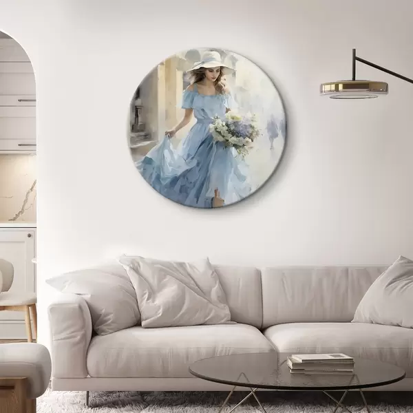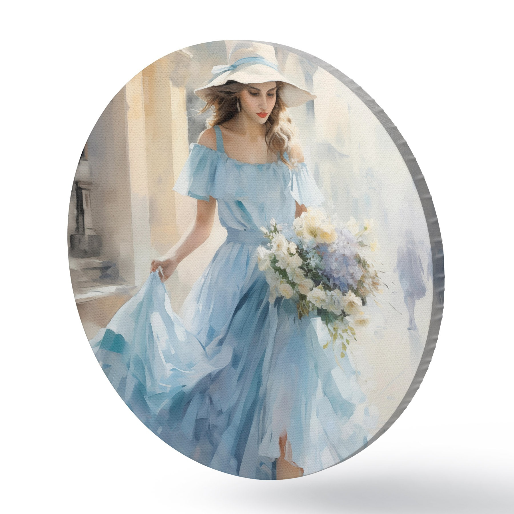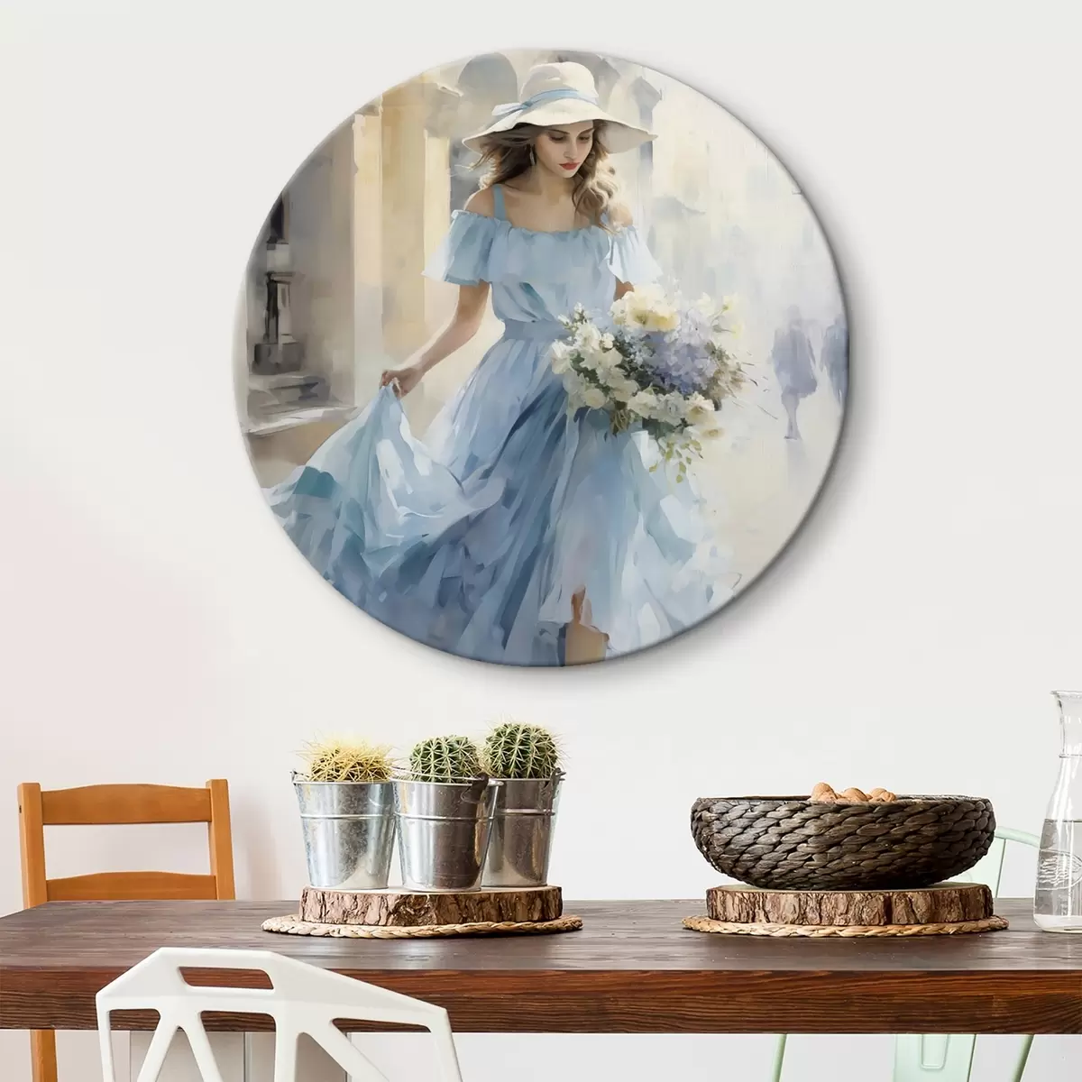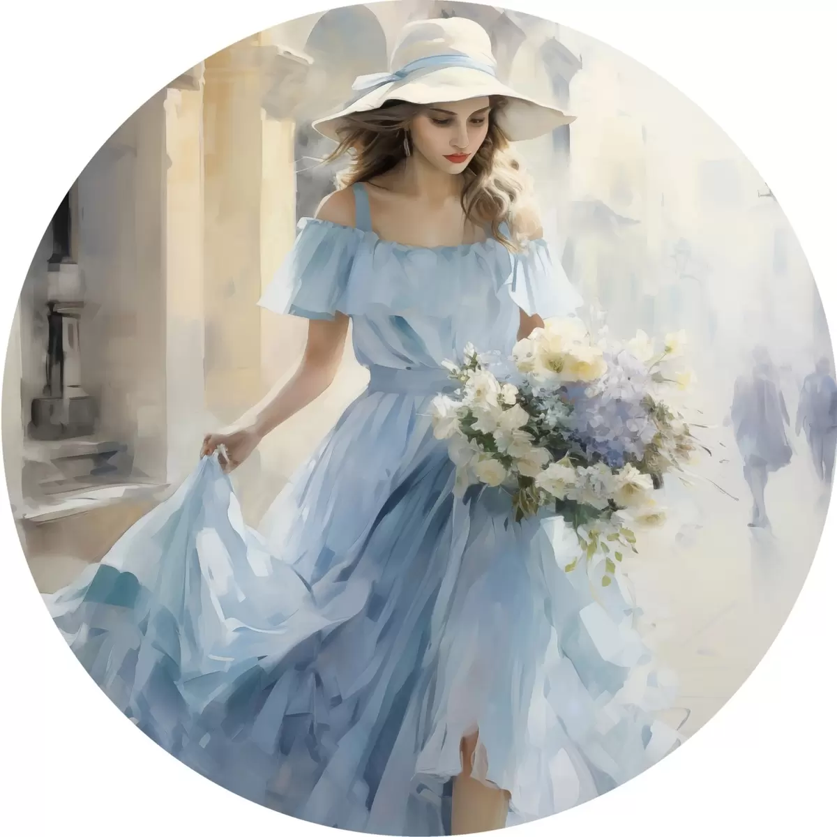 Runde Gemälde Ein elegantes Mädchen in einem hellblauen Kleid und Hut schlendert mit einem Blumenstrauß in der Hand durch die Stadt, in einer leichten und romantischen Stimmung. r42580