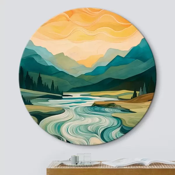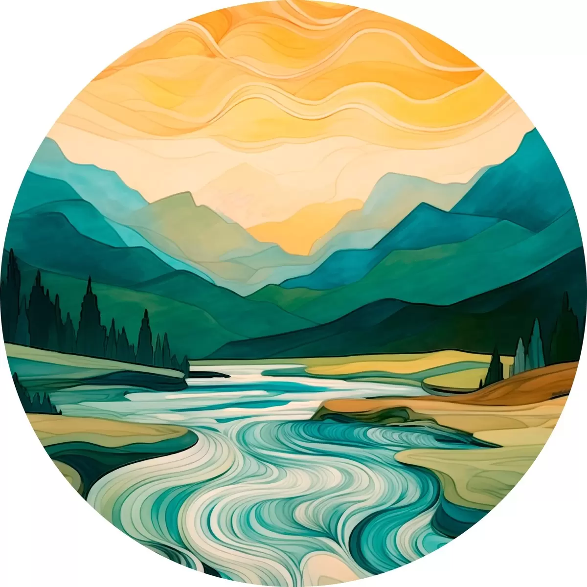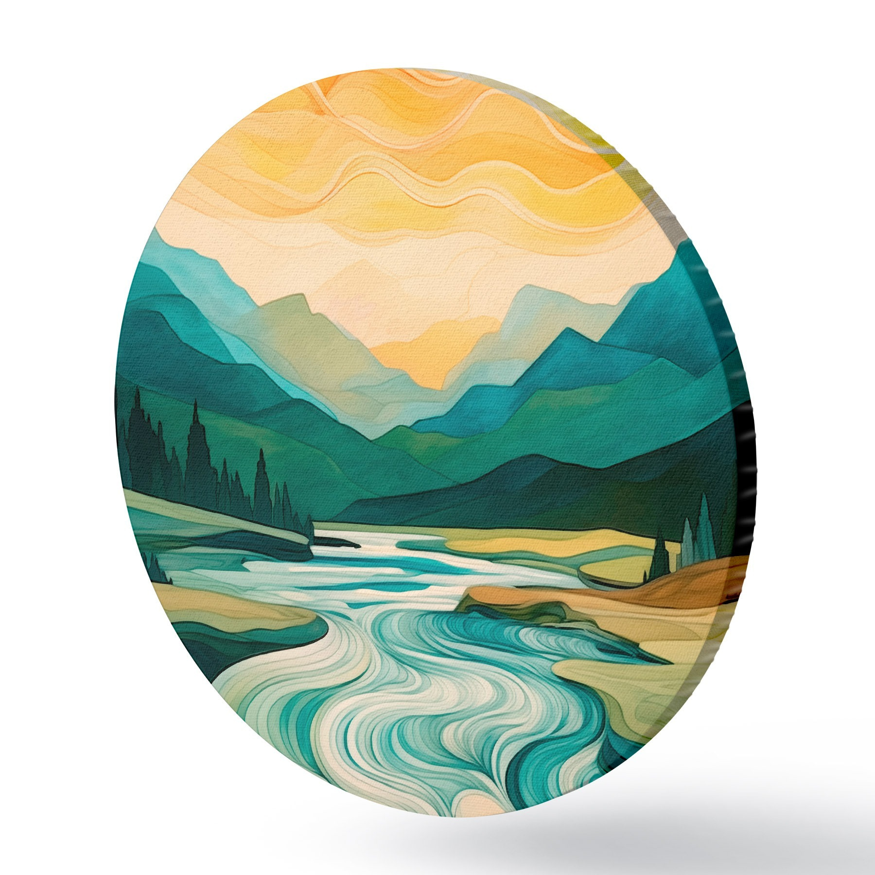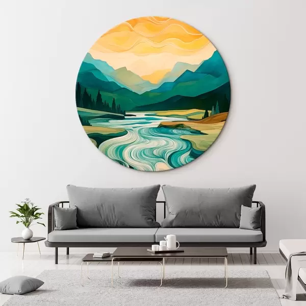 Runde Gemälde Landschaft mit Fluss in abstraktem Stil r42652