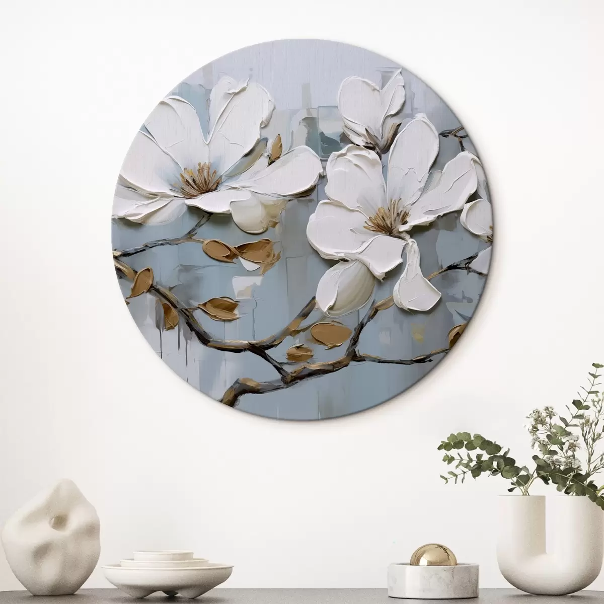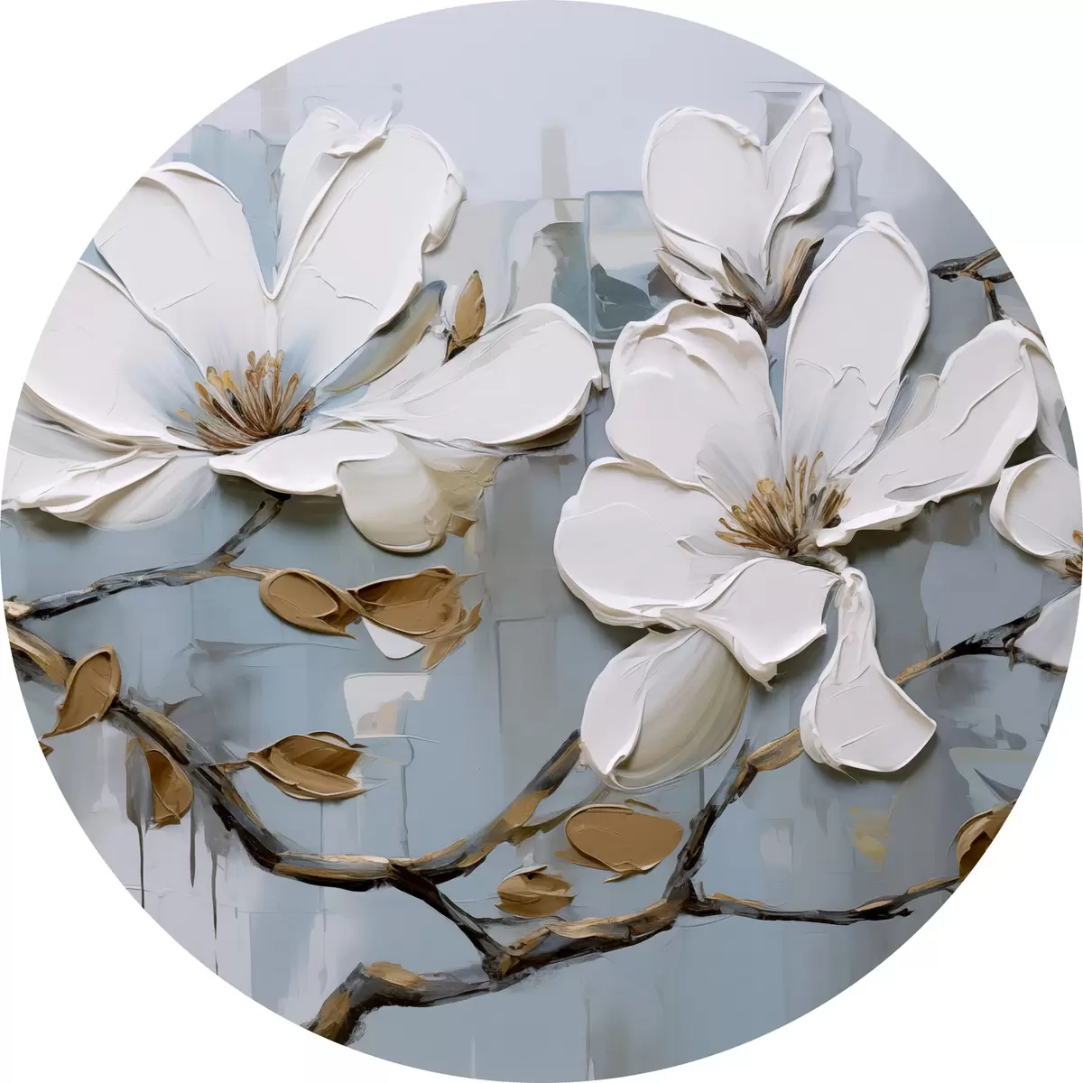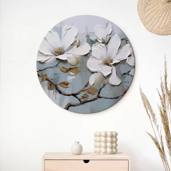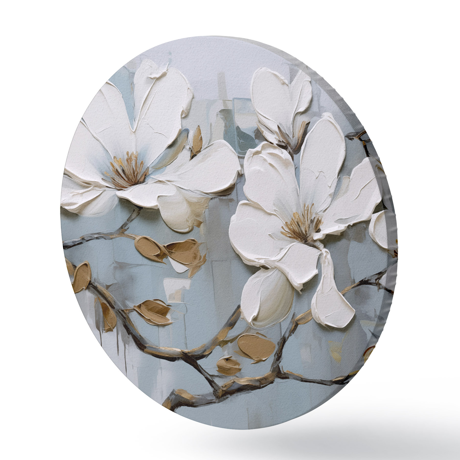 Runde Gemälde Weiße Magnolienblüten mit strukturierten Blütenblättern und braunen Blättern auf einem weichen blauen Hintergrund Ölgemälde Imitation r42711