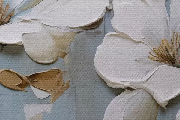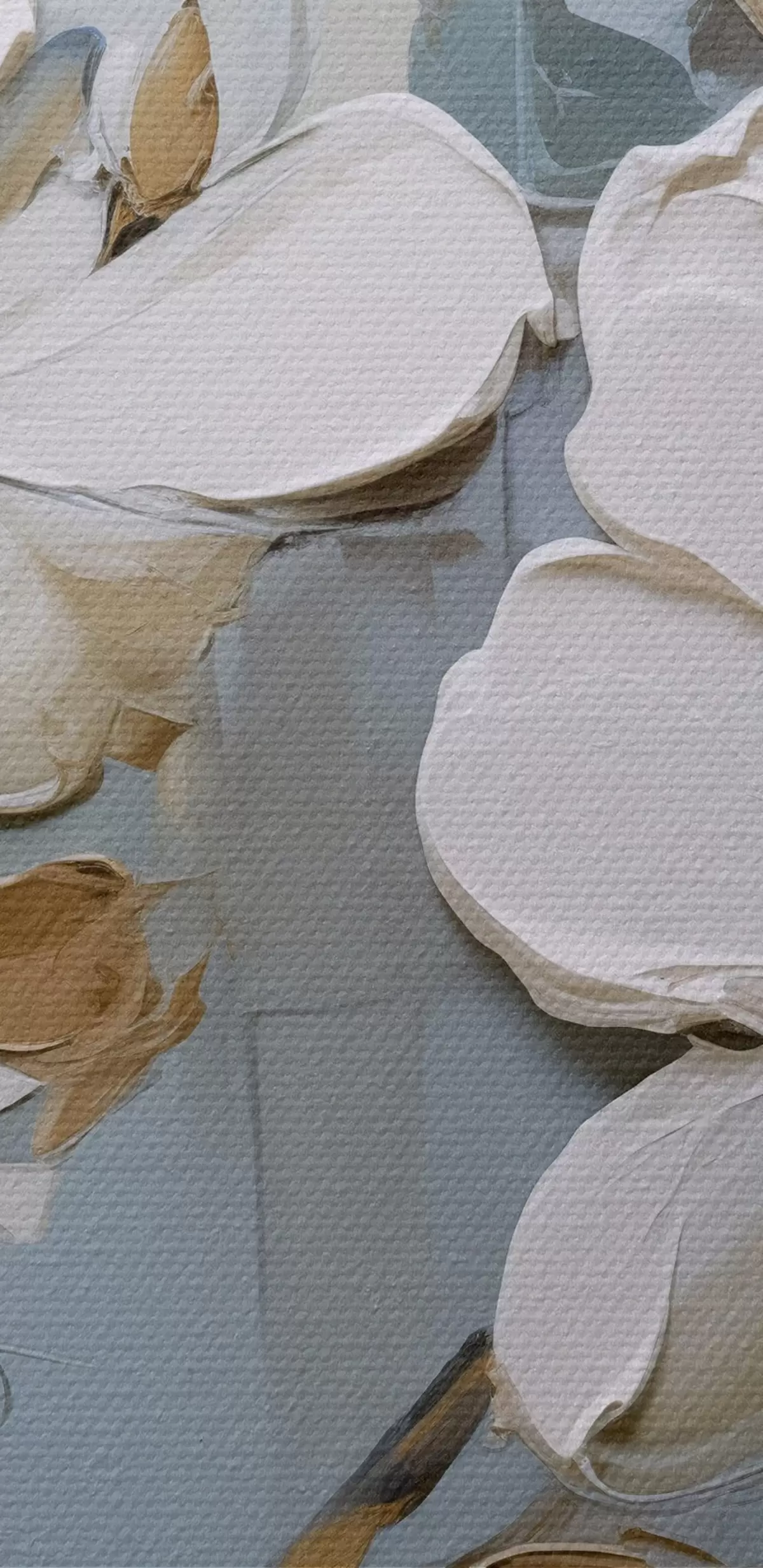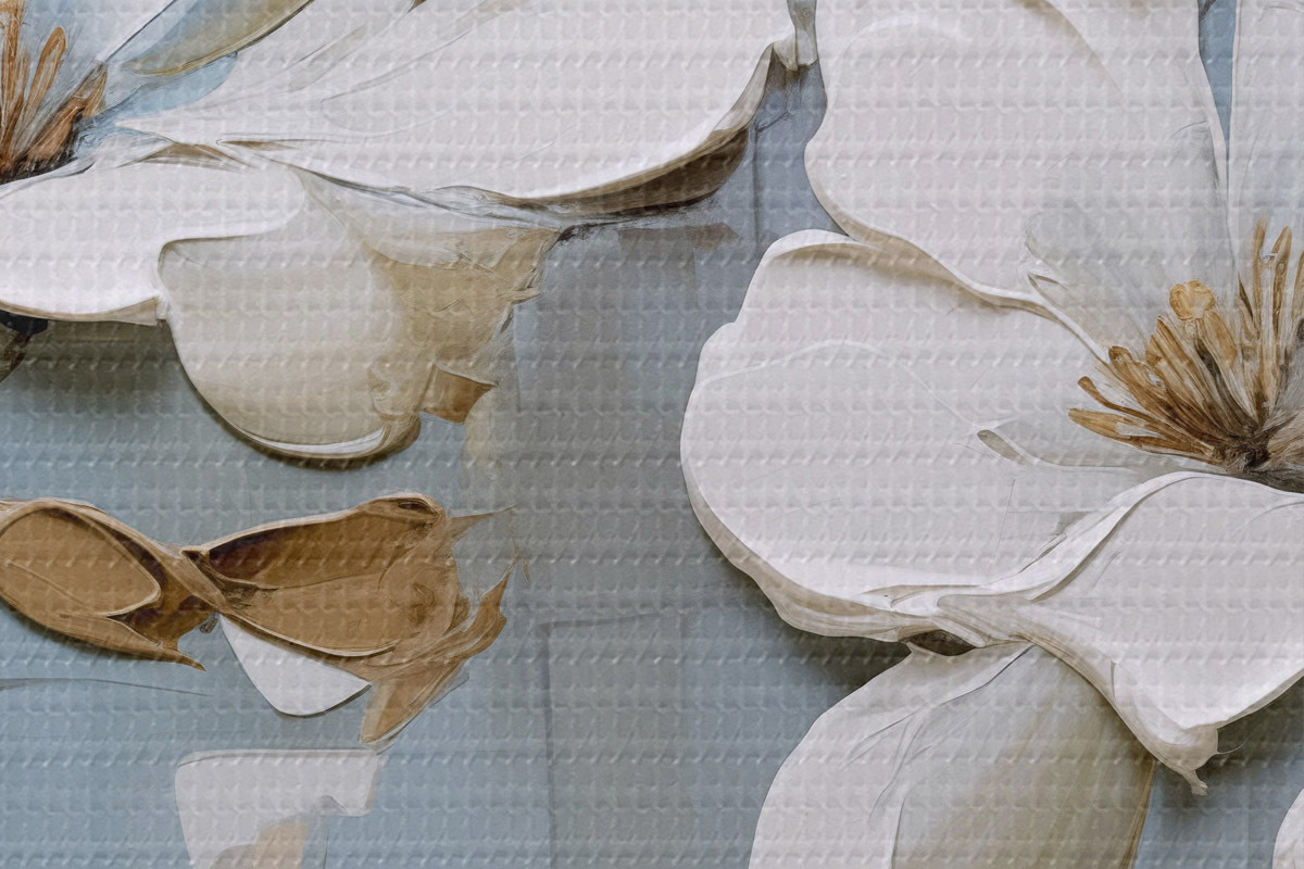 Bild Weiße Magnolienblüten mit strukturierten Blütenblättern und braunen Blättern auf einem weichen blauen Hintergrund Ölgemälde Imitation Nr r42711