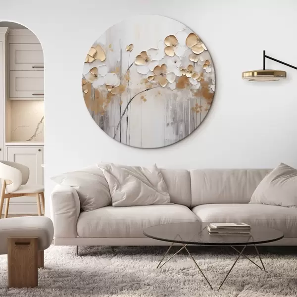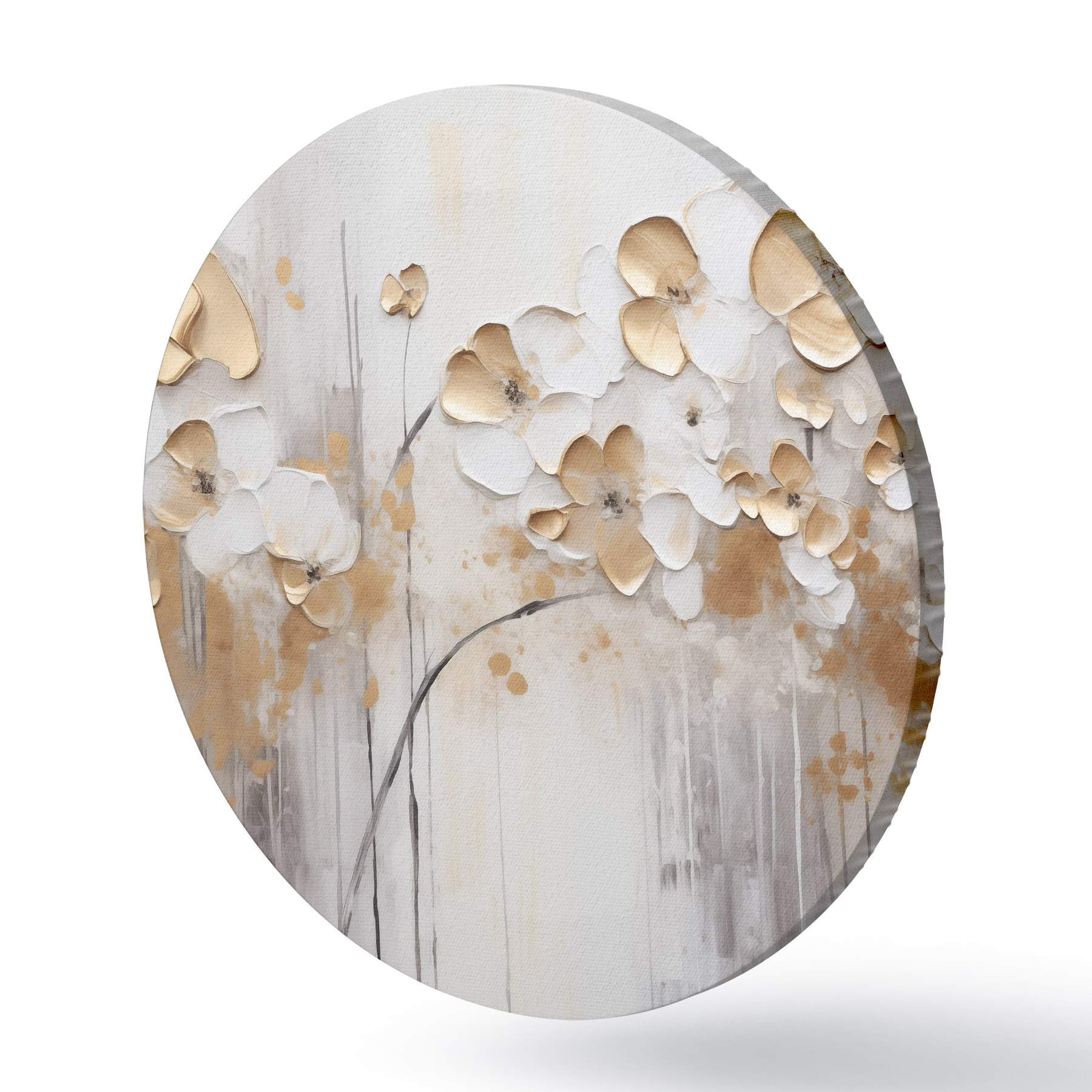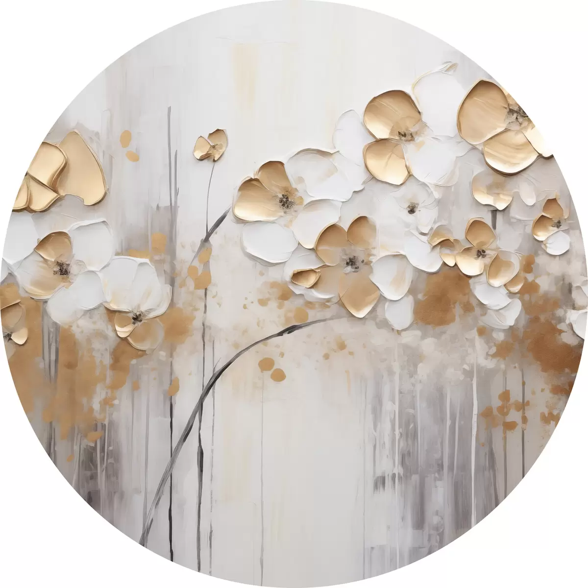 Runde Gemälde Blumen mit strukturierten Blütenblättern auf einem weichen, gedämpften Hintergrund mit abstrakten Farbspritzern und vertikalen Linien r42713