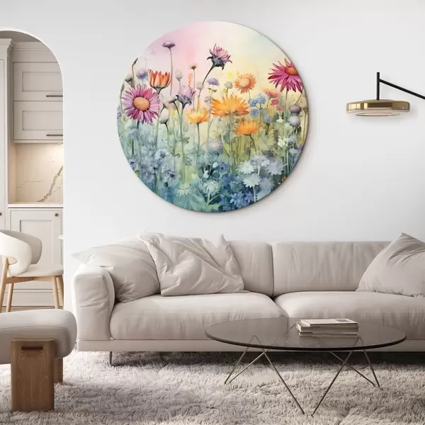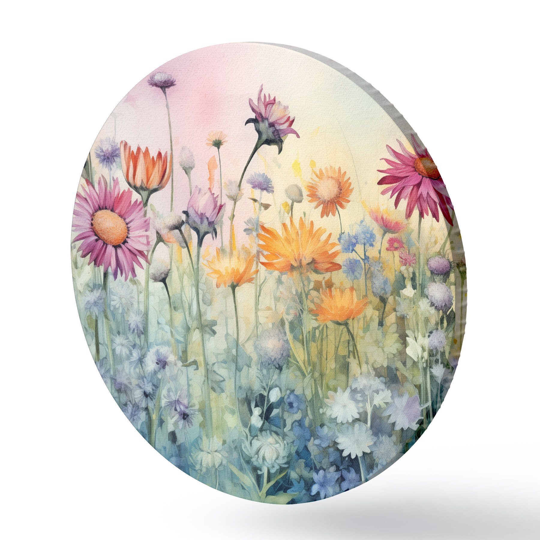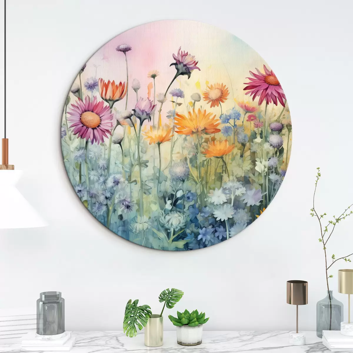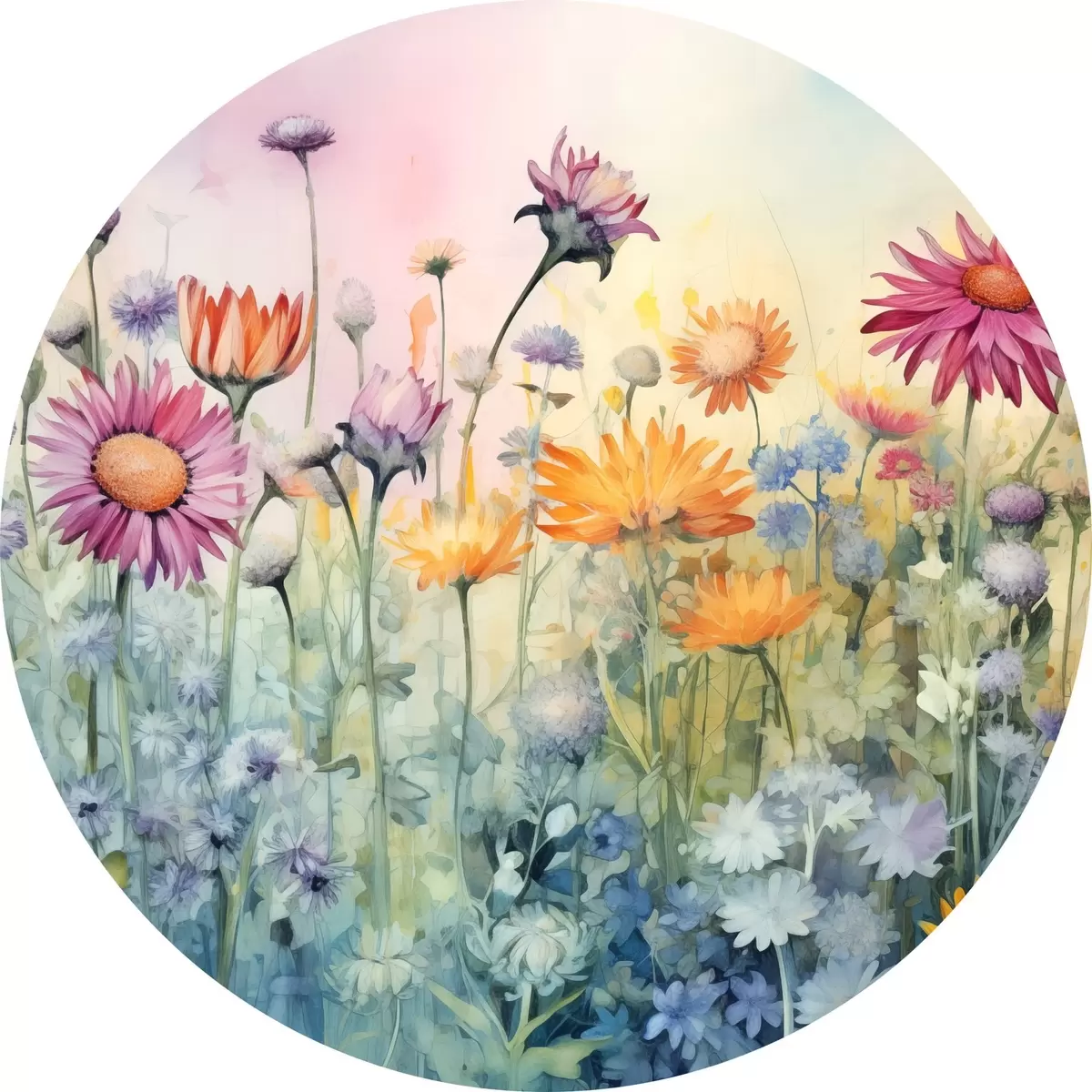 Runde Gemälde Ein lebhaftes Feld hoher und üppiger Wildblumen vor einem weichen, pastellfarbenen, aquarellartigen Hintergrund r42726