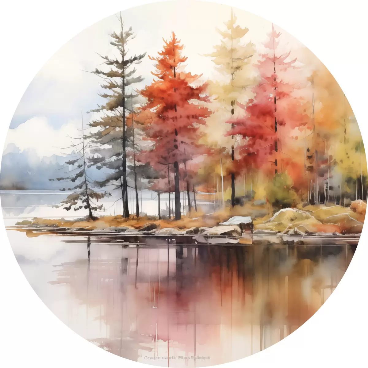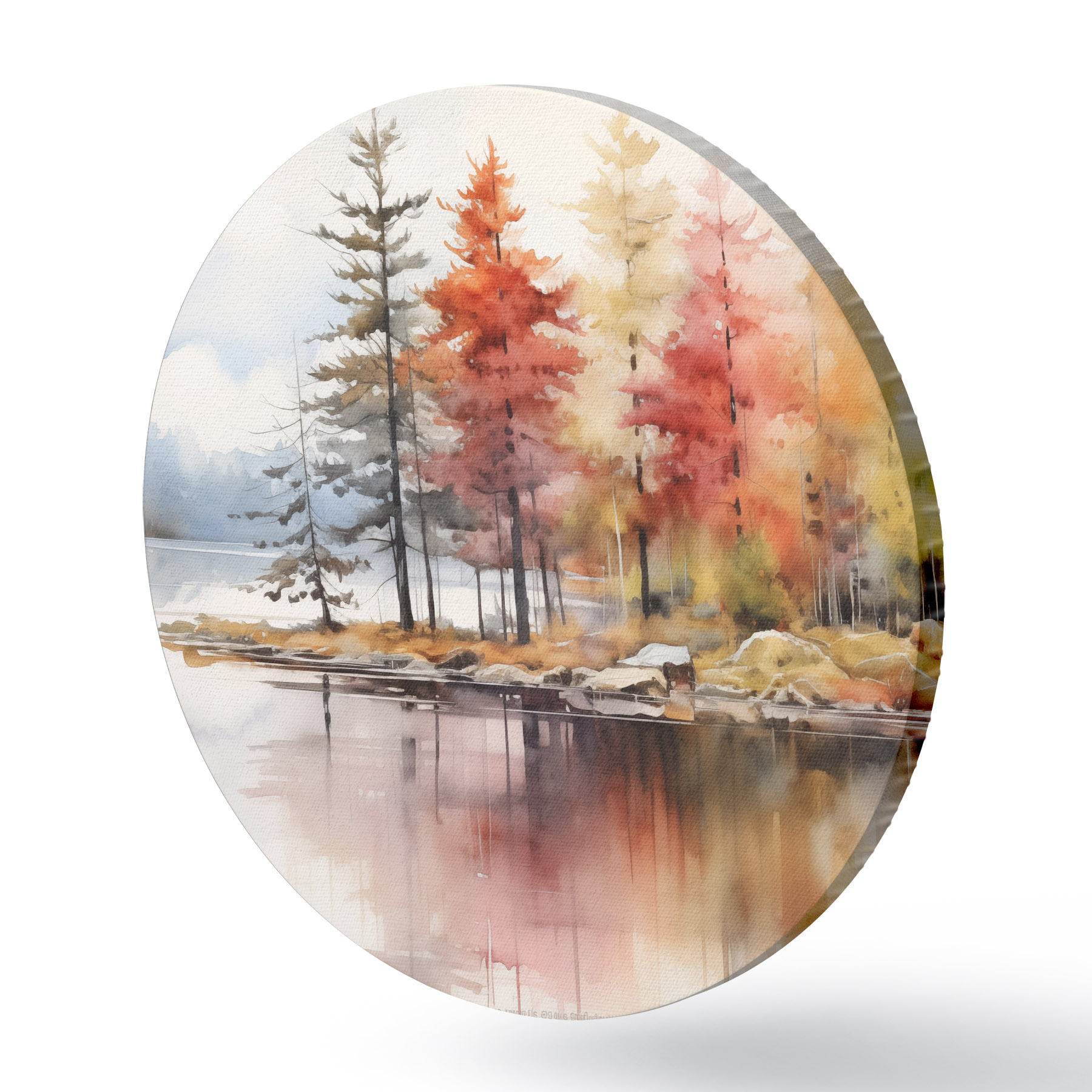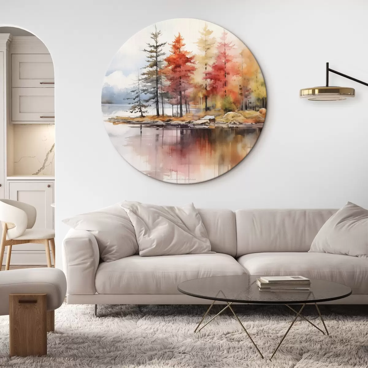 Runde Gemälde Aquarellartige Landschaft mit einem See, umgeben von Bäumen in leuchtenden Herbstfarben r42727