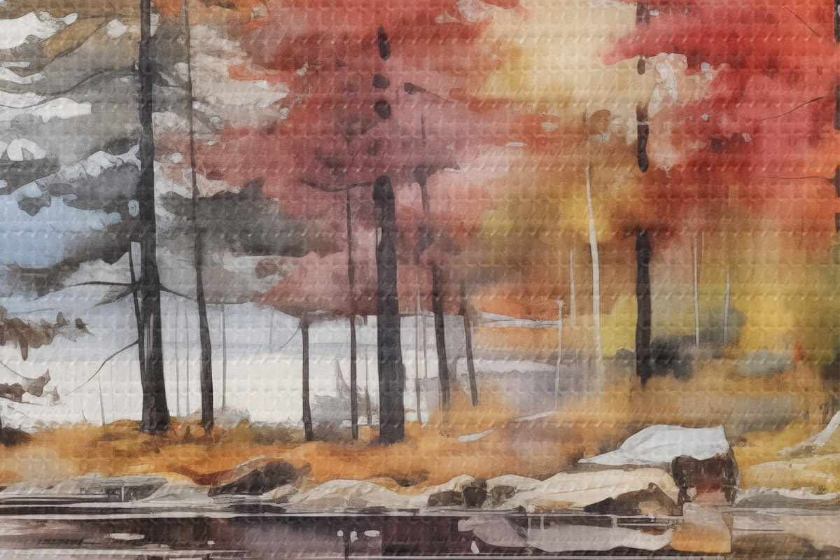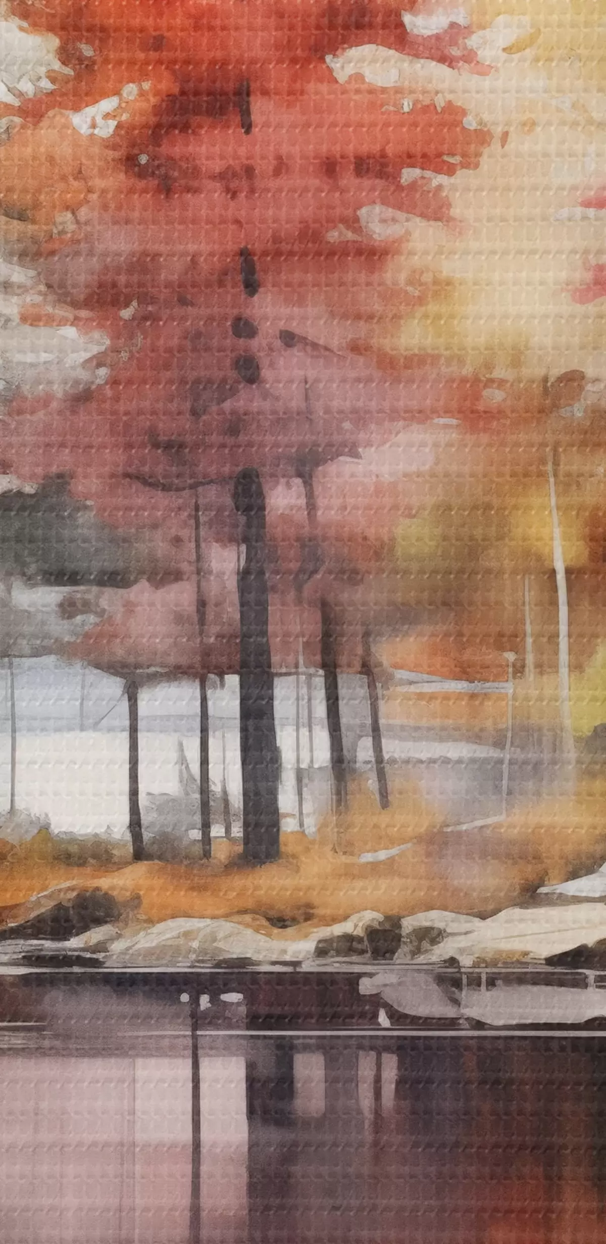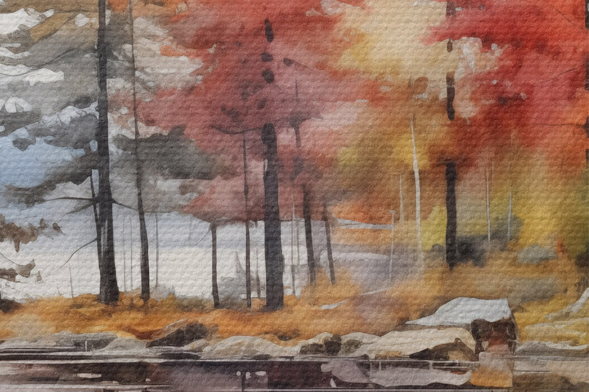Bild Aquarellartige Landschaft mit einem See, umgeben von Bäumen in leuchtenden Herbstfarben Nr r42727