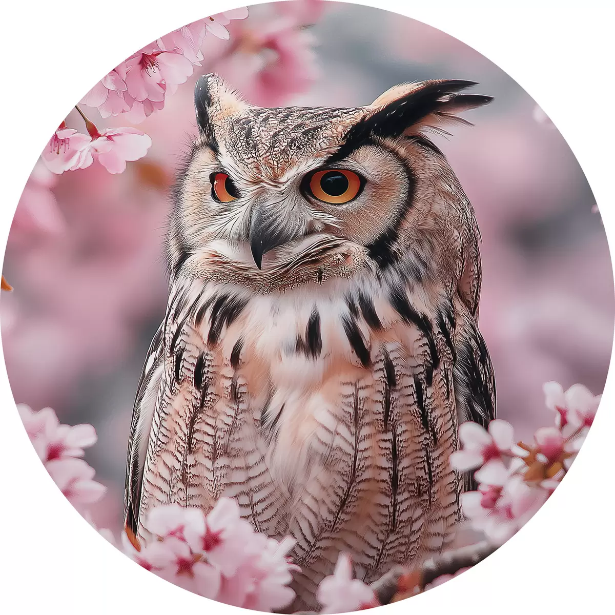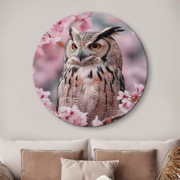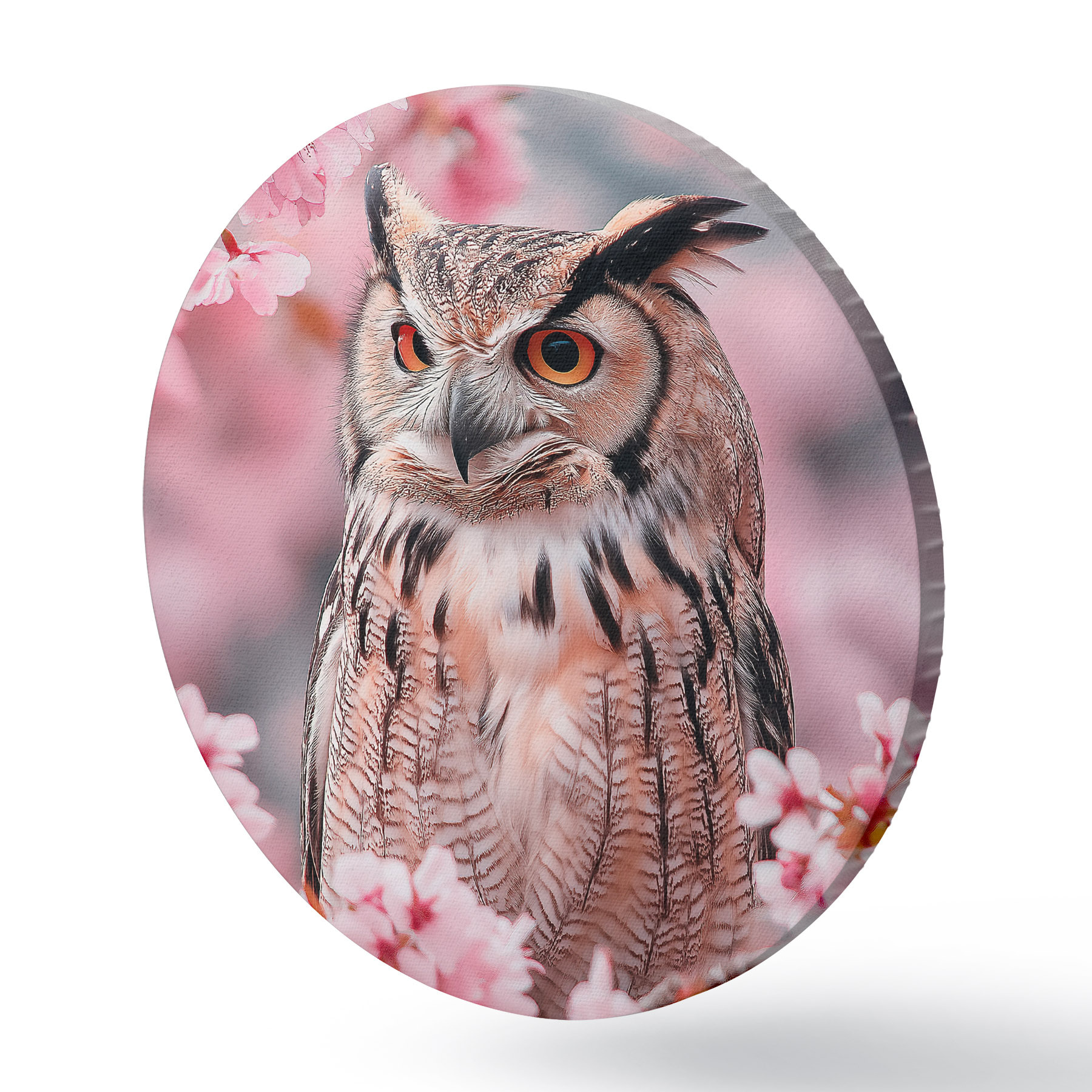 Runde Gemälde Schöne Eule auf dem Zweig eines Kirschbaums, Natur, Realismus r42784
