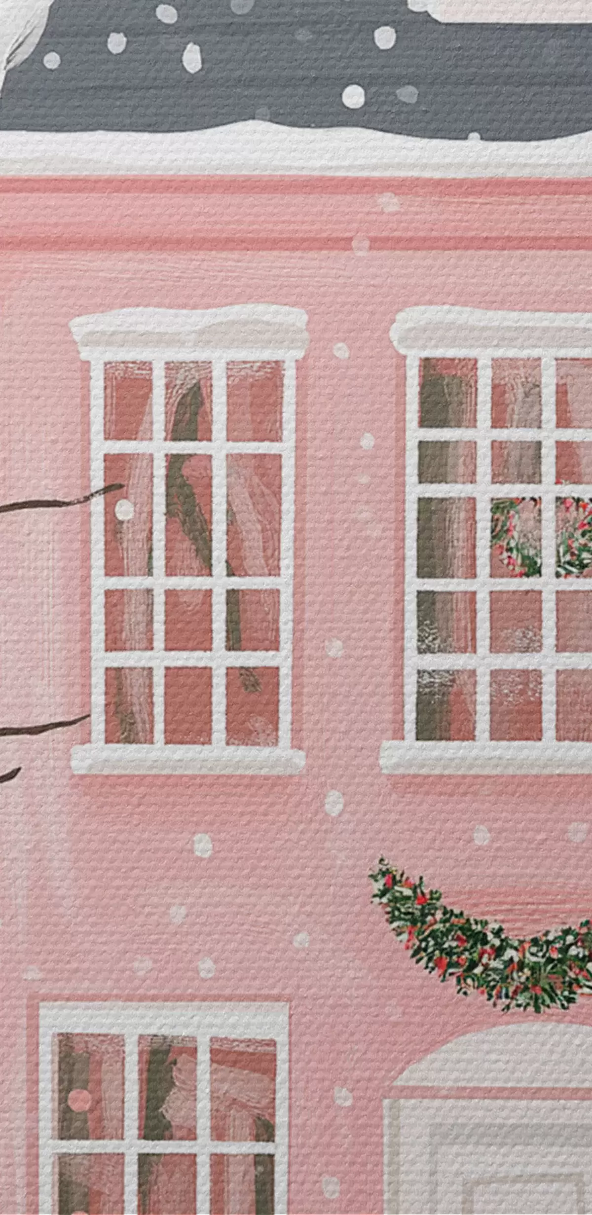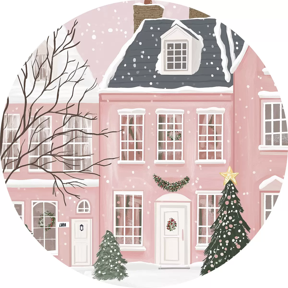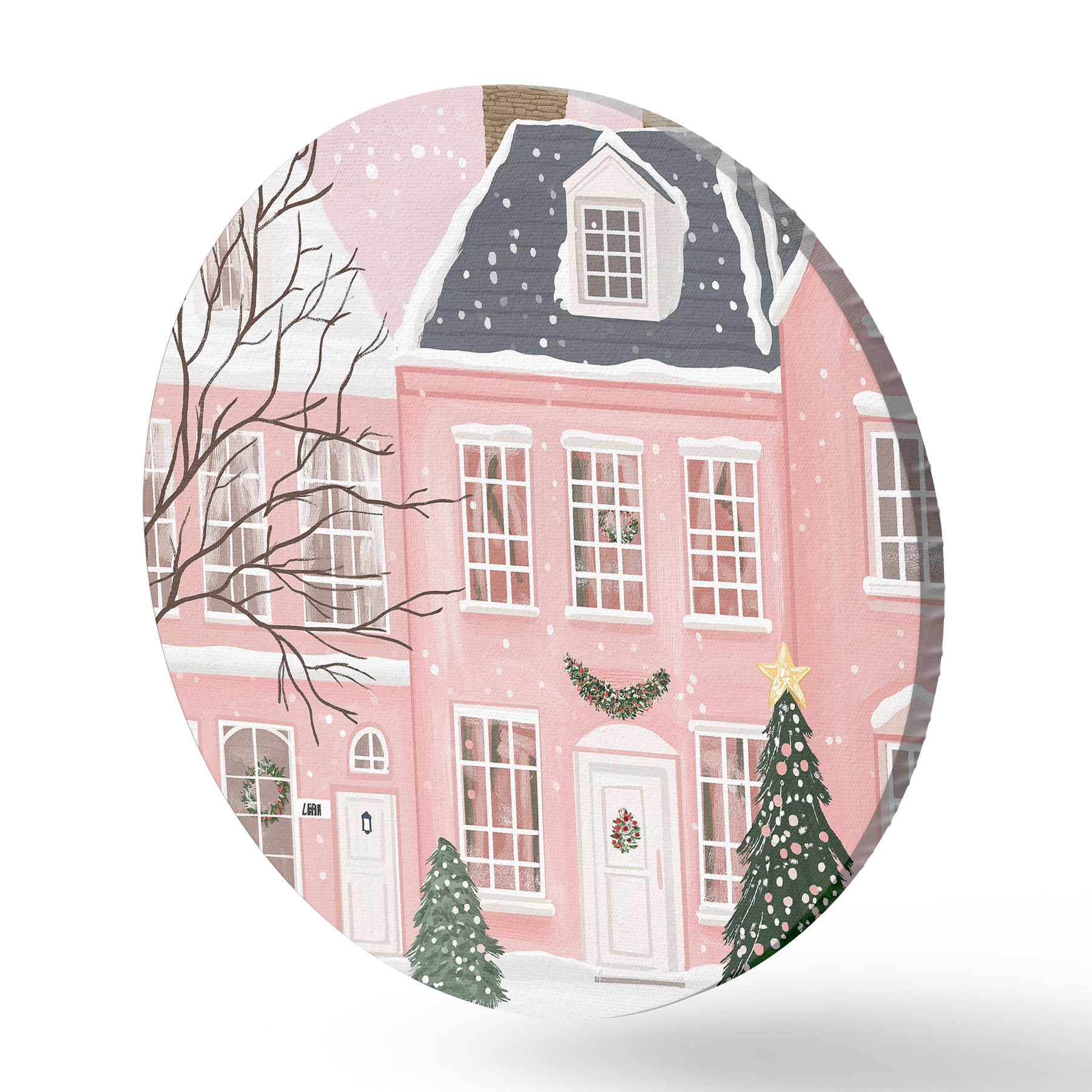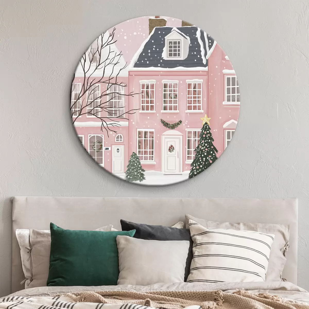 Runde Gemälde Hübsche rosa Häuser, Kiefern, Winterlandschaften r42791