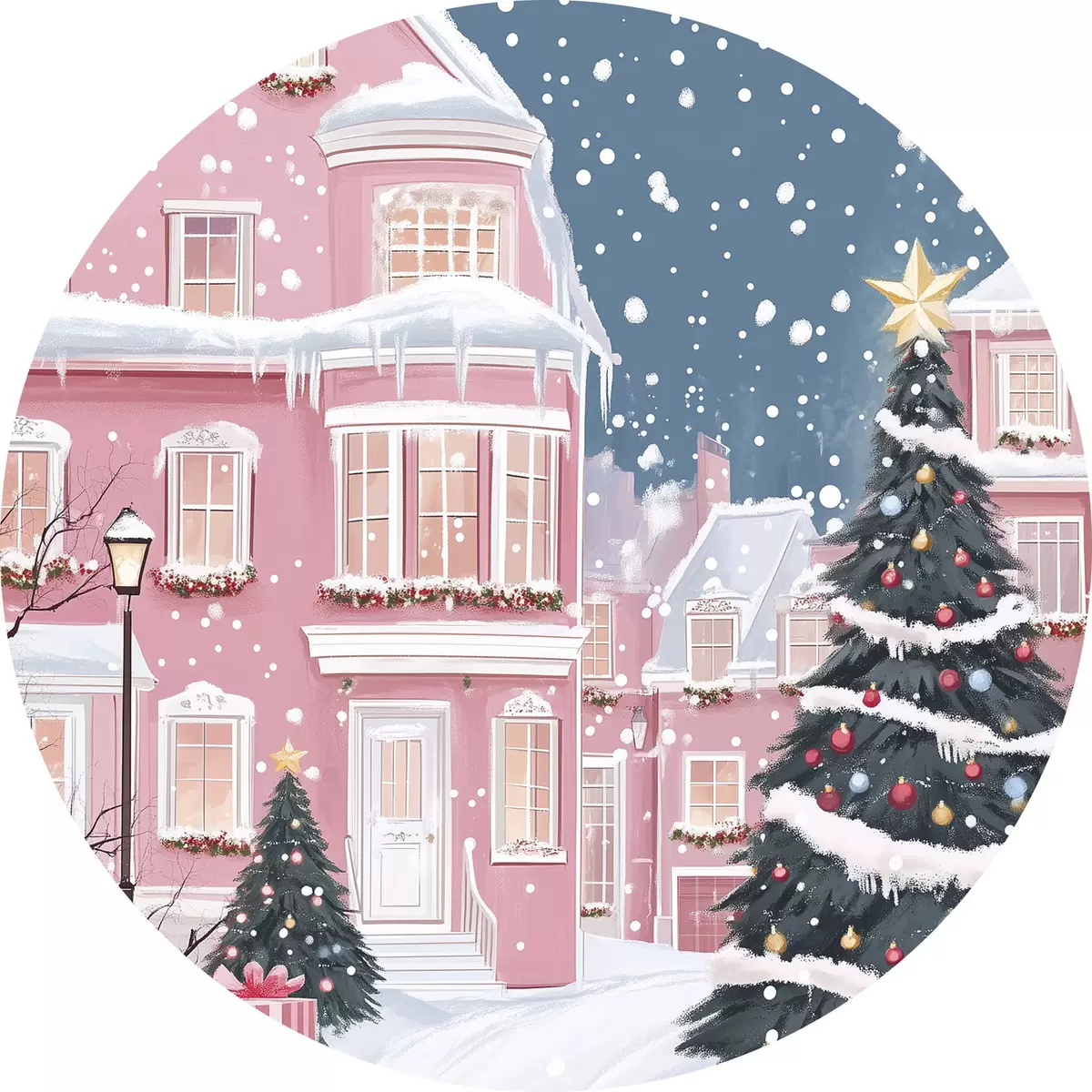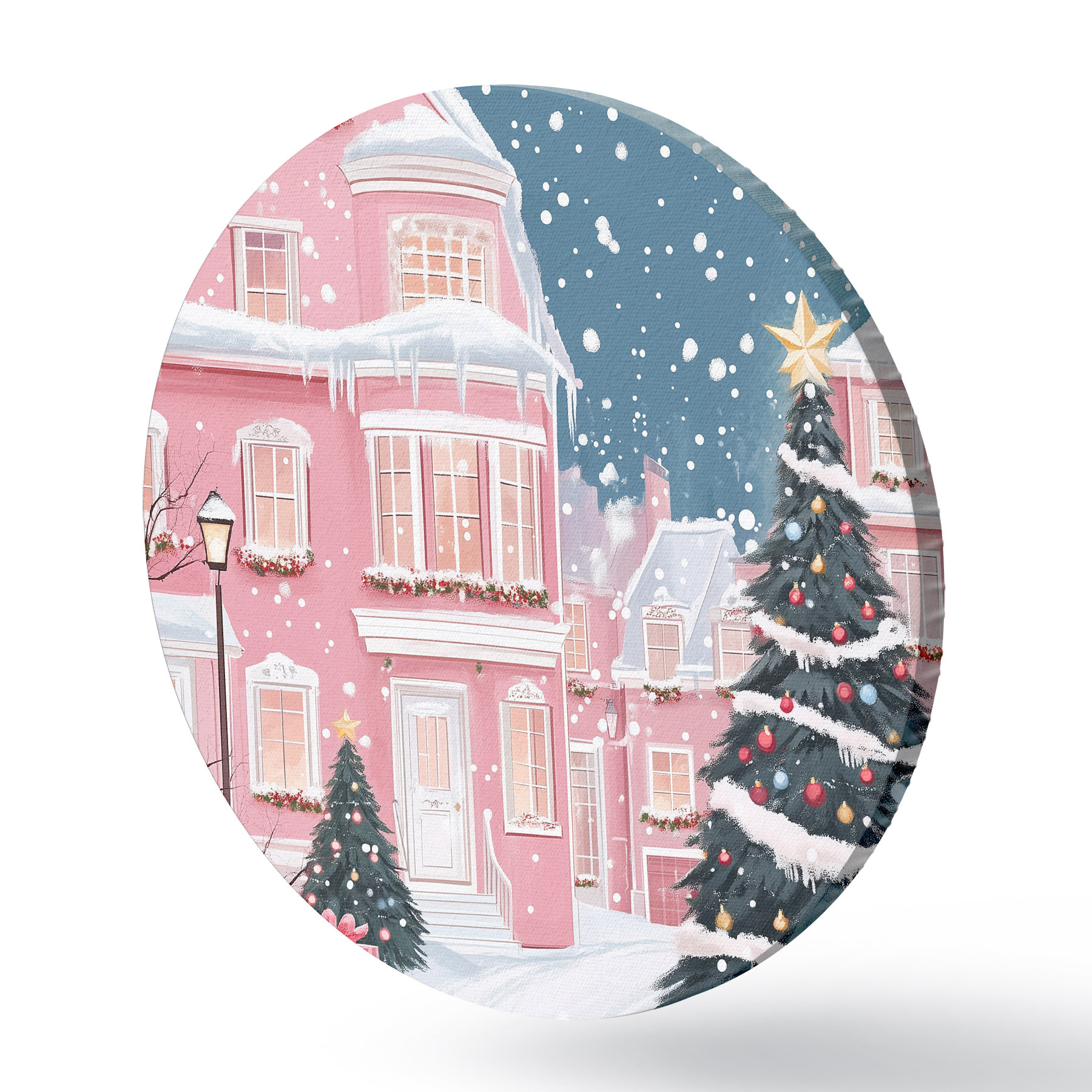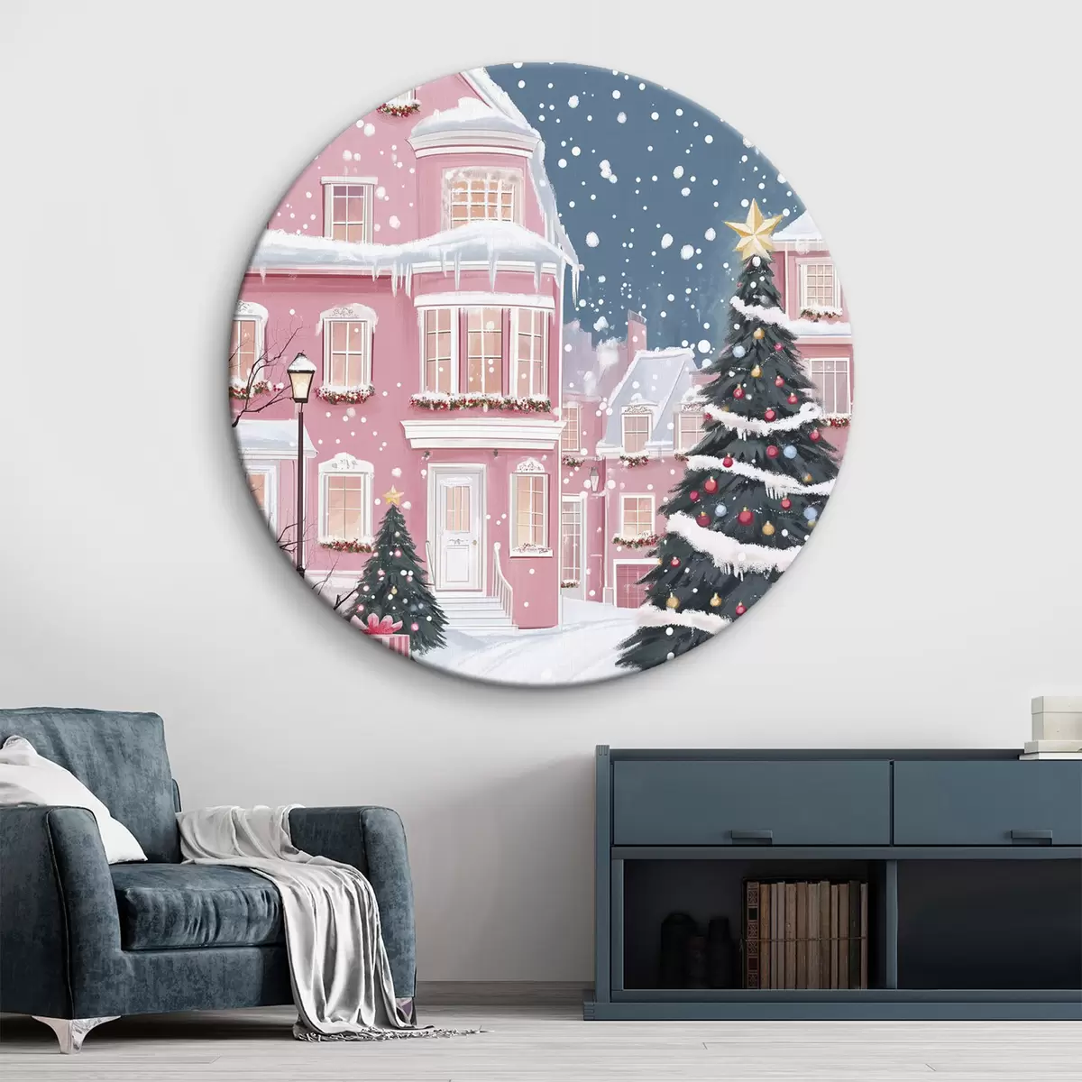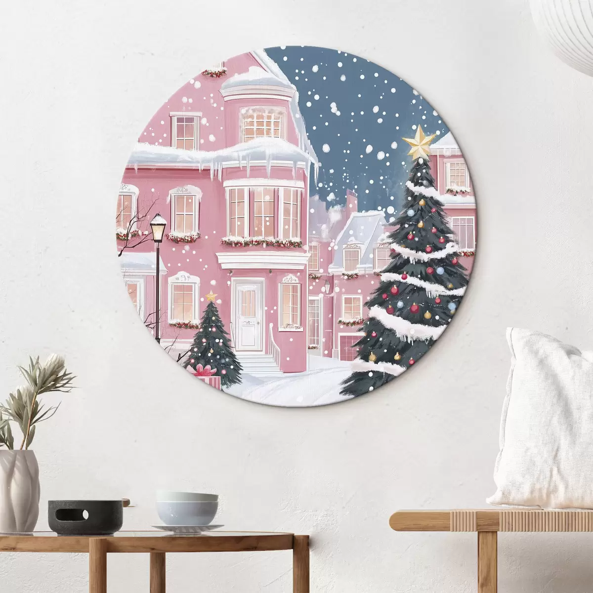 Runde Gemälde Winterstadt mit rosa Häusern, Weihnachtsbäumen und Schneeflocken r42792