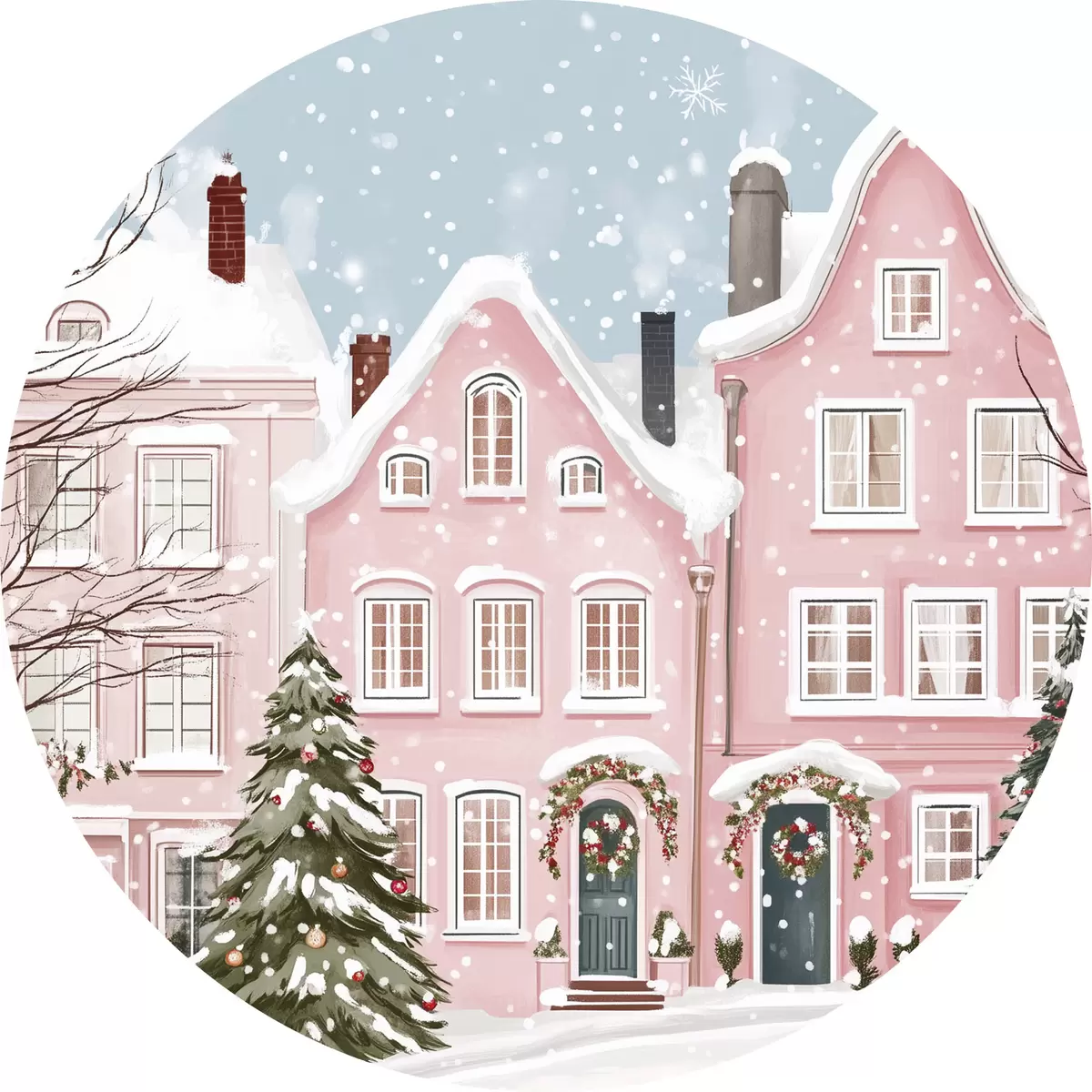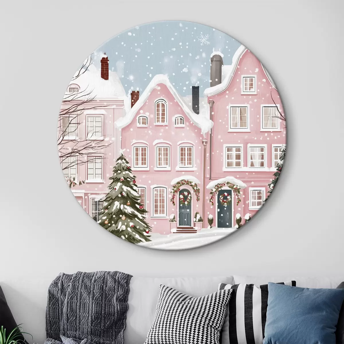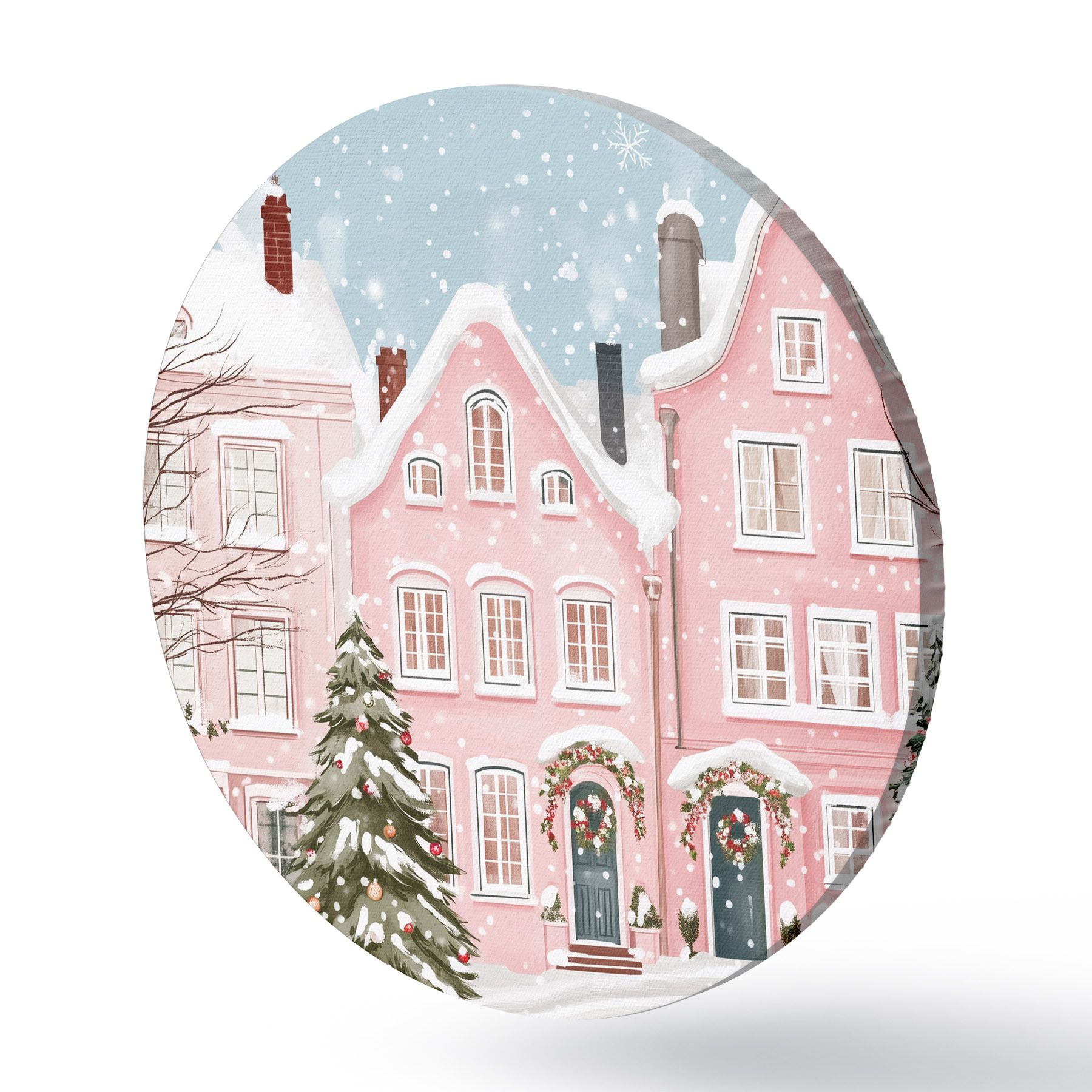 Runde Gemälde Schöne Stadt mit niedlichen rosa Häusern, Winterästhetik, Schneeflocken r42793