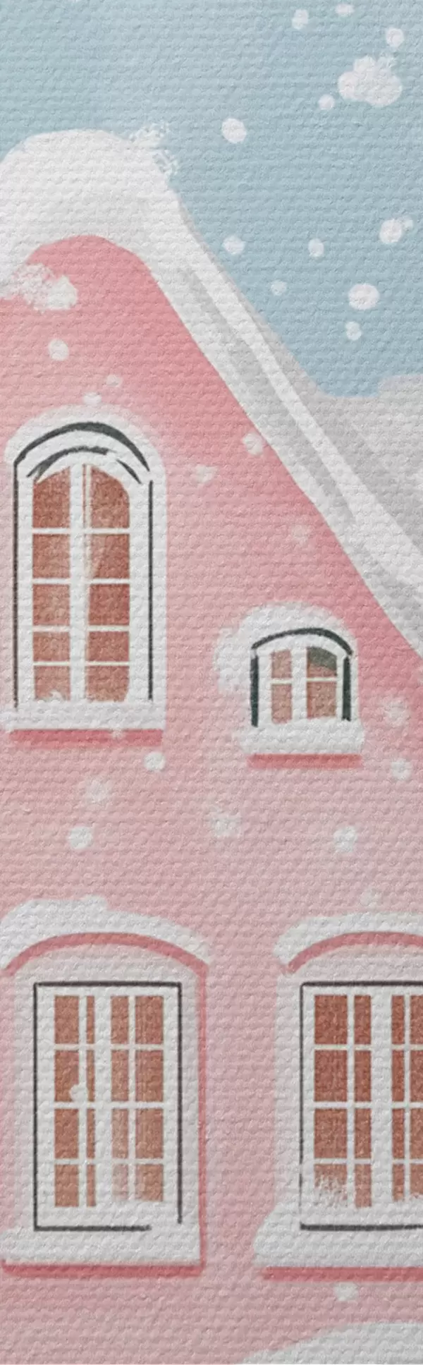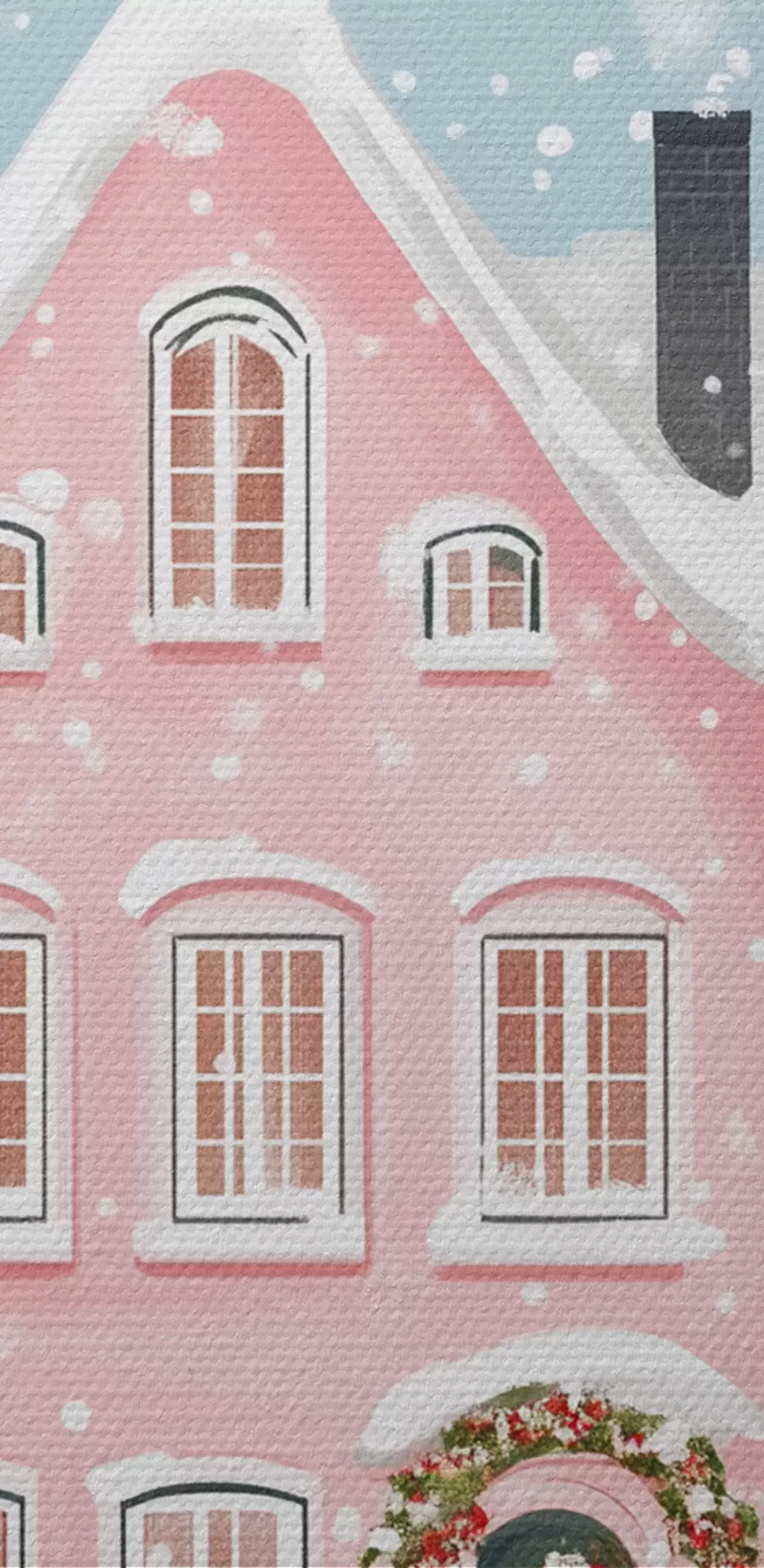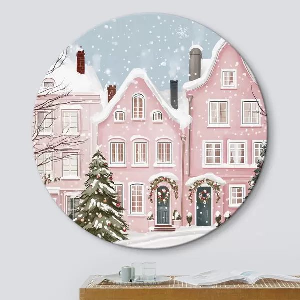 Runde Gemälde Schöne Stadt mit niedlichen rosa Häusern, Winterästhetik, Schneeflocken r42793