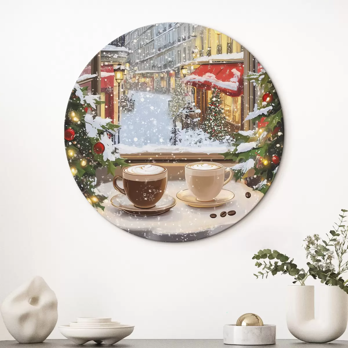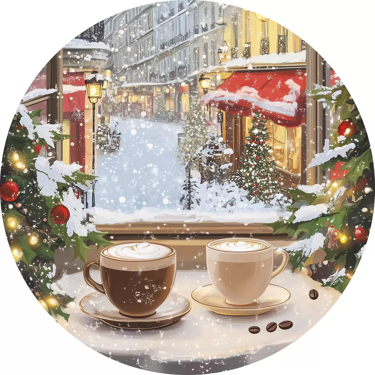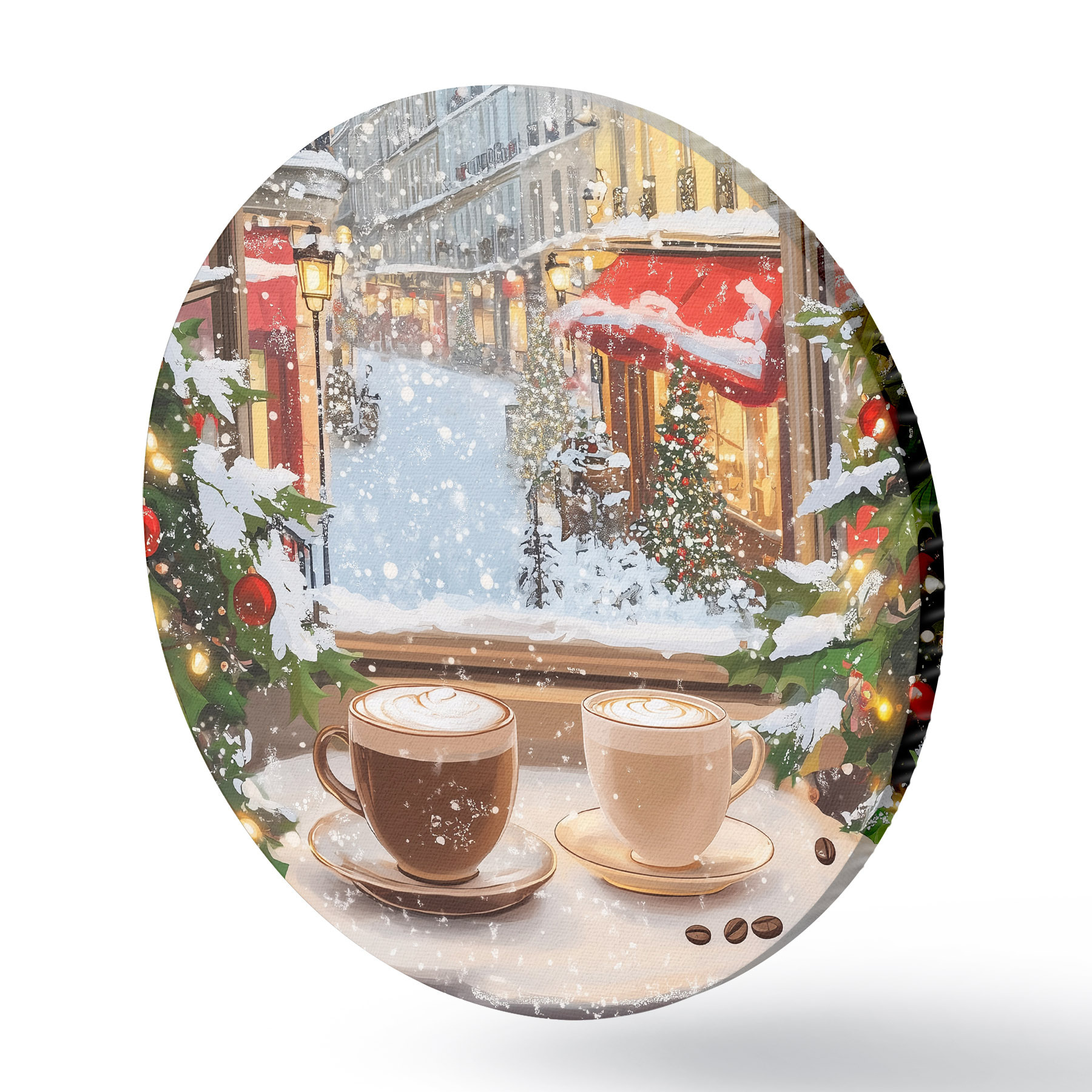 Runde Gemälde Gemütliches Wintercafé, Tassen Kaffee, Acryl-Stil, alte Stadtarchitektur r42795