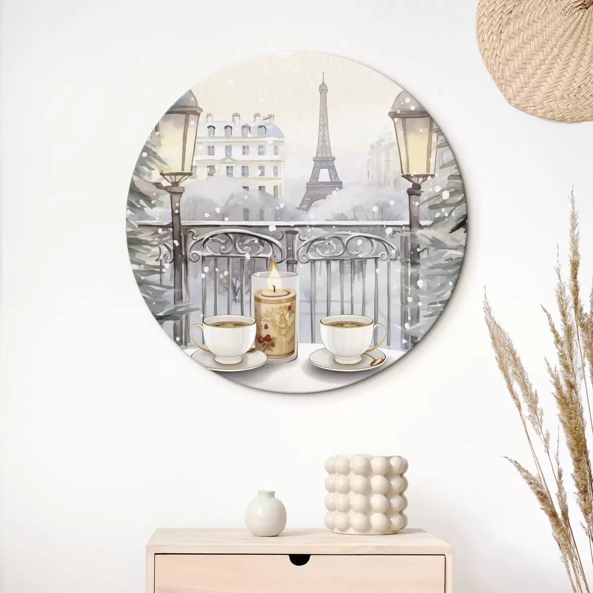 Runde Gemälde Schönes Café in Paris, Teetassen, romantische Aussicht, Winter, Aquarellstil r42799