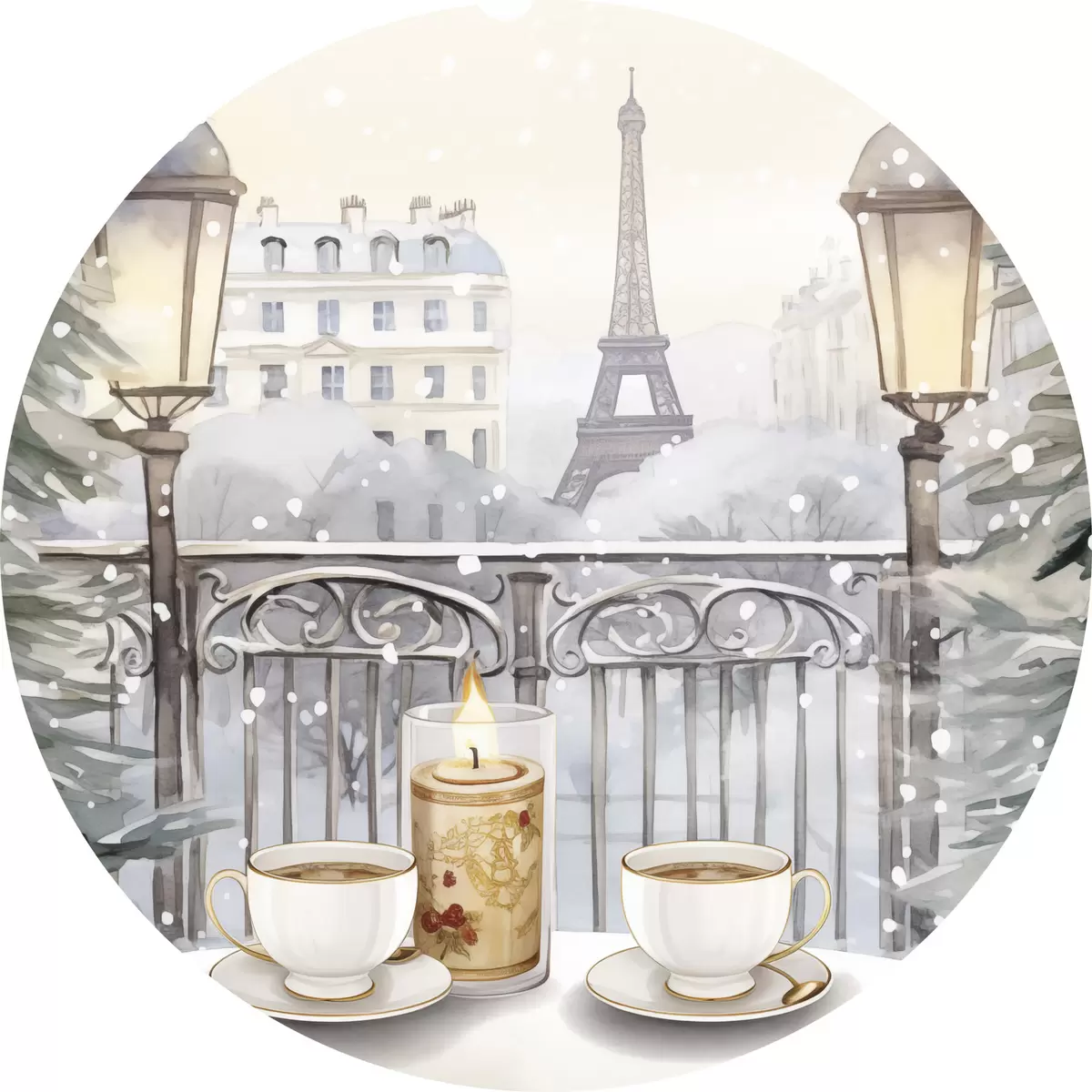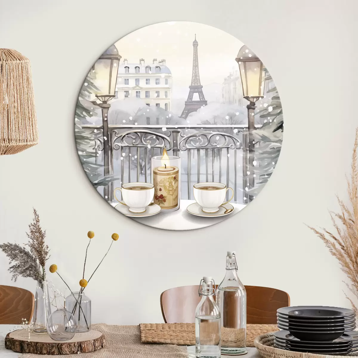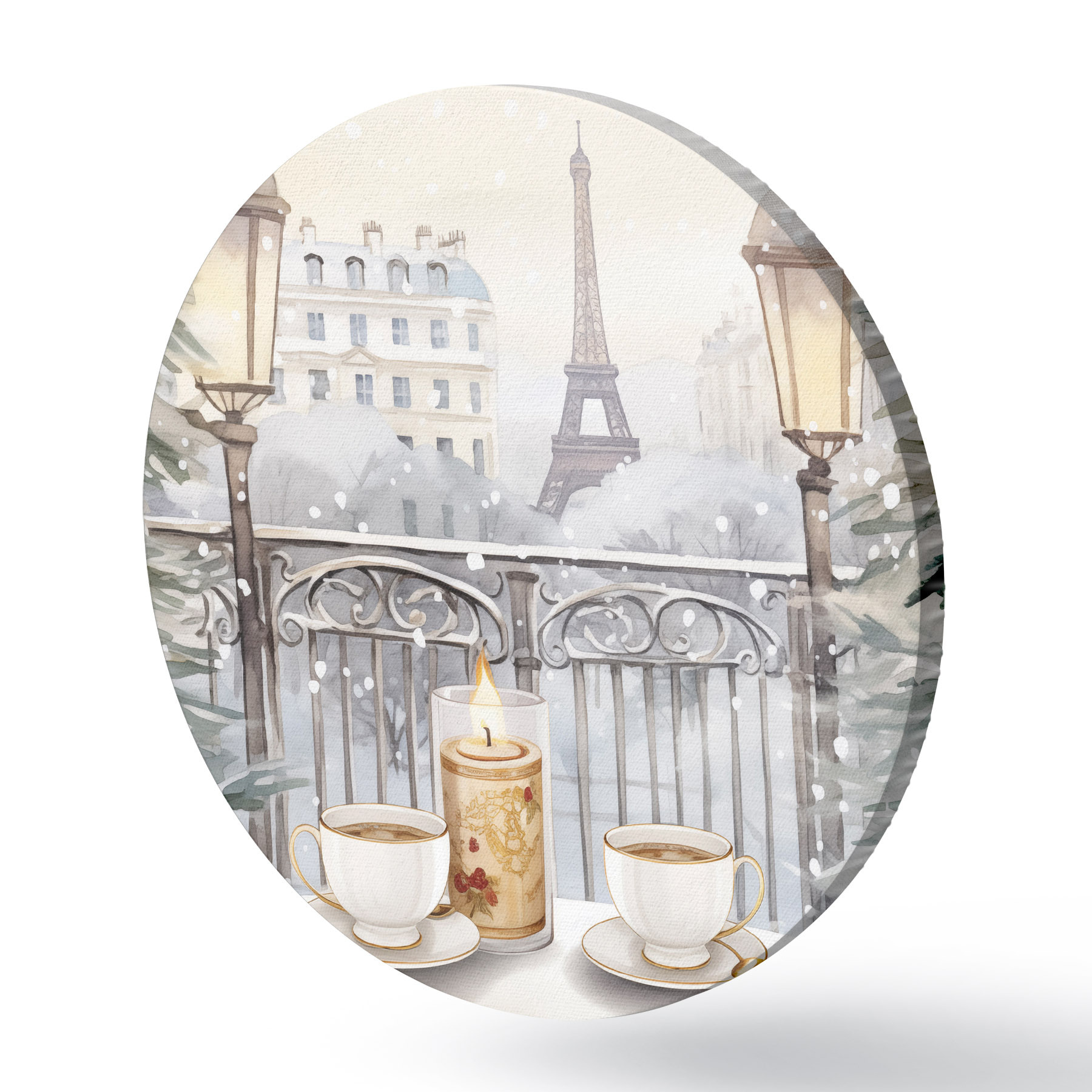 Runde Gemälde Schönes Café in Paris, Teetassen, romantische Aussicht, Winter, Aquarellstil r42799