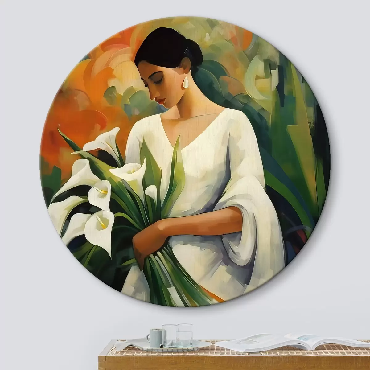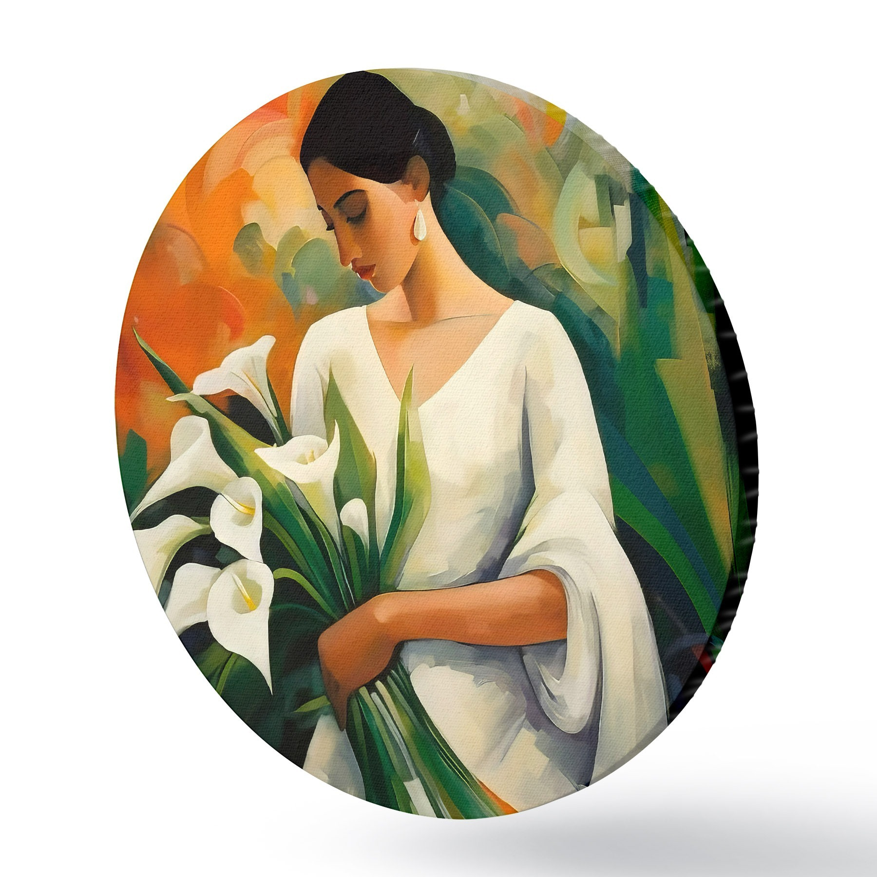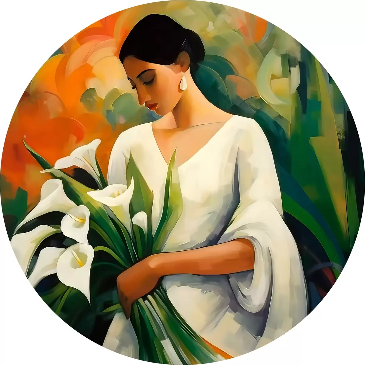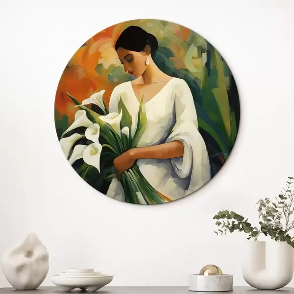 Runde Gemälde Frau mit einem Blumenstrauß aus Calla-Lilien r42818