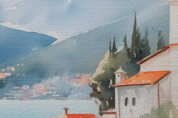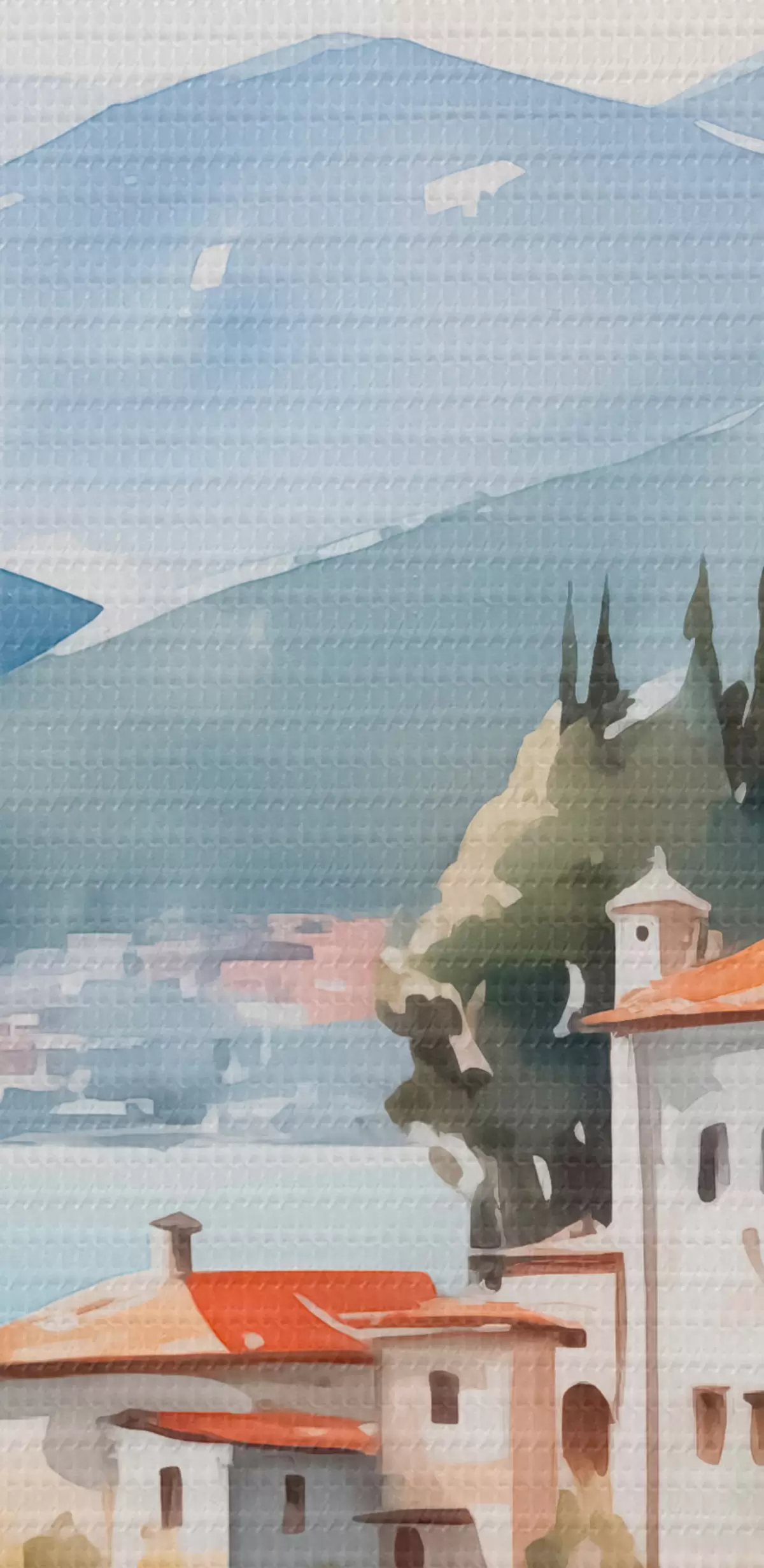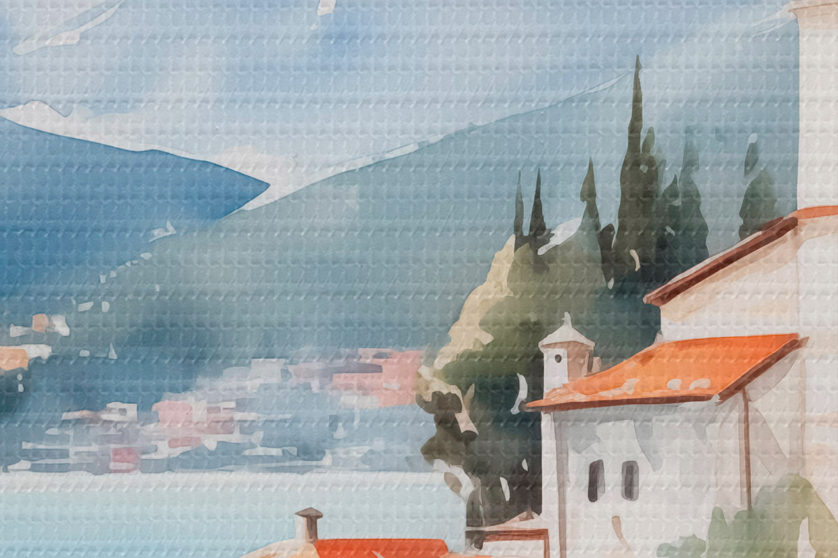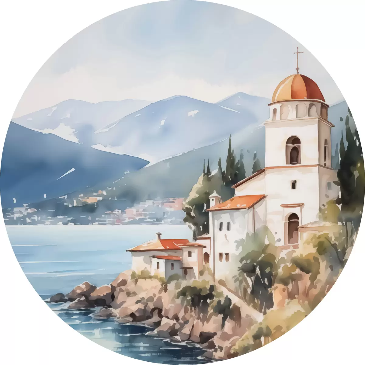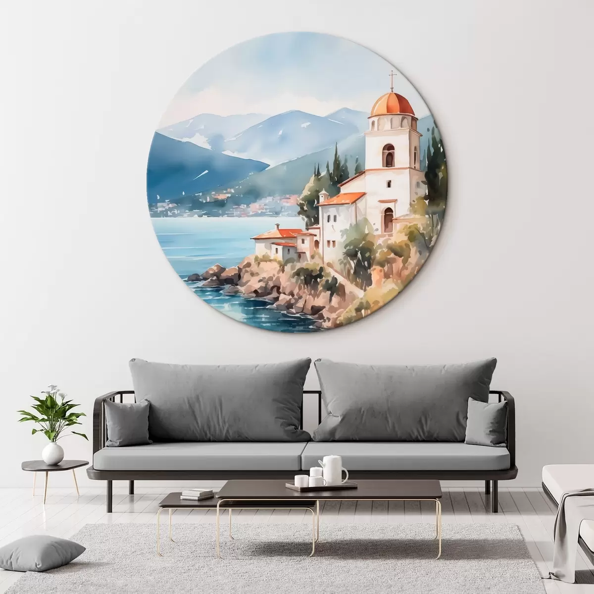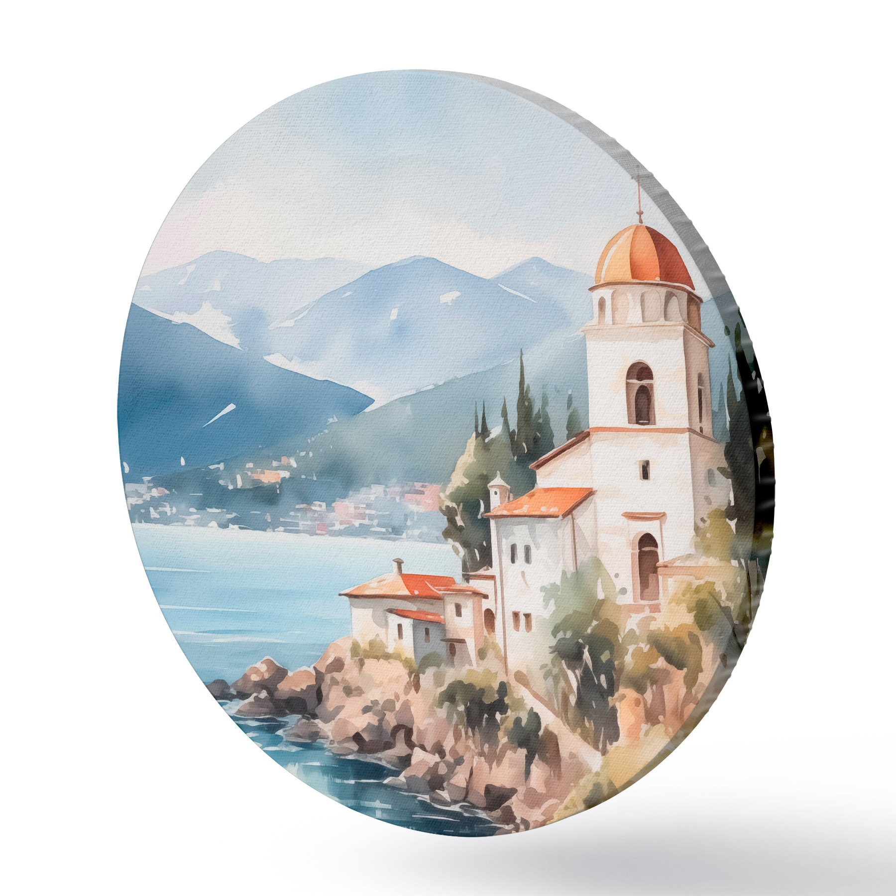 Runde Gemälde Kirche am Meer mit Bergen im Hintergrund r42962
