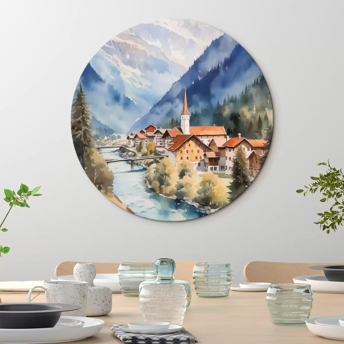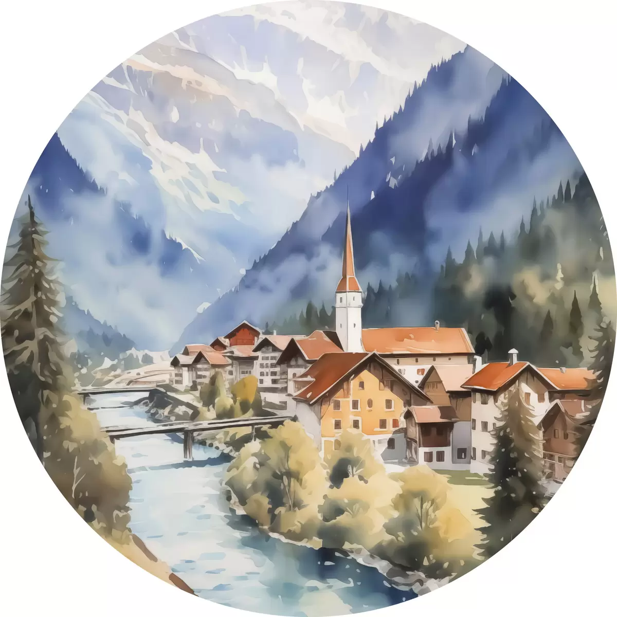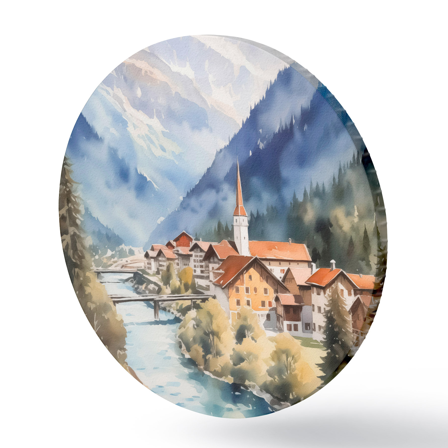 Runde Gemälde Dorf in der Nähe der Berge Nachahmung Aquarell r42964