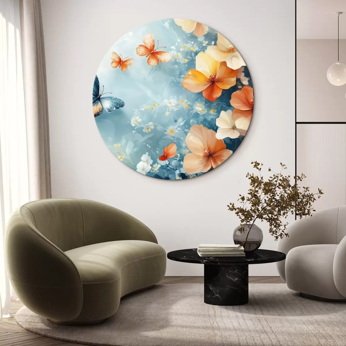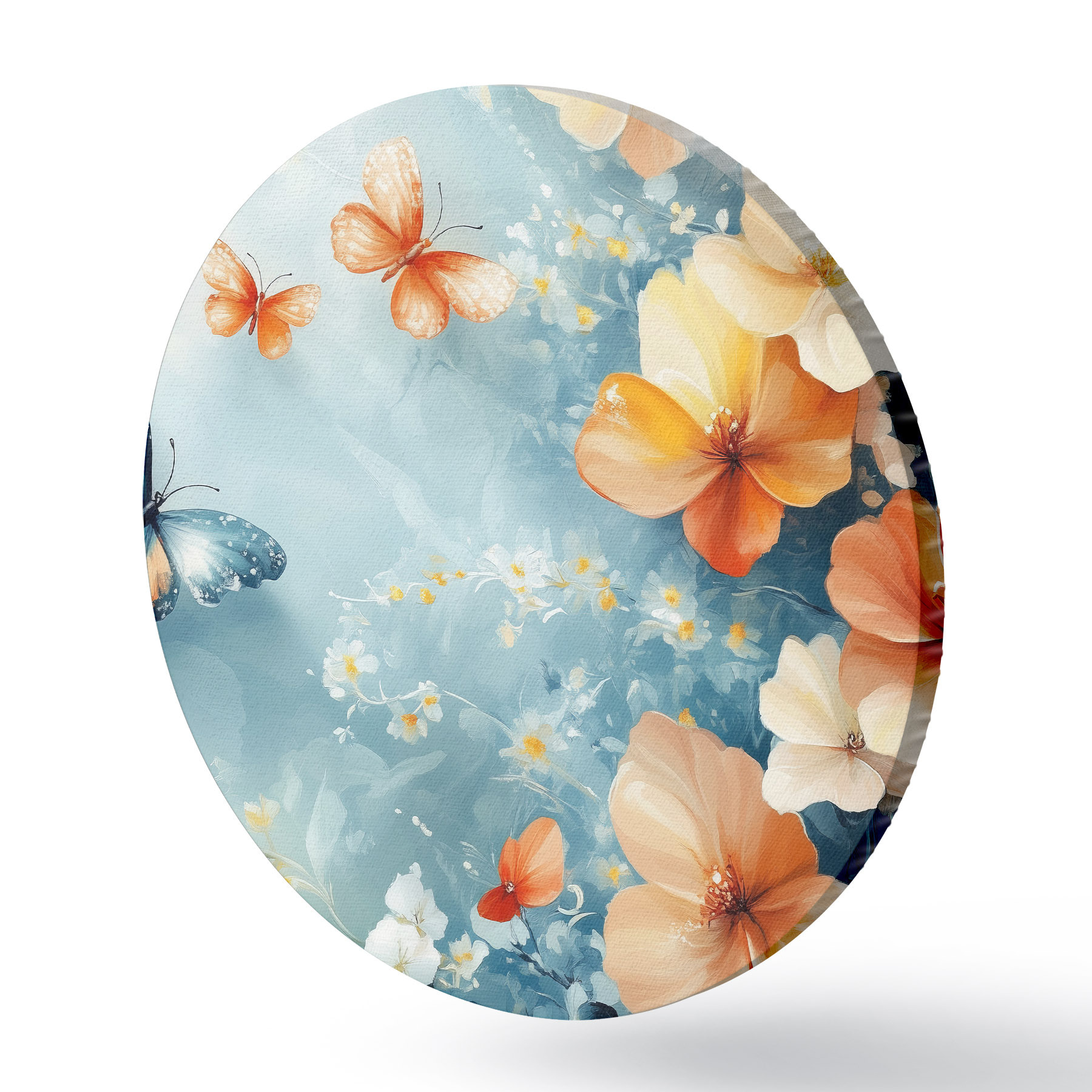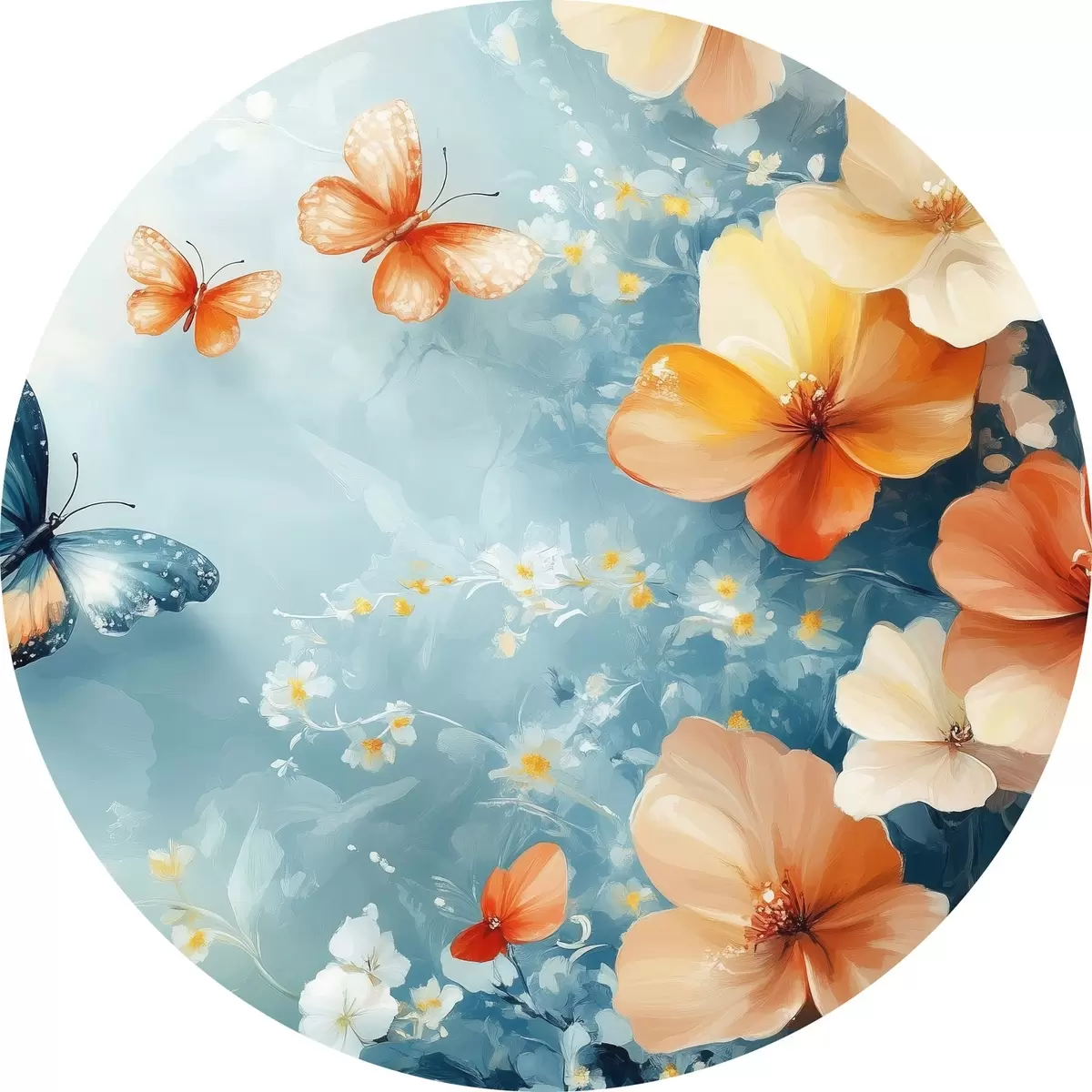 Runde Gemälde Orangefarbene Blumen und Schmetterlinge r42974