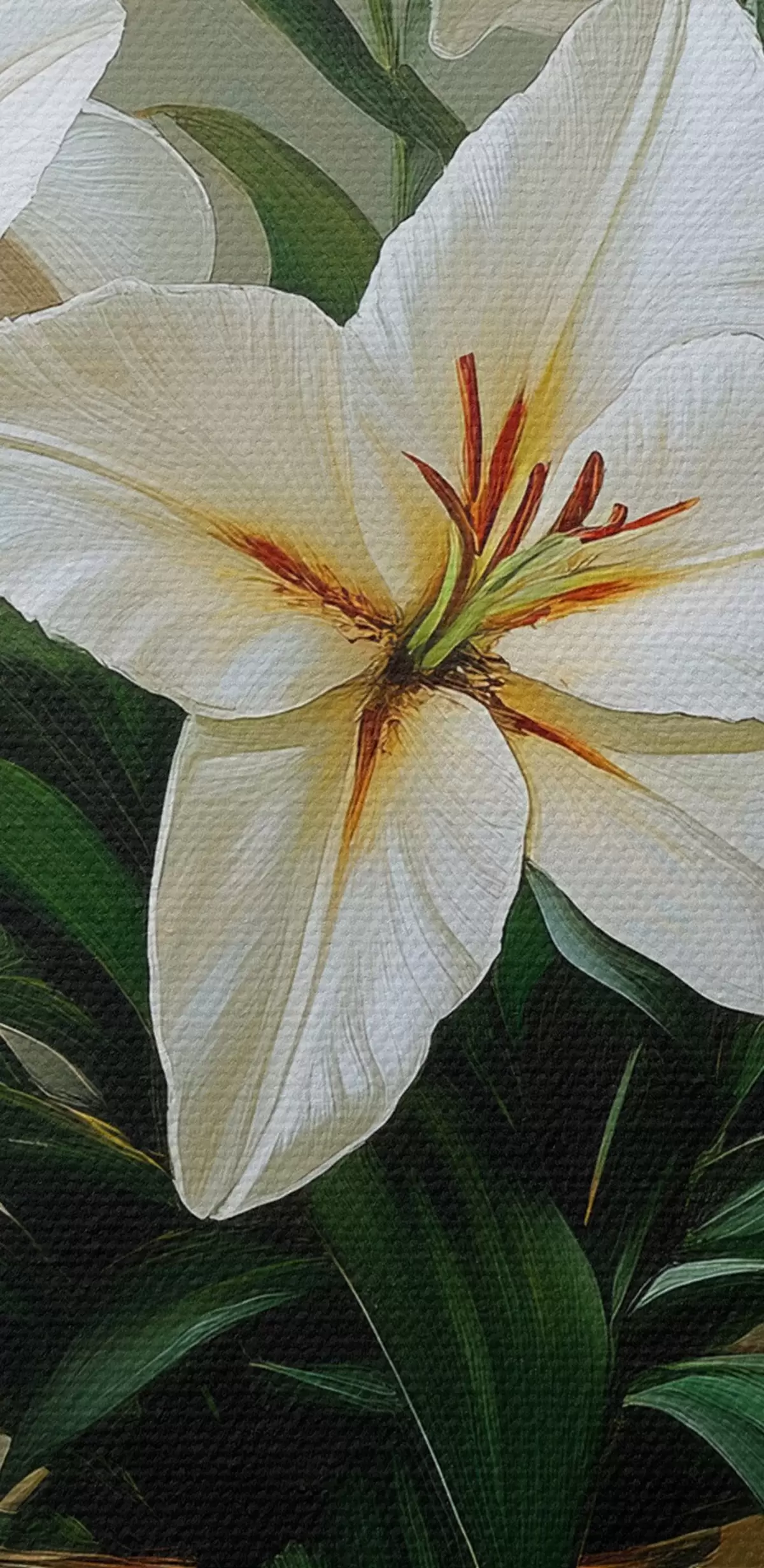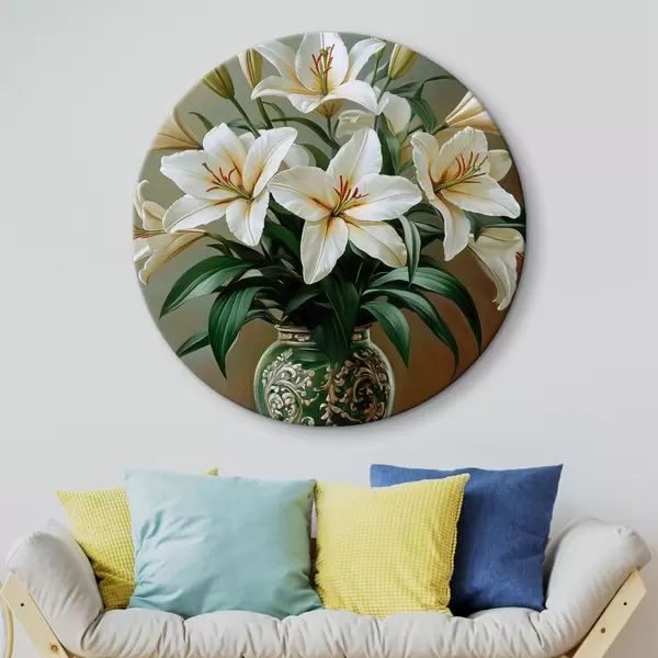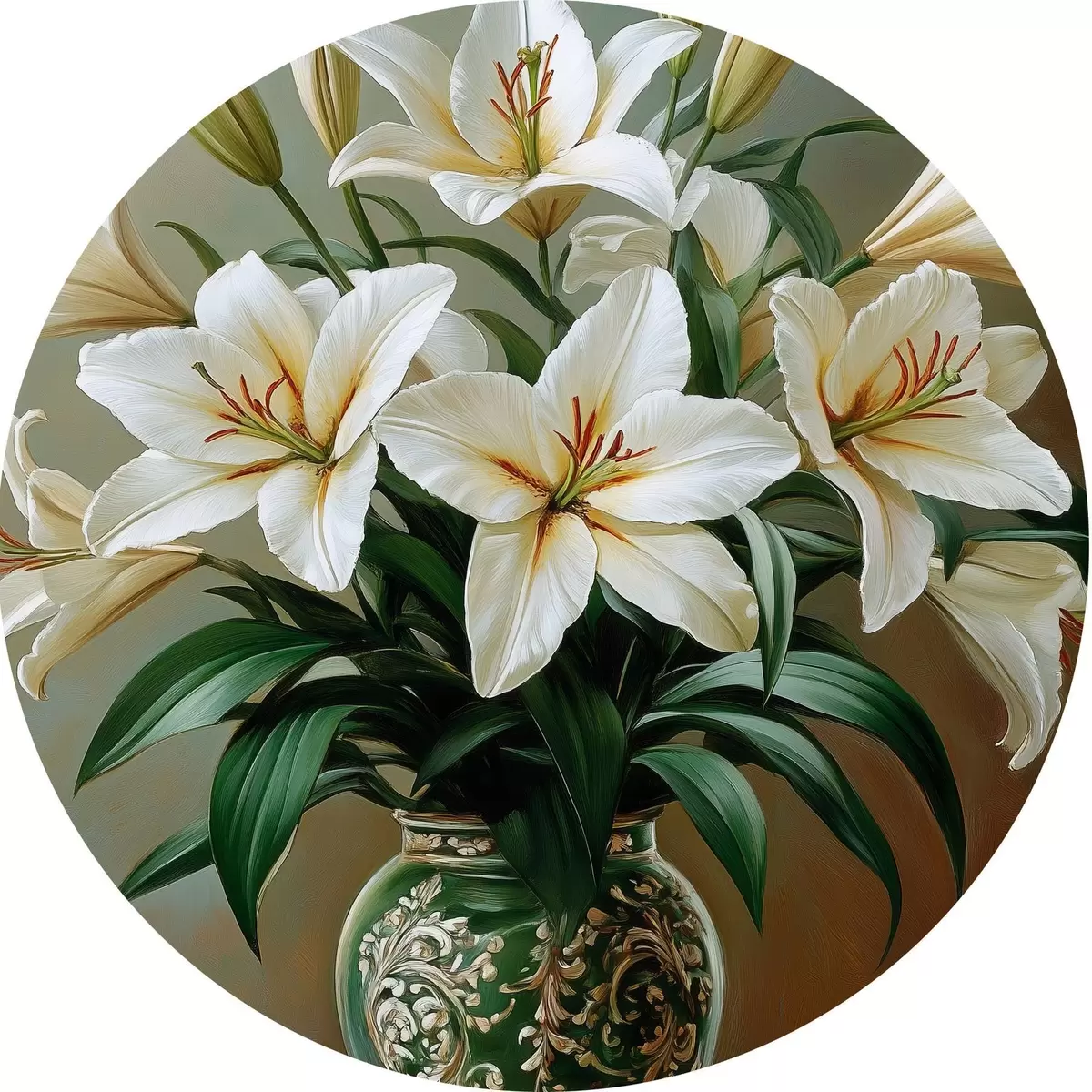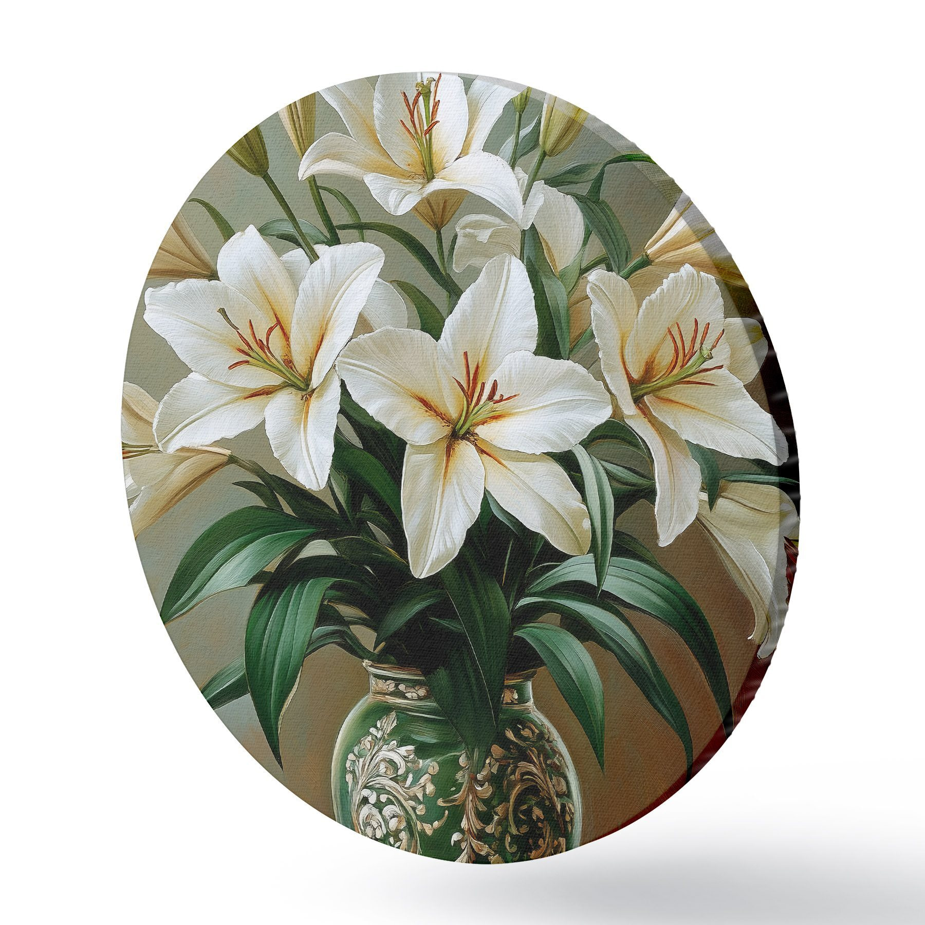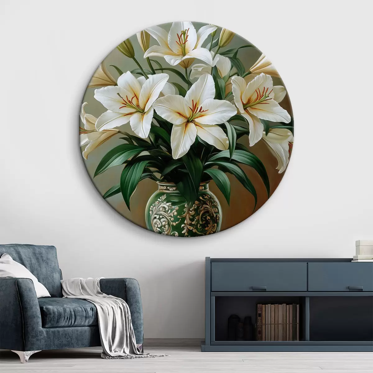 Runde Gemälde Blumenstrauß aus weißen Lilien in einer Vase r42975