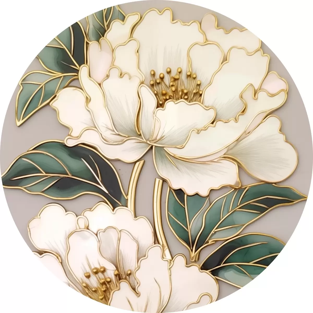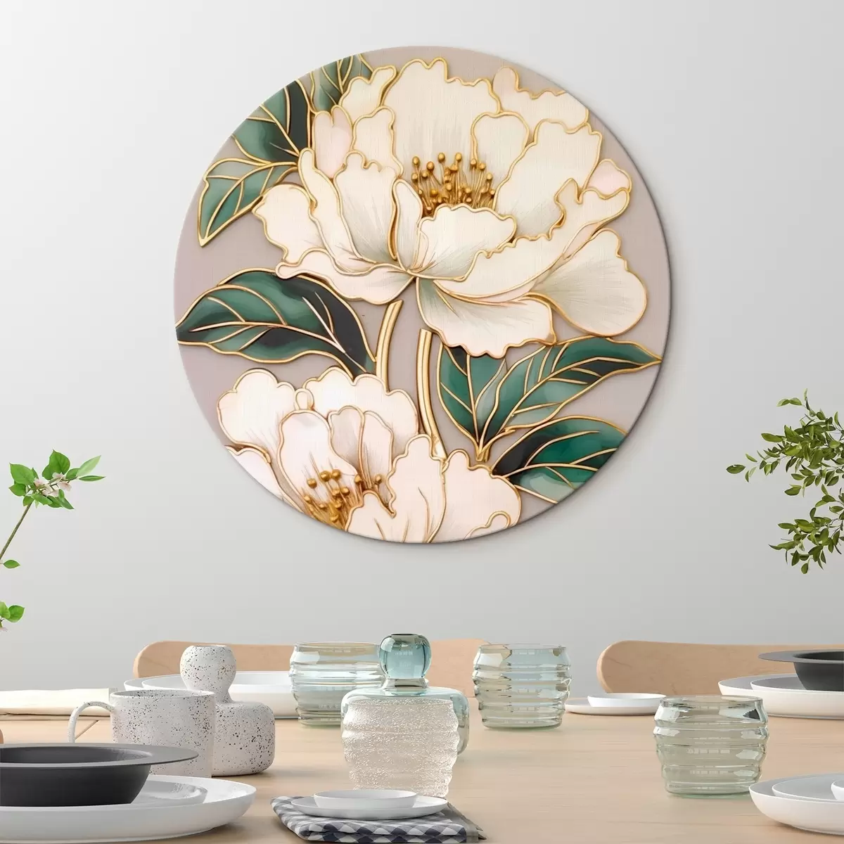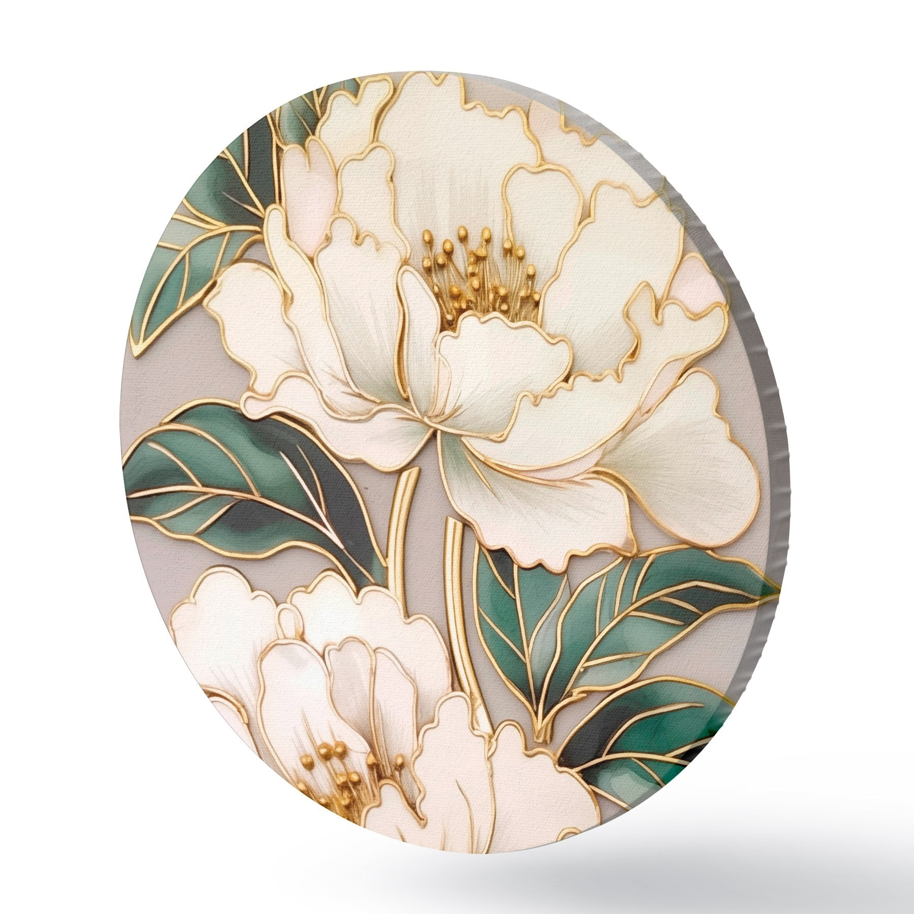 Runde Gemälde Weiße Blumen mit grünen Blättern in dekorativem Arrangement r43011
