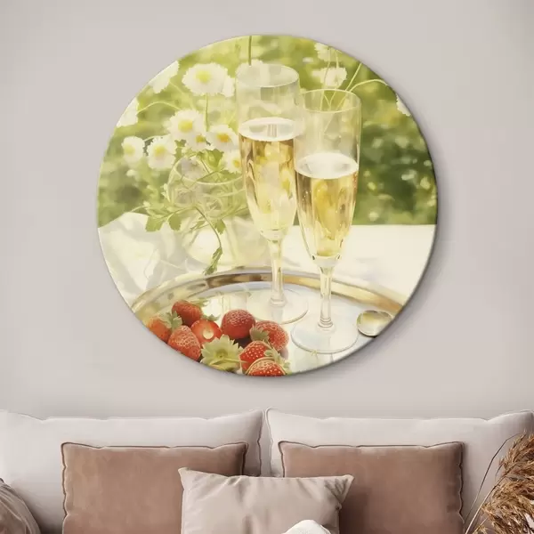 Runde Gemälde Champagnergläser mit Erdbeeren auf dem Tablett, Kamillenblüten, Sommer r43054