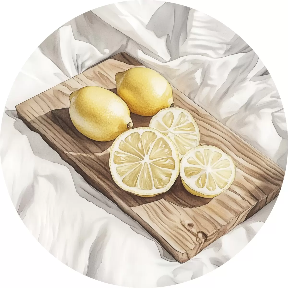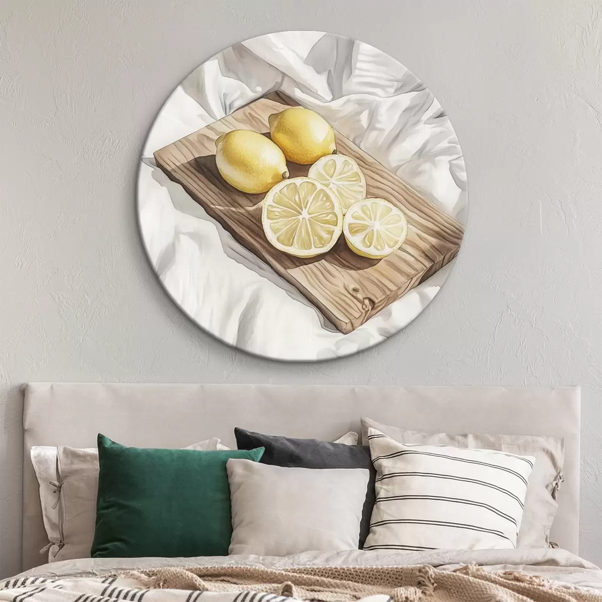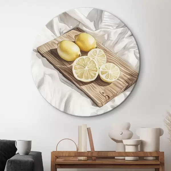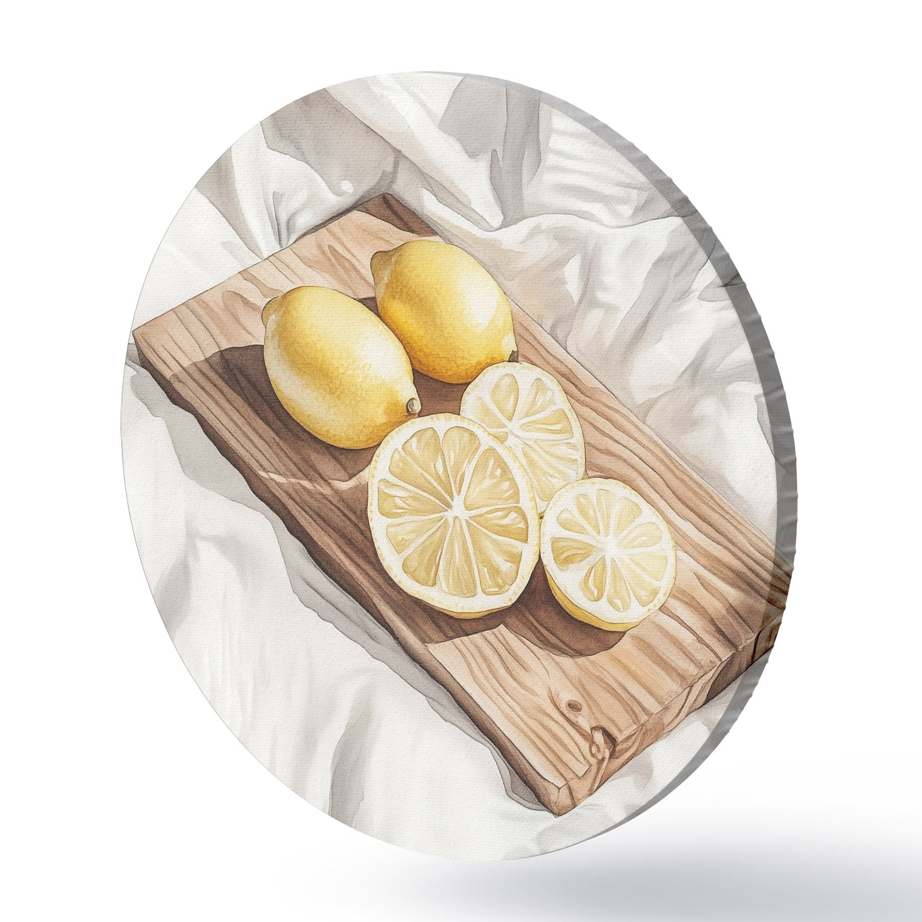 Runde Gemälde Zitronen auf dem Holzbrett, Aquarell, rustikaler Stil r43064