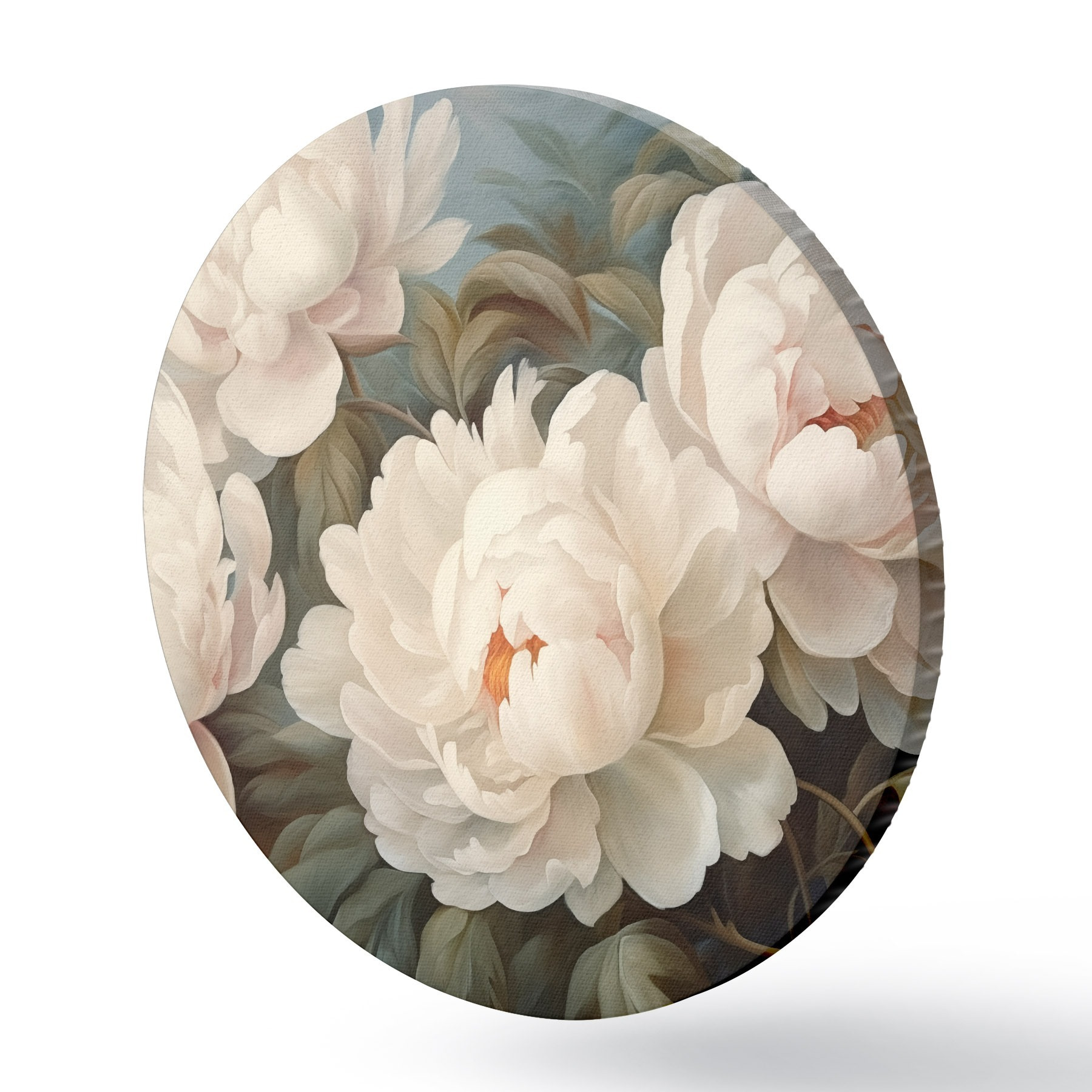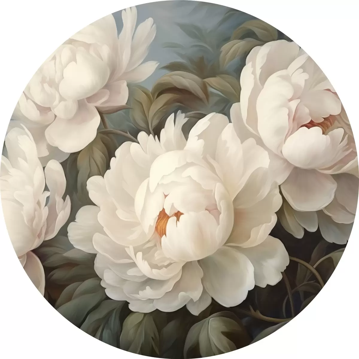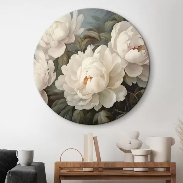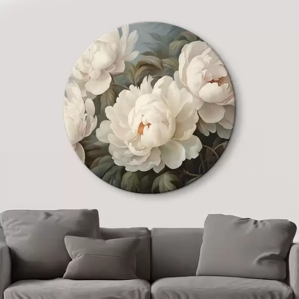 Runde Gemälde Weiße Blüten und Blätter im Nebel r43091