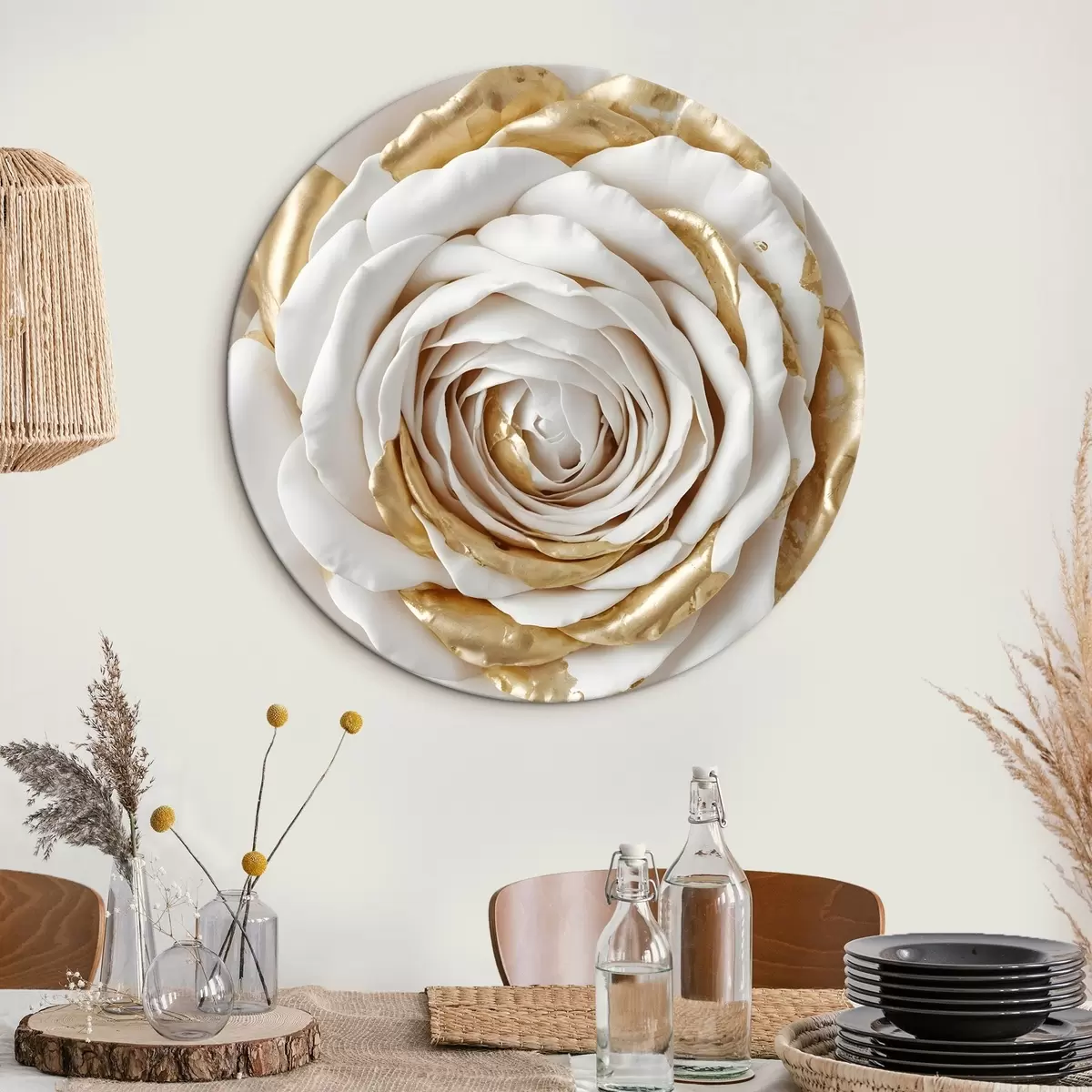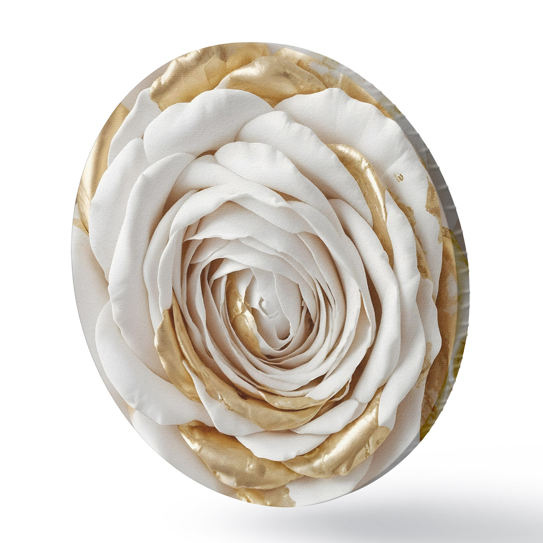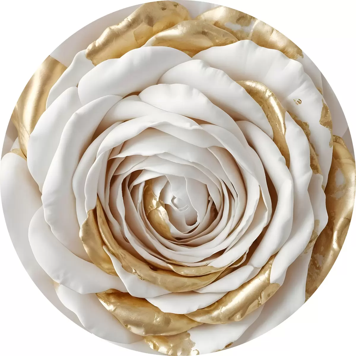 Runde Gemälde Eine weiße minimalistische dekorative Rose mit gelben Akzenten, die Blütenblätter sind geschichtet und gekräuselt r43160