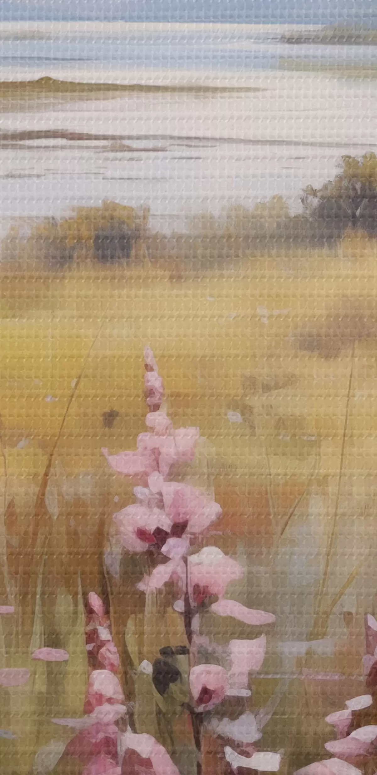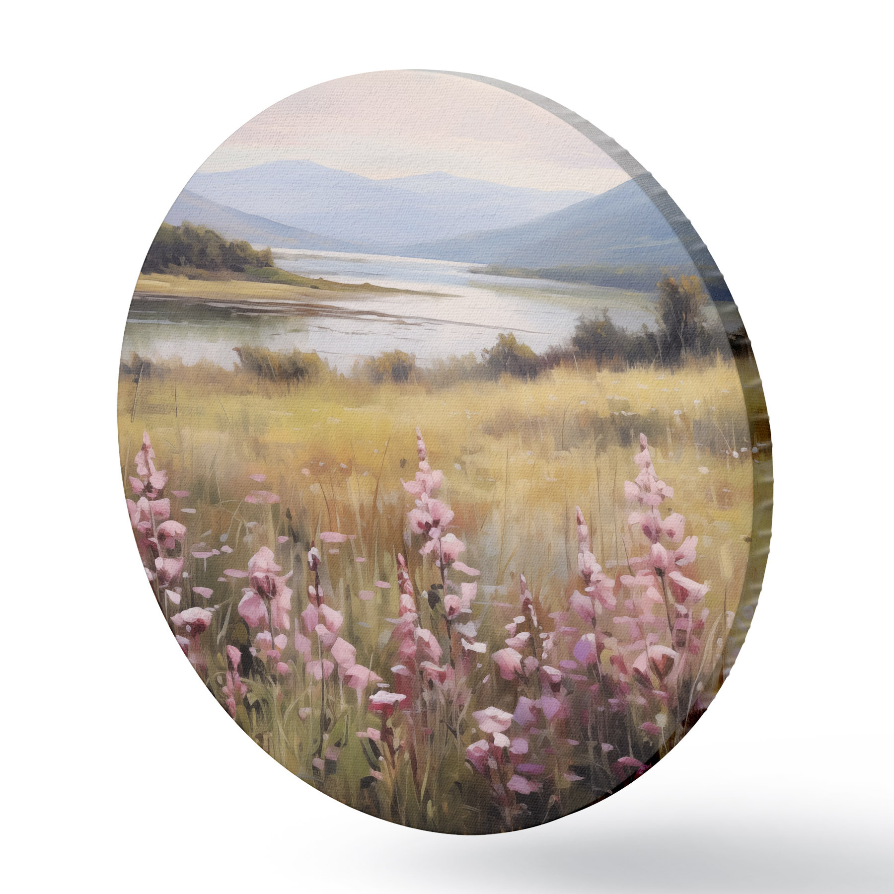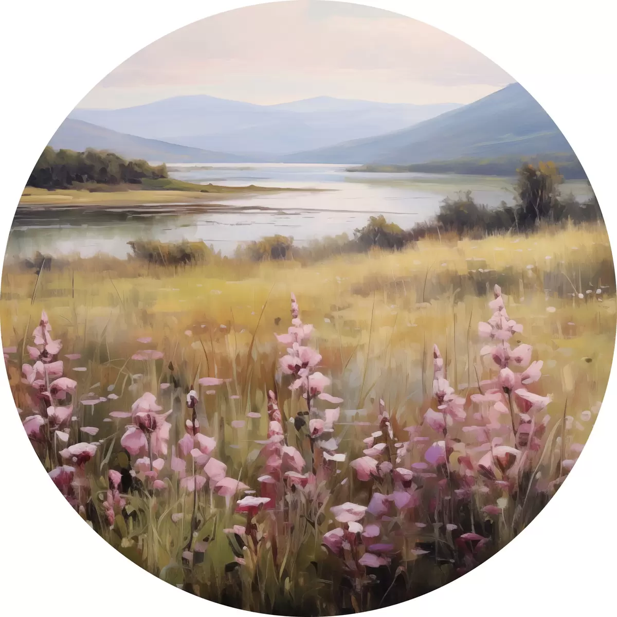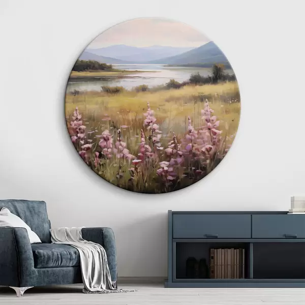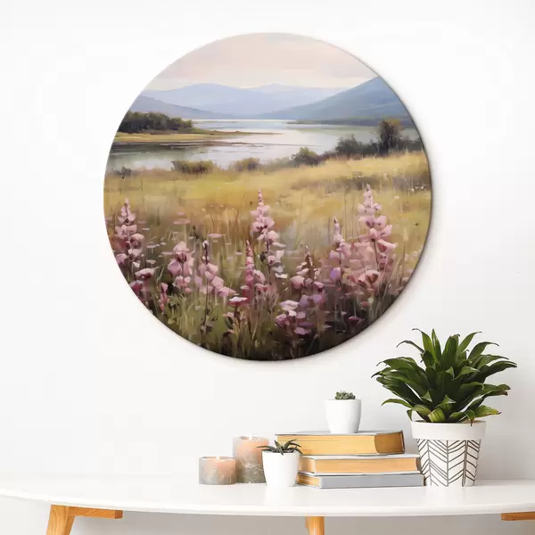 Runde Gemälde Eine Landschaft mit einem Feld von rosa Blumen, einem See und Bergen im Hintergrund, unter einem bewölkten Himmel r43165