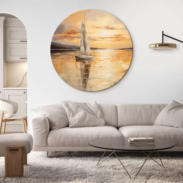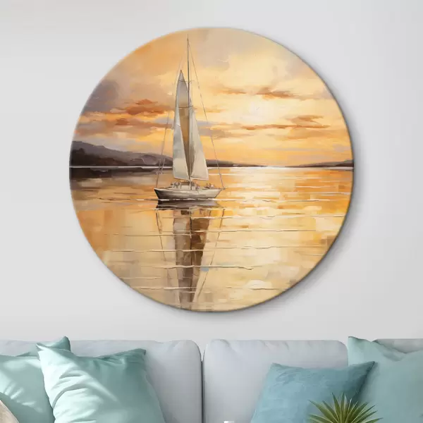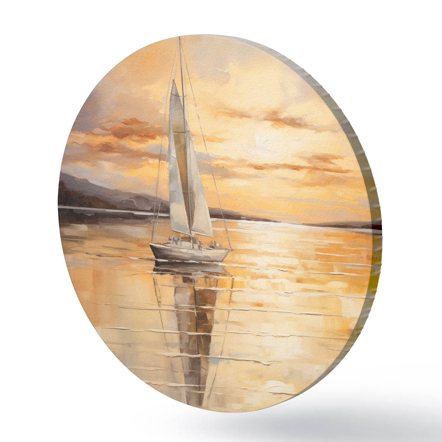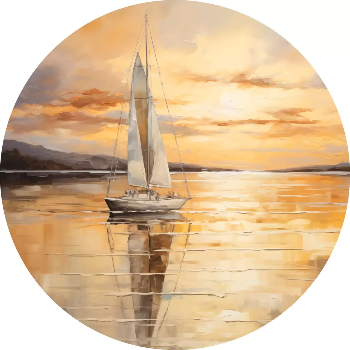 Runde Gemälde Landschaftsgemälde mit einem Segelboot auf ruhiger See, orange-gelbem Himmel und fernen Bergen r43169