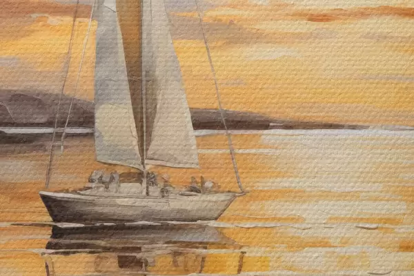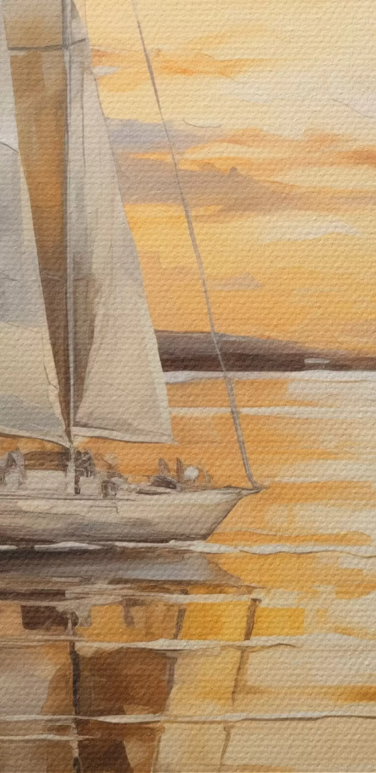 Bild Landschaftsgemälde mit einem Segelboot auf ruhiger See, orange-gelbem Himmel und fernen Bergen Nr r43169