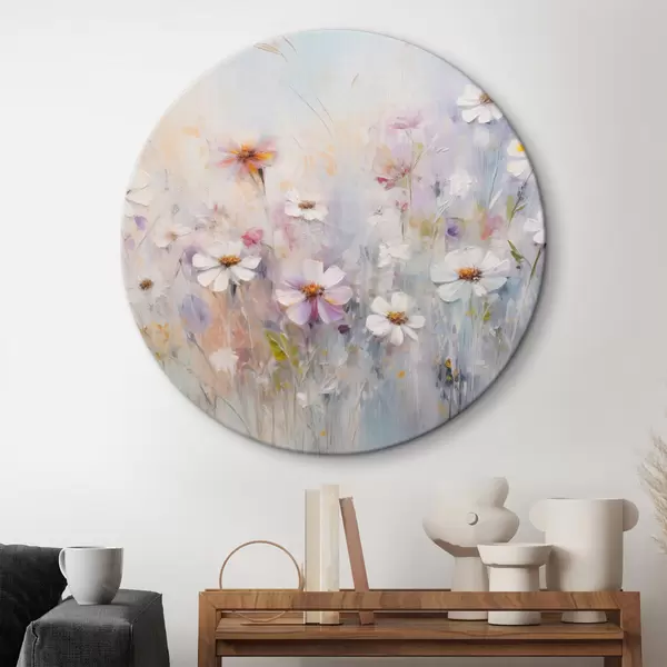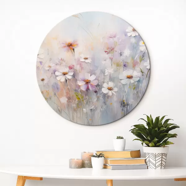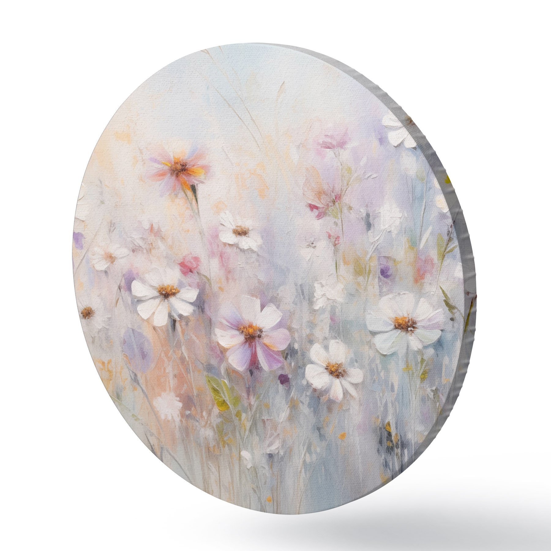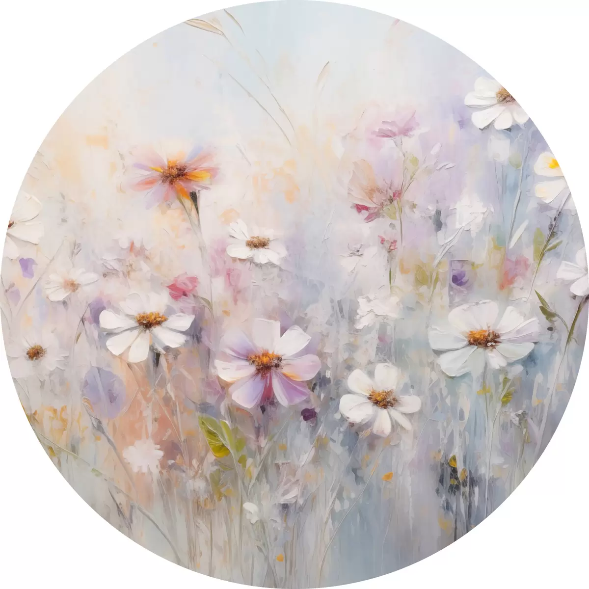 Runde Gemälde Abstraktes, strukturiertes Feld mit weißen und rosa Blumen, weiche Pastellfarben, zarte Pinselstriche, Blumenwiese r43170