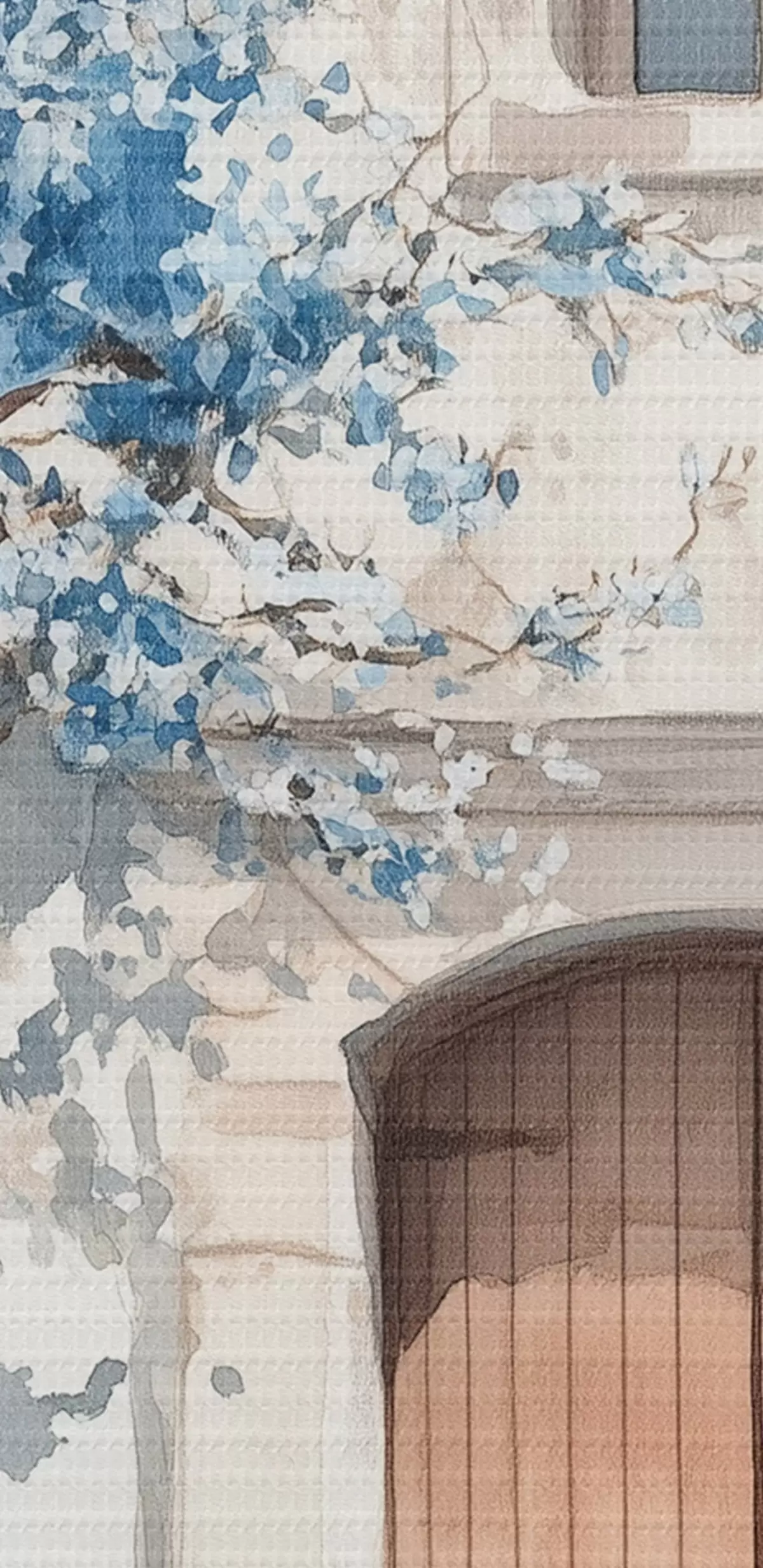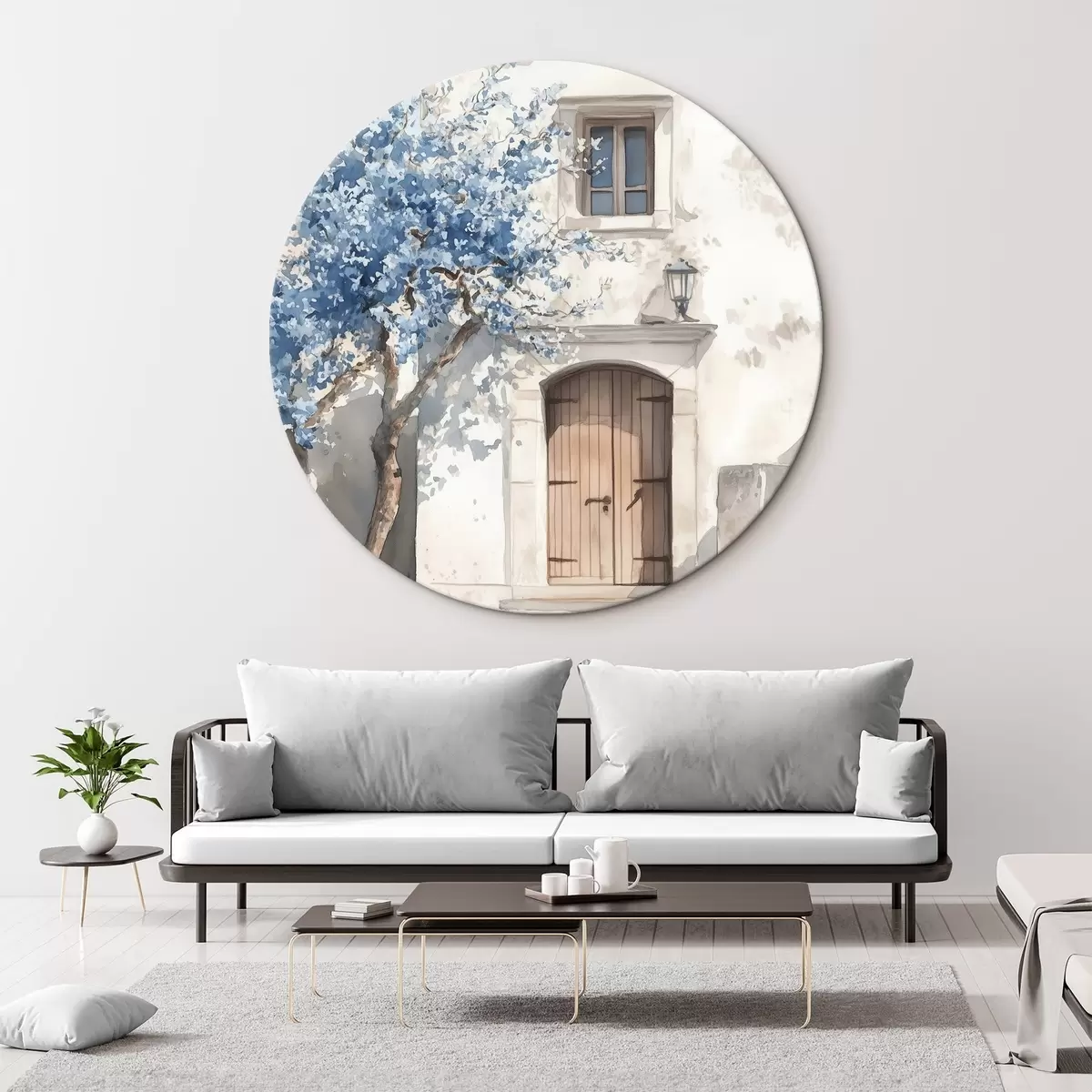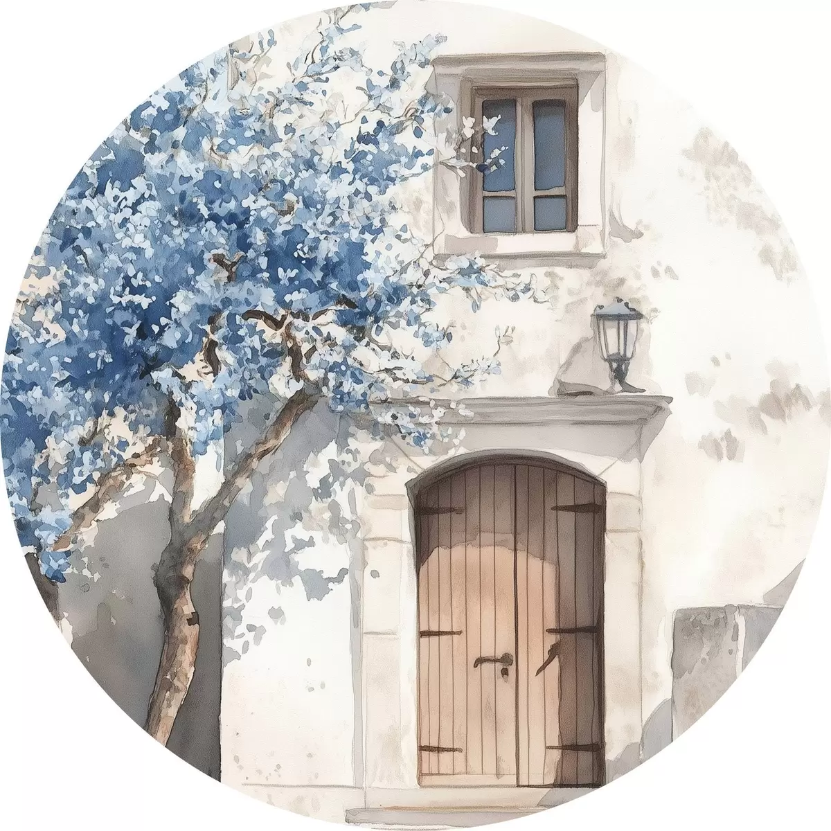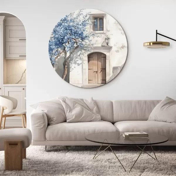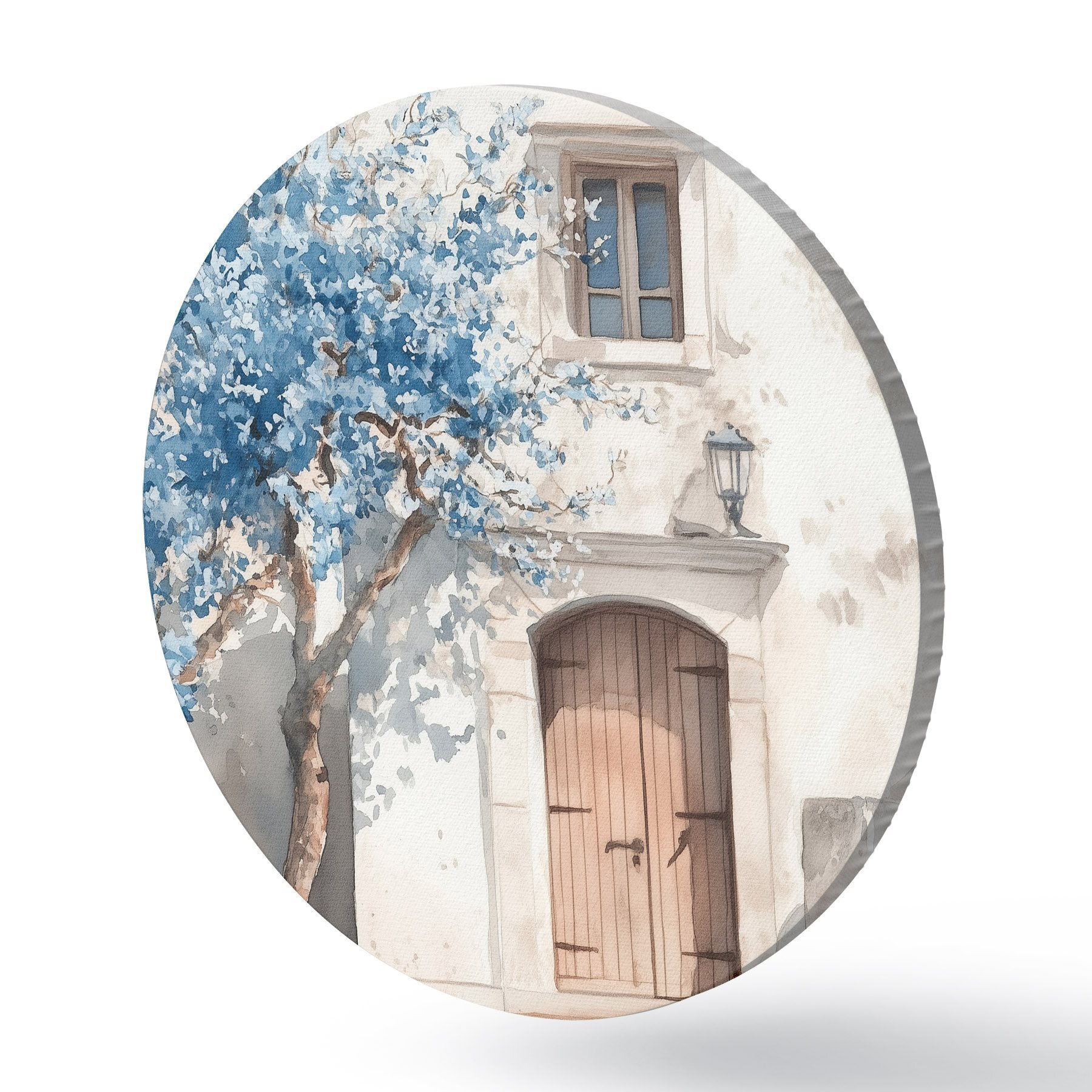 Runde Gemälde Griechisches Haus mit schönem Baum, Architektur, Aquarellstil r43178