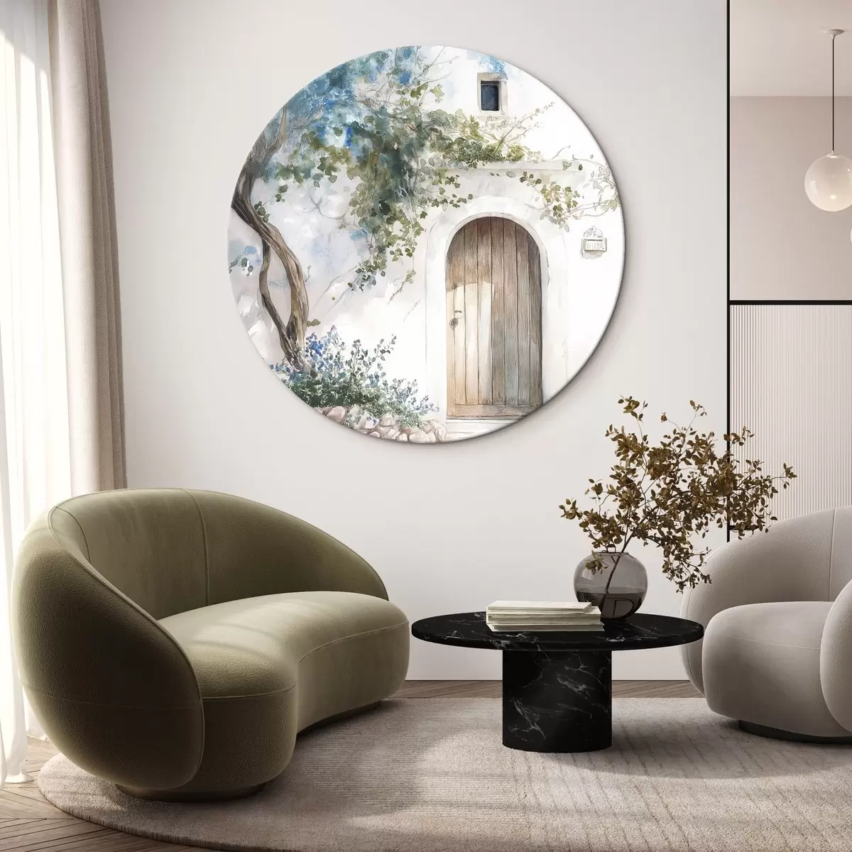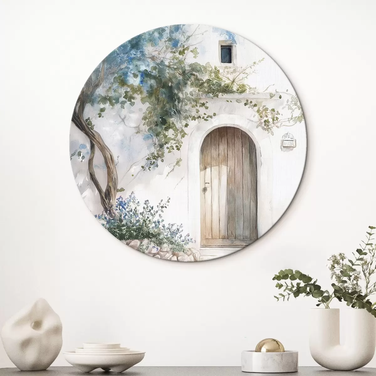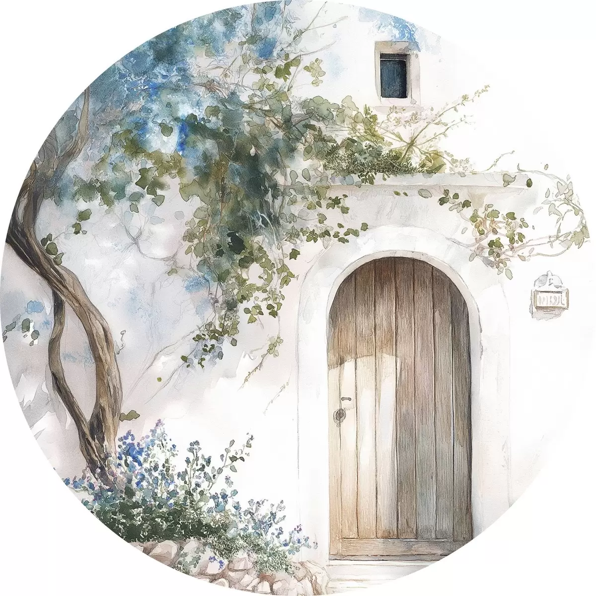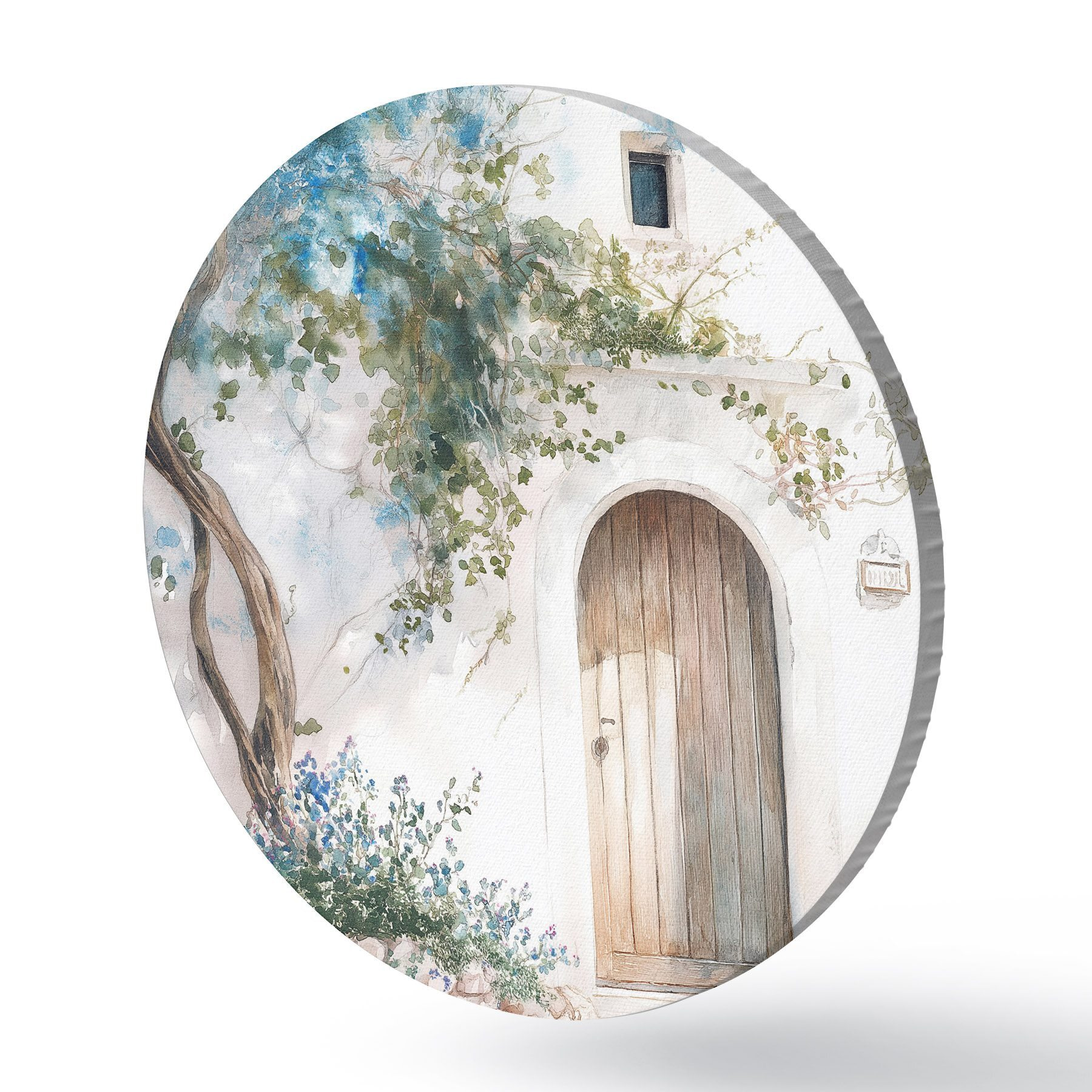 Runde Gemälde Schönes weißes Haus mit blühendem Baum, mediterran, Aquarellstil r43179