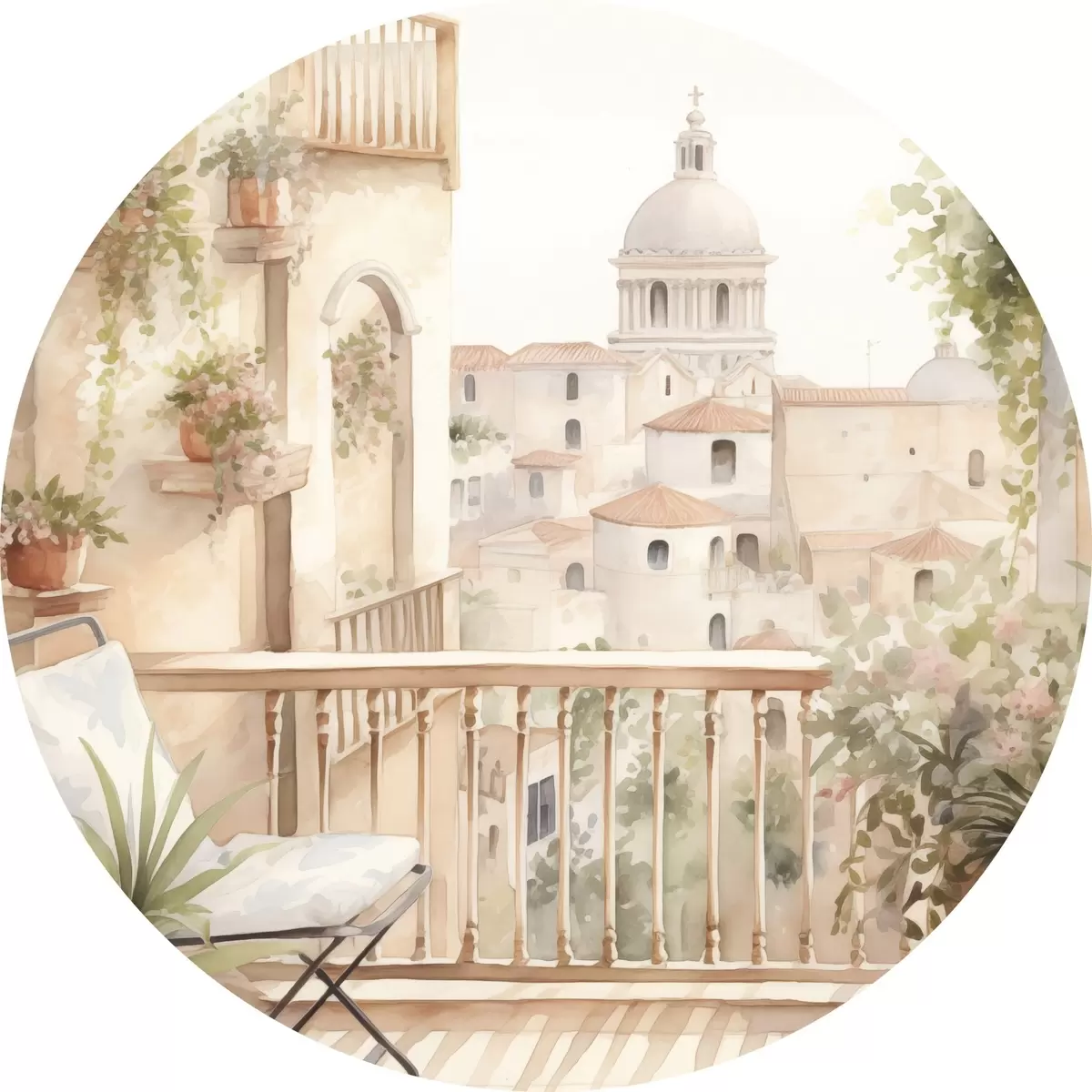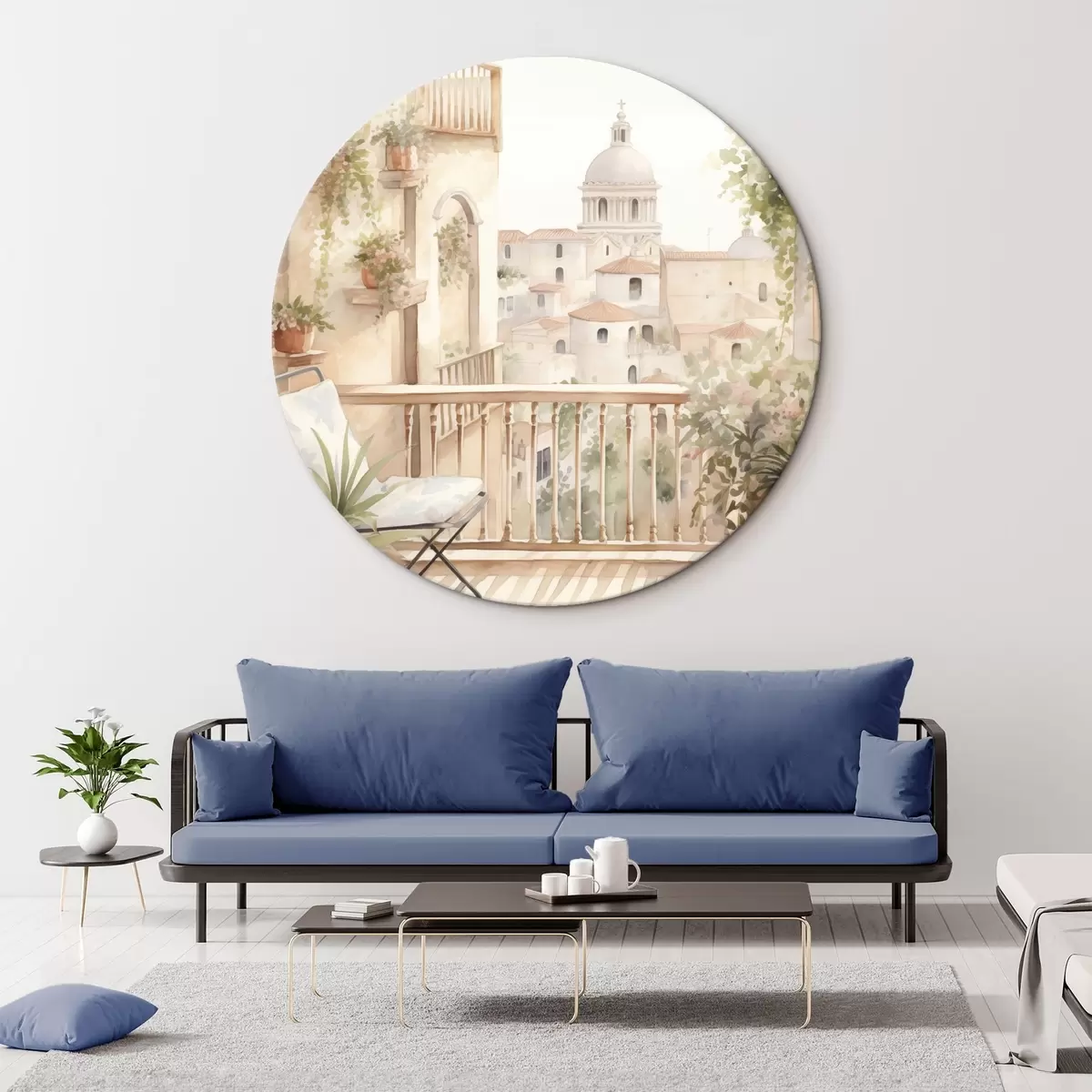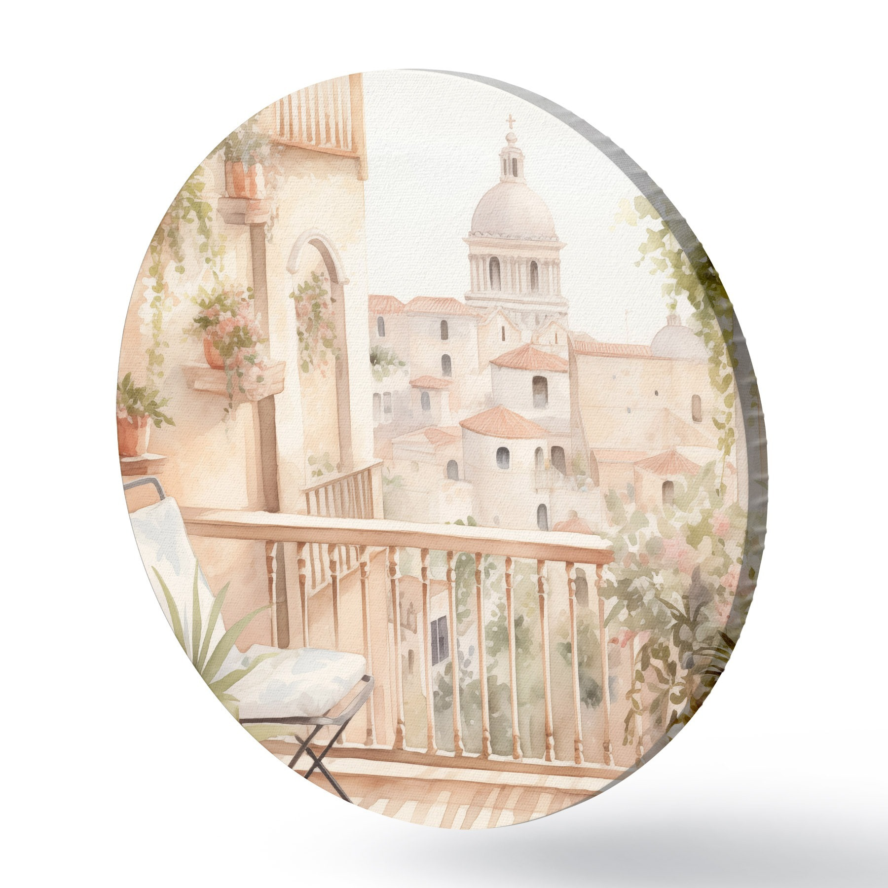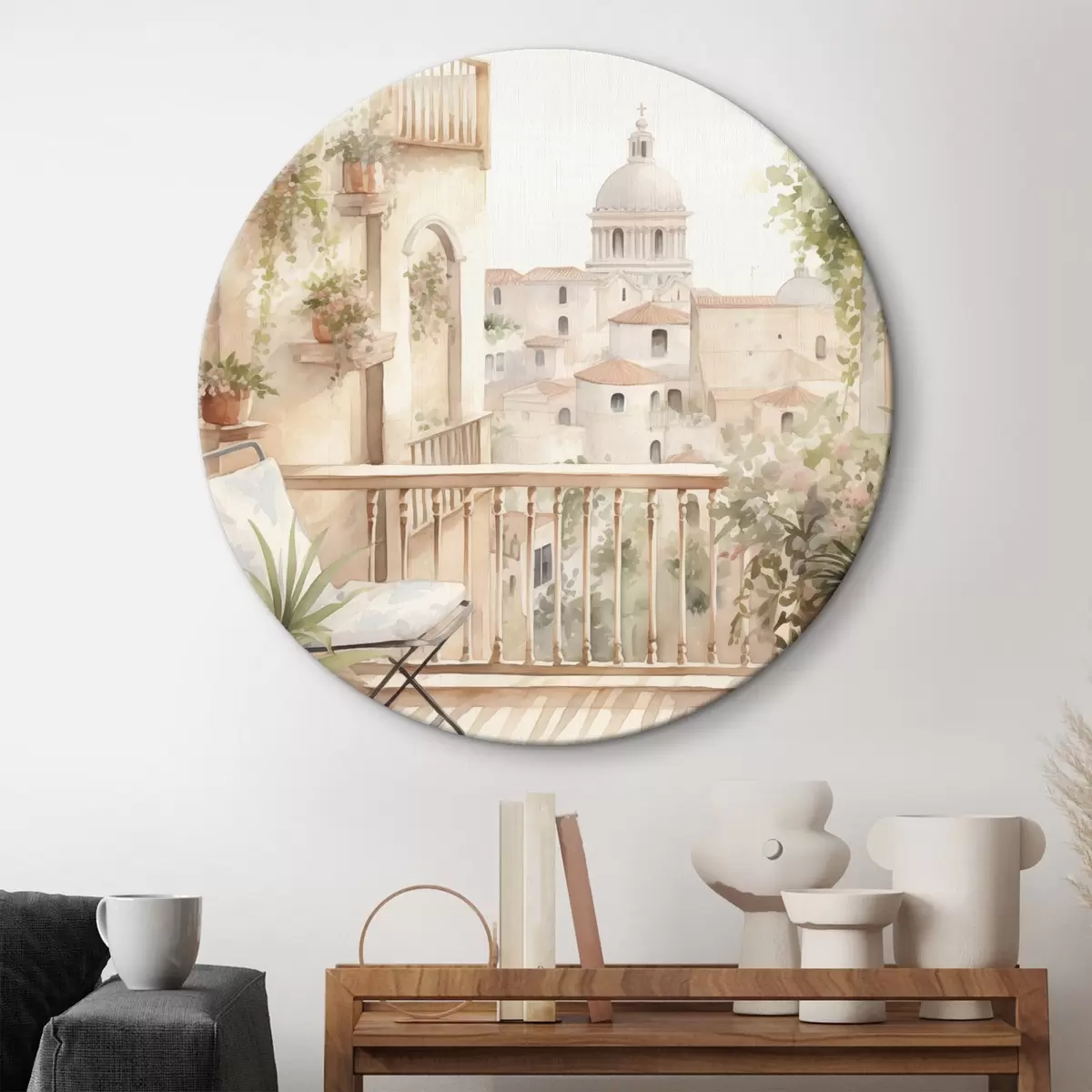 Runde Gemälde Ästhetischer Sommerbalkon, Spanien, alte Architektur, Blomming, Aquarellstil r43180