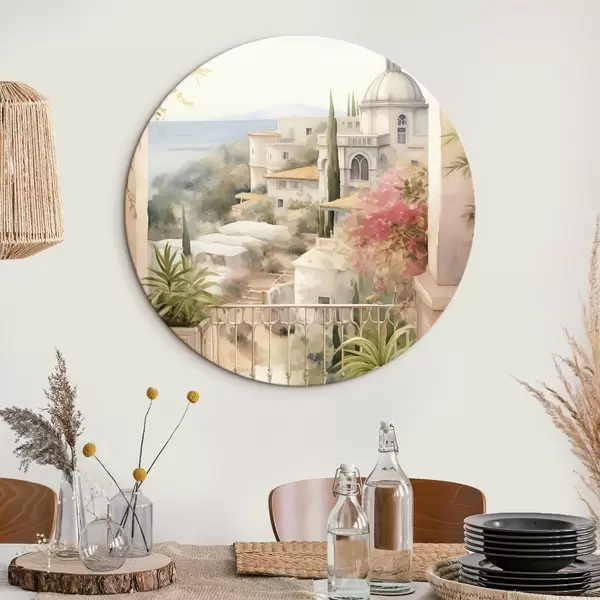 Runde Gemälde Spanien Sommerlandschaft, mediterrane Architektur, Aquarellstil r43181