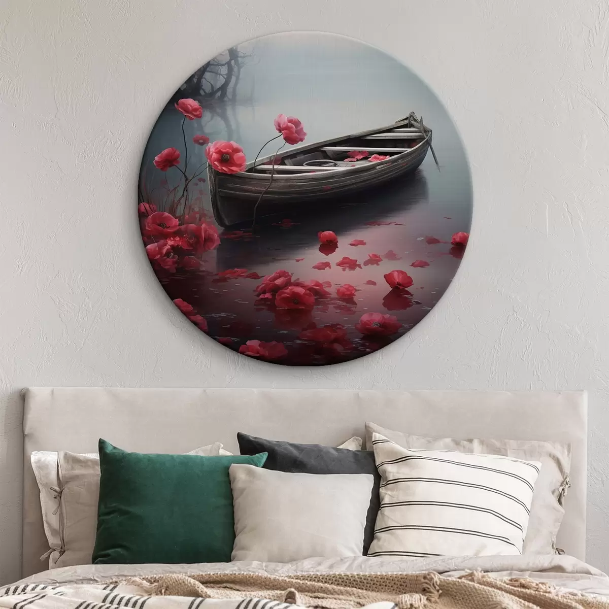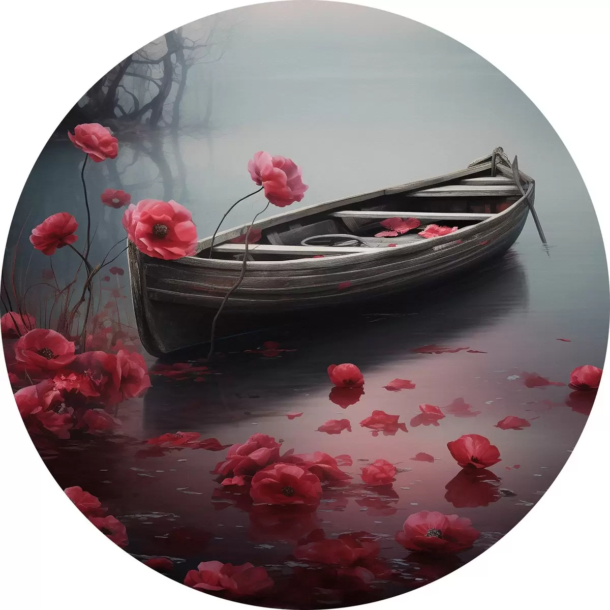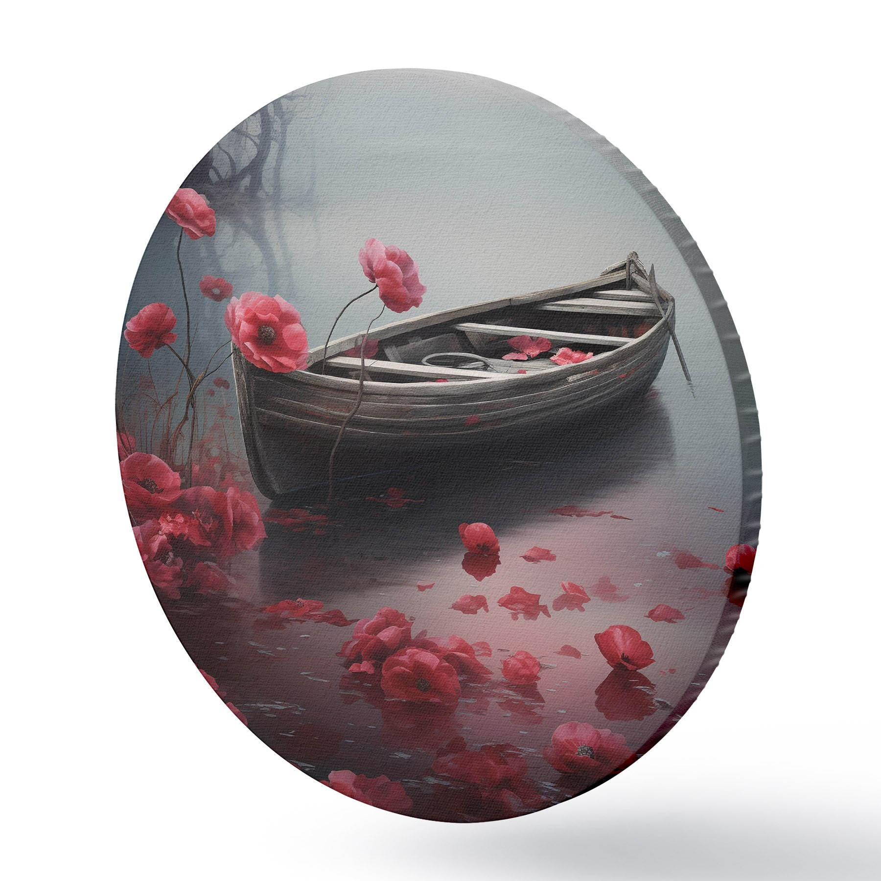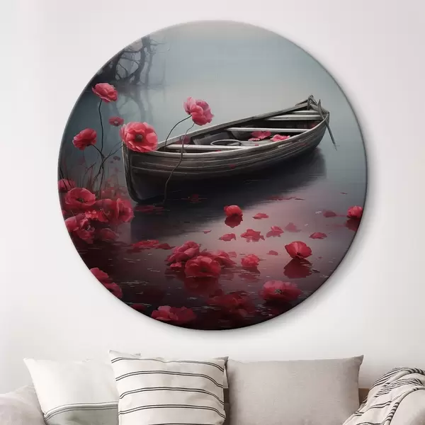 Runde Gemälde Boot und Mohnblumen auf dem See r43203