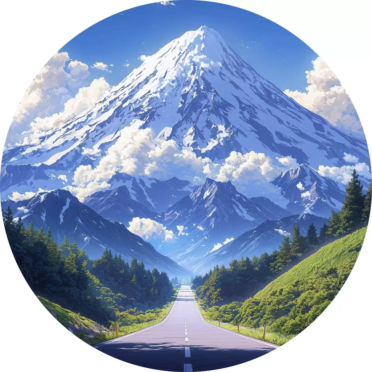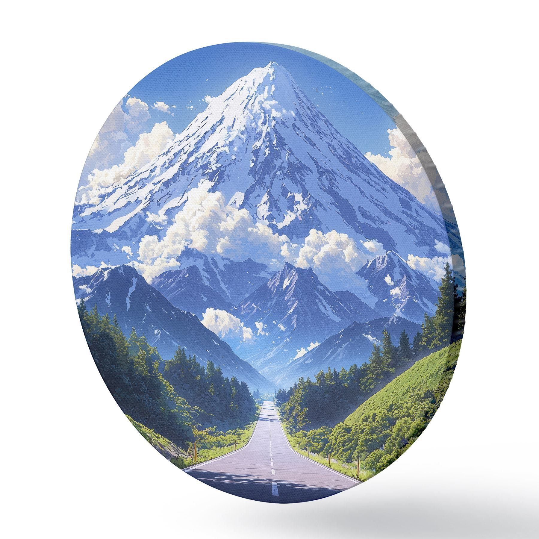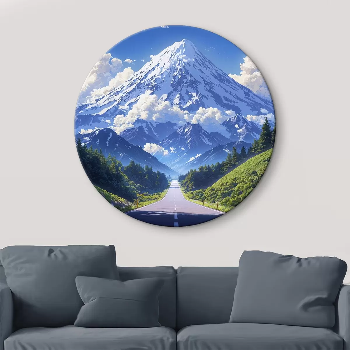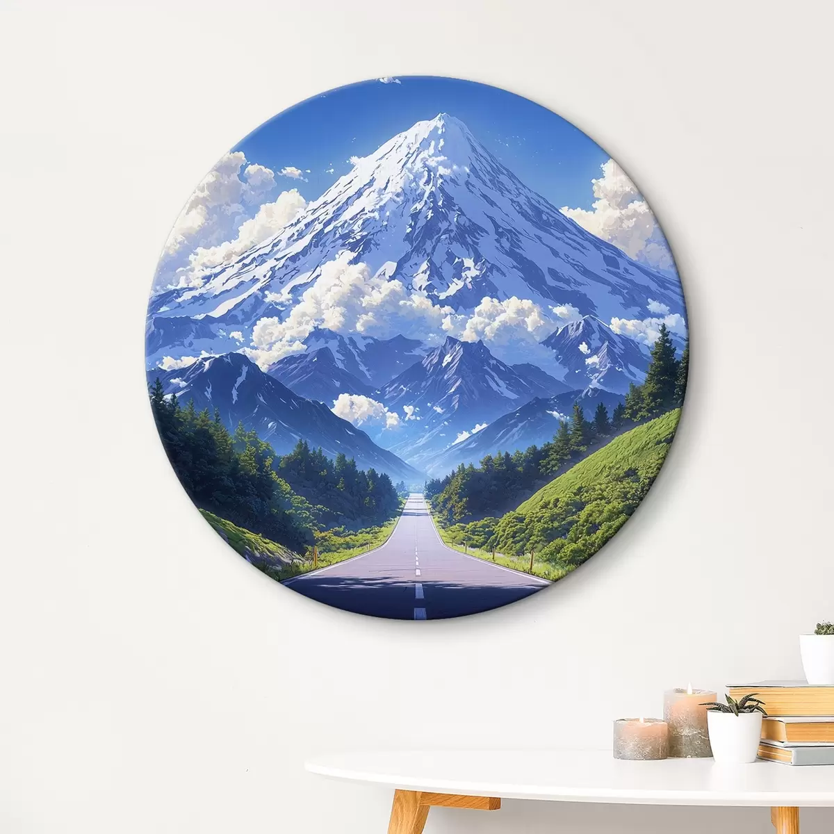 Runde Gemälde Straße in die Berge mit Wolken und Wald ringsum r43317