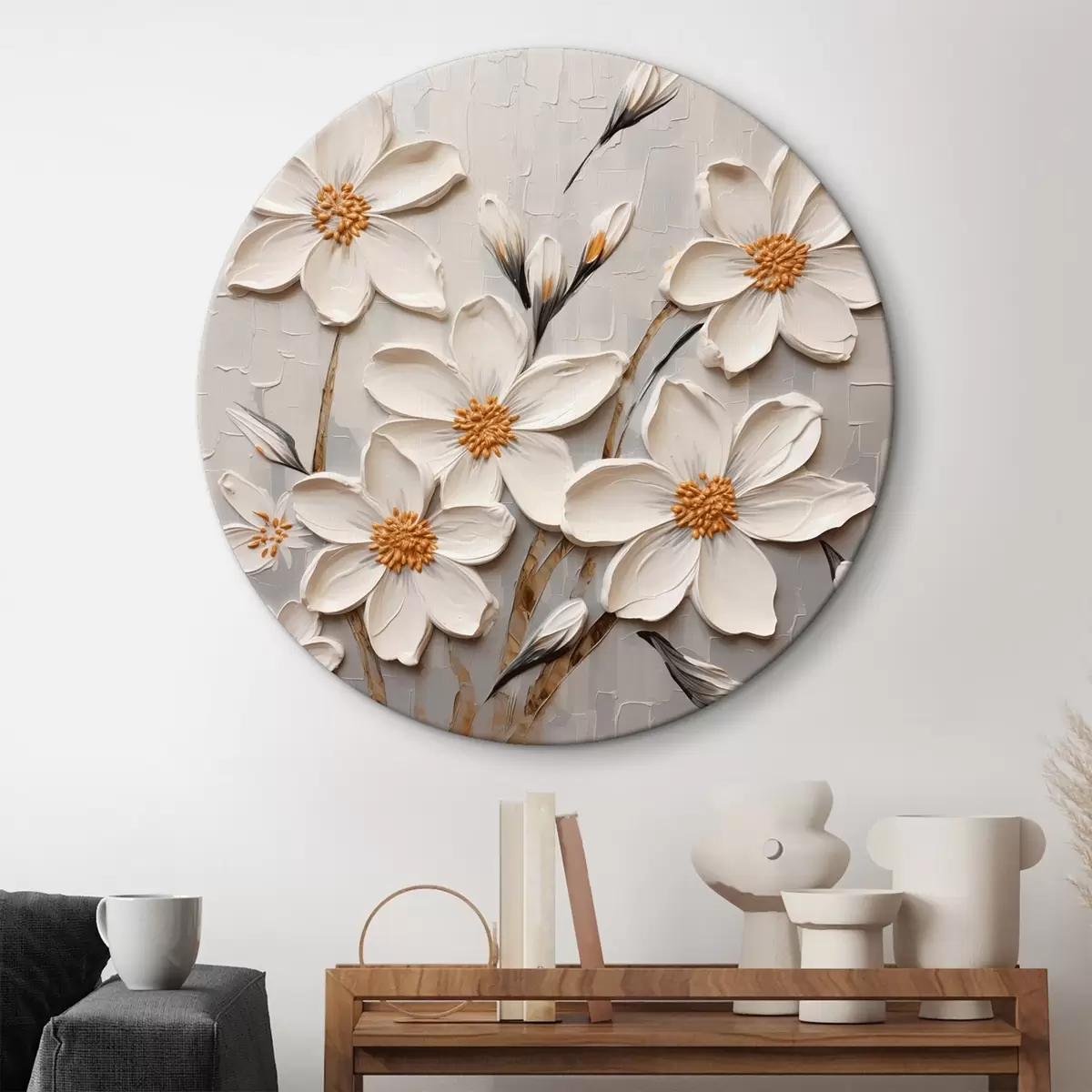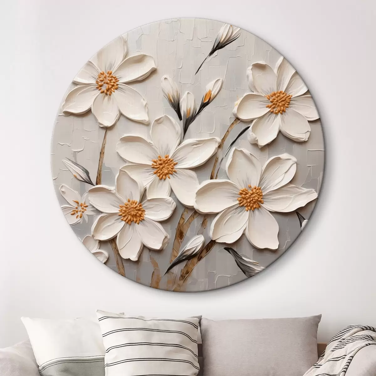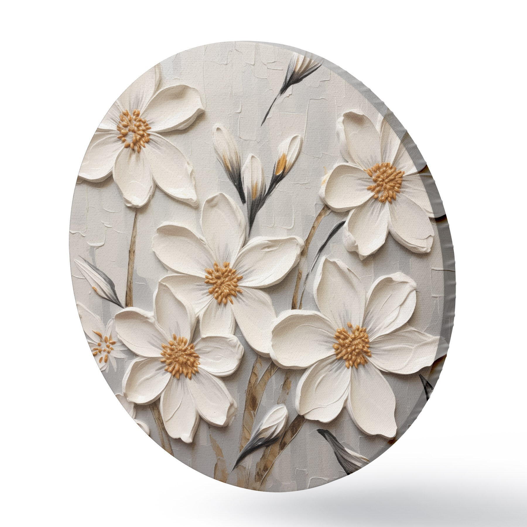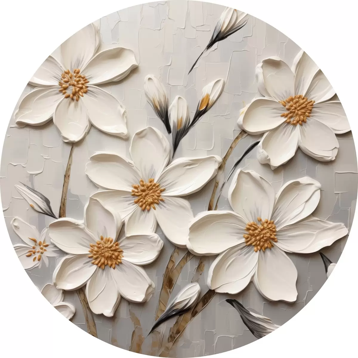 Runde Gemälde Weiße voluminöse Blumen im Malstil mit großen Pinselstrichen r43366