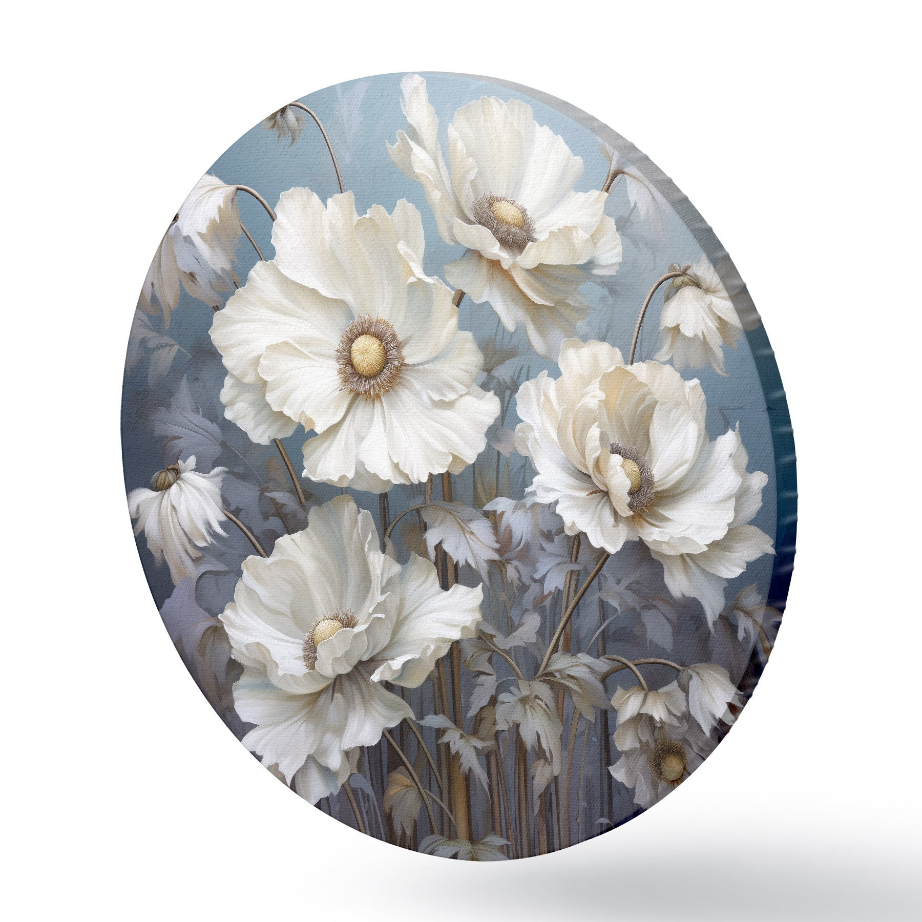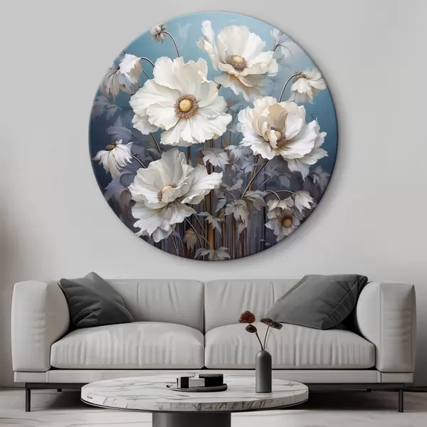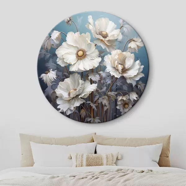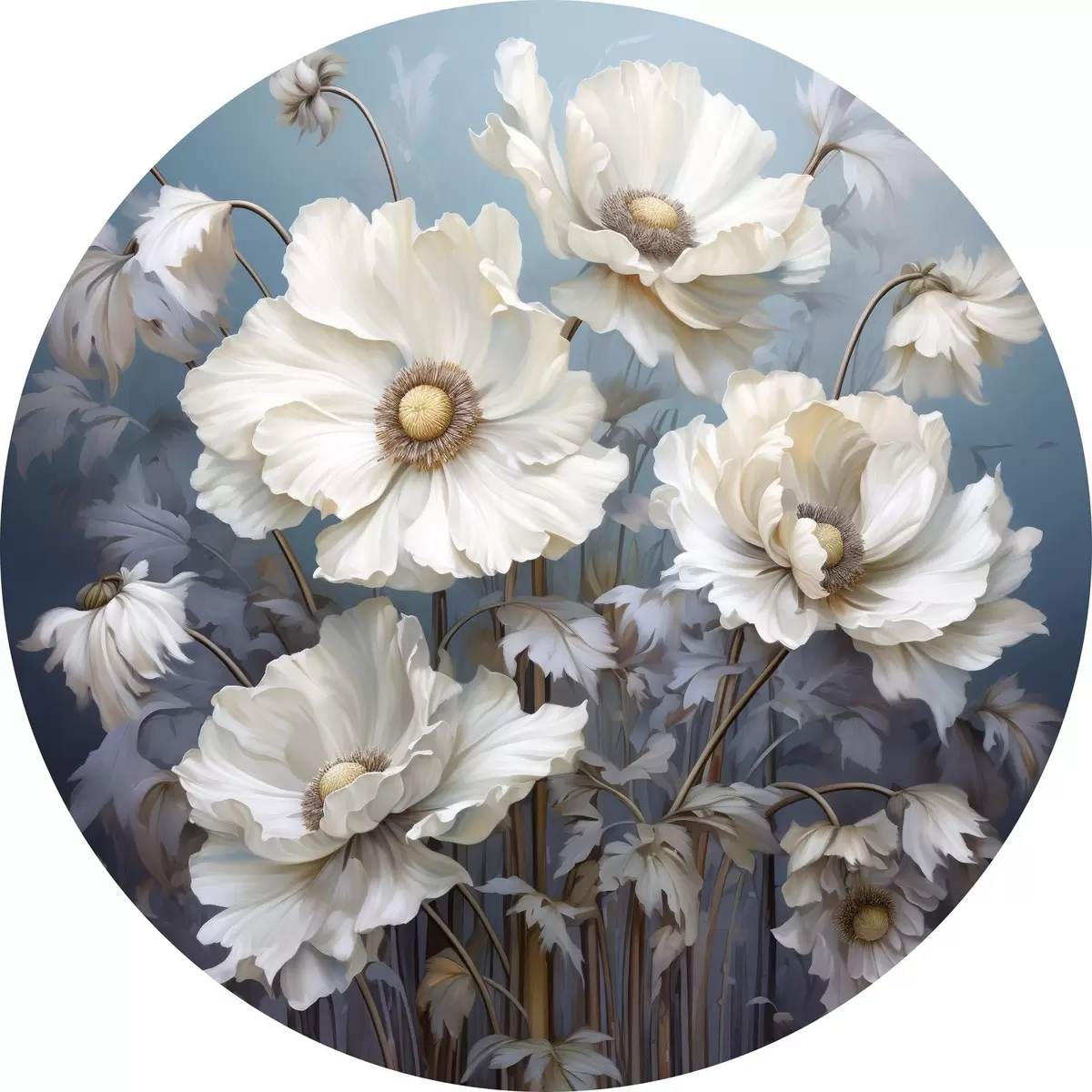 Runde Gemälde Weißer Blumenstrauß aus Pfingstrosen auf blauem Hintergrund im Malstil r43370