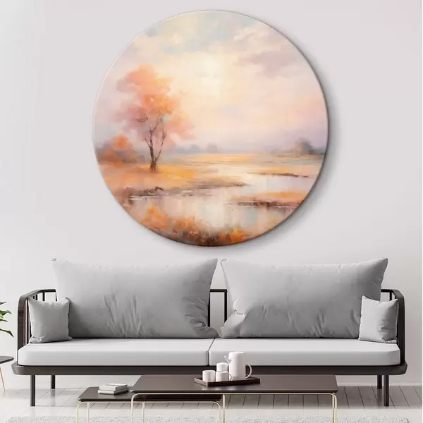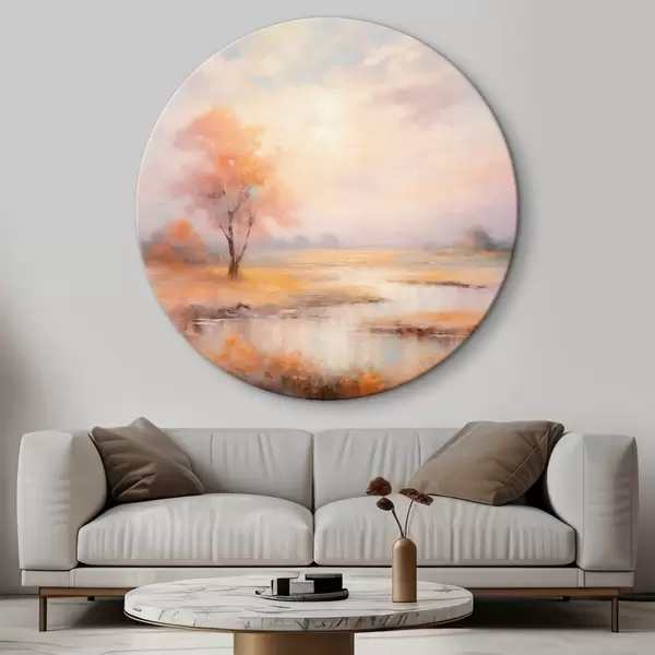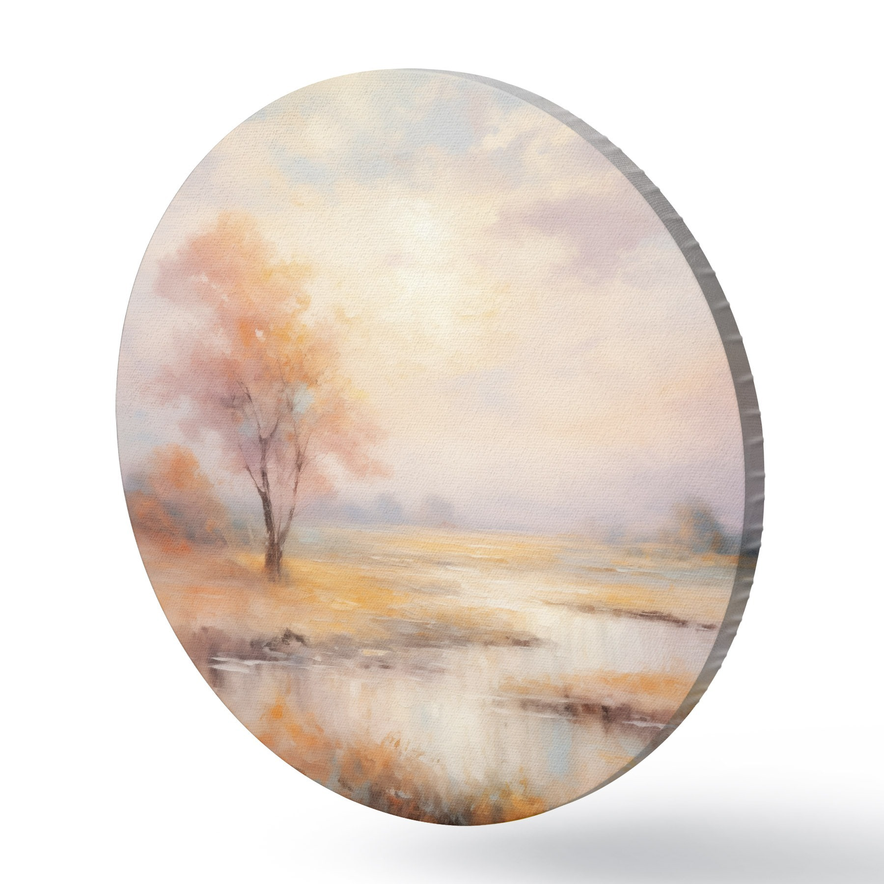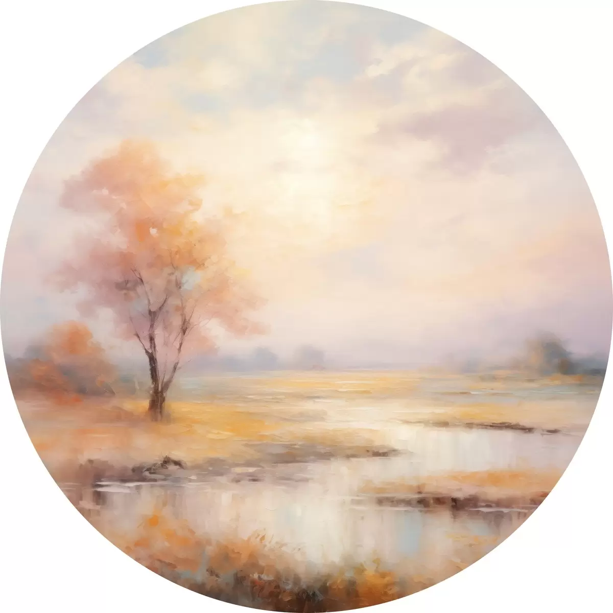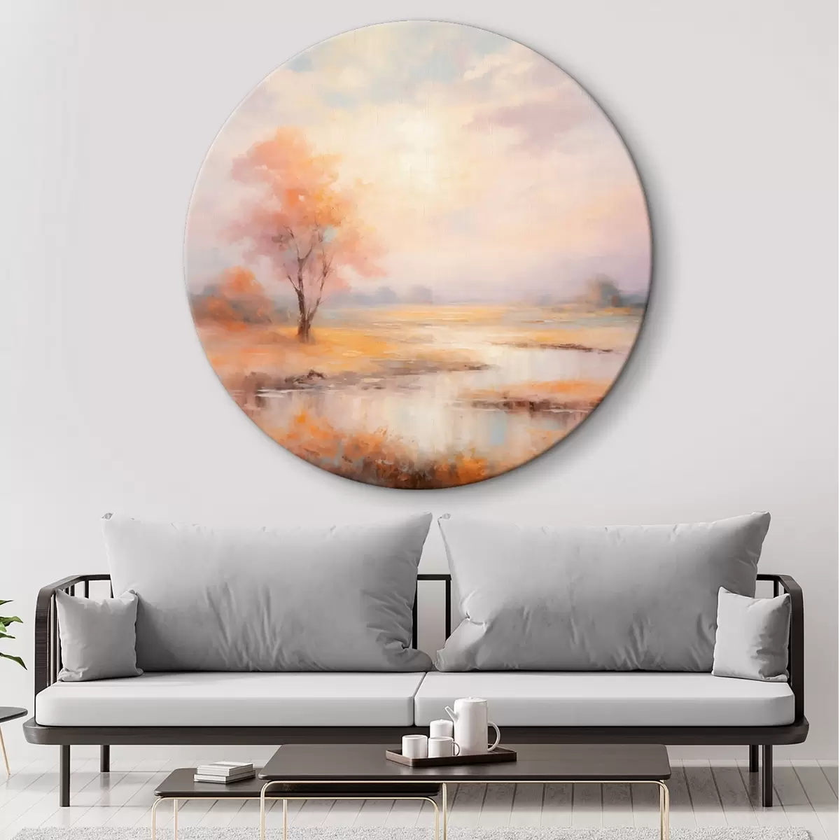 Runde Gemälde Landschaft in warmen Farbtönen mit einem Fluss und einem Baum r43375