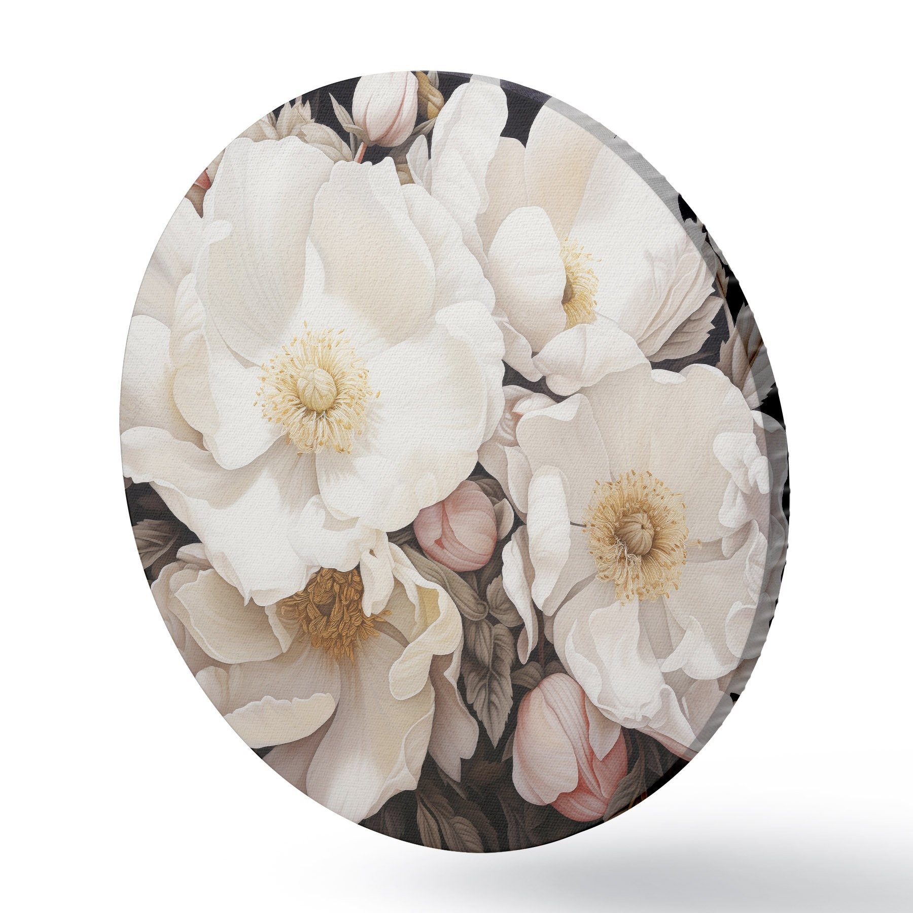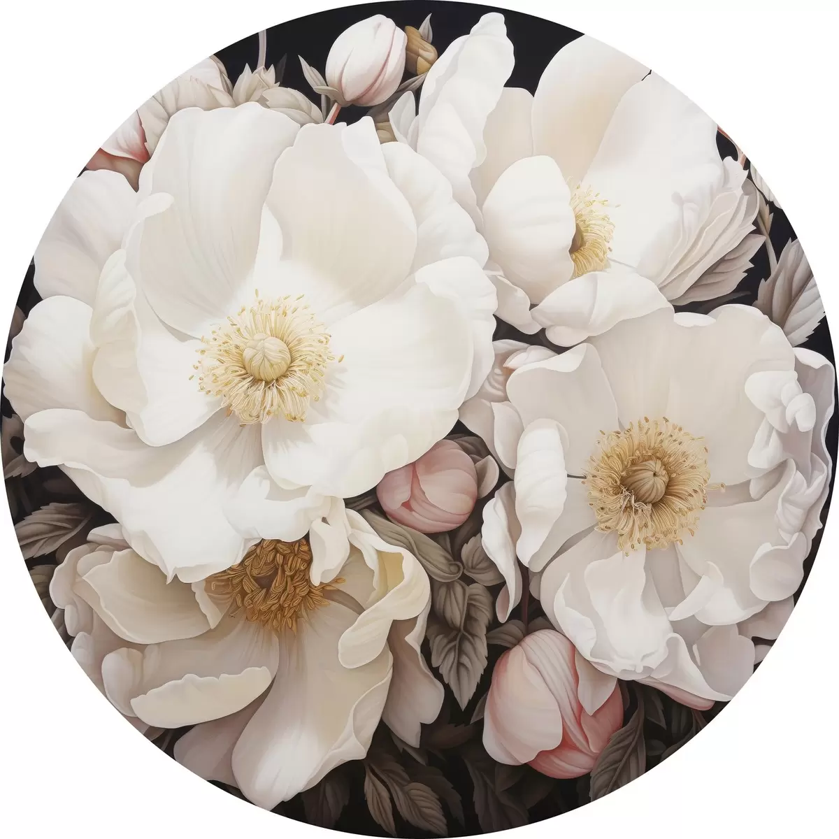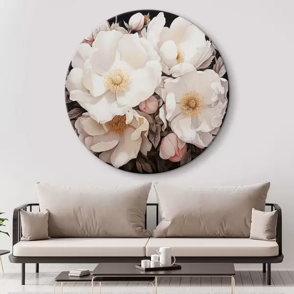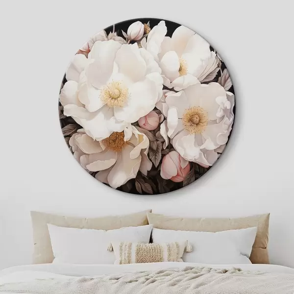 Runde Gemälde Weiße Pfingstrose Blumen auf einem dunklen Hintergrund in Acrylmalerei Stil r43379