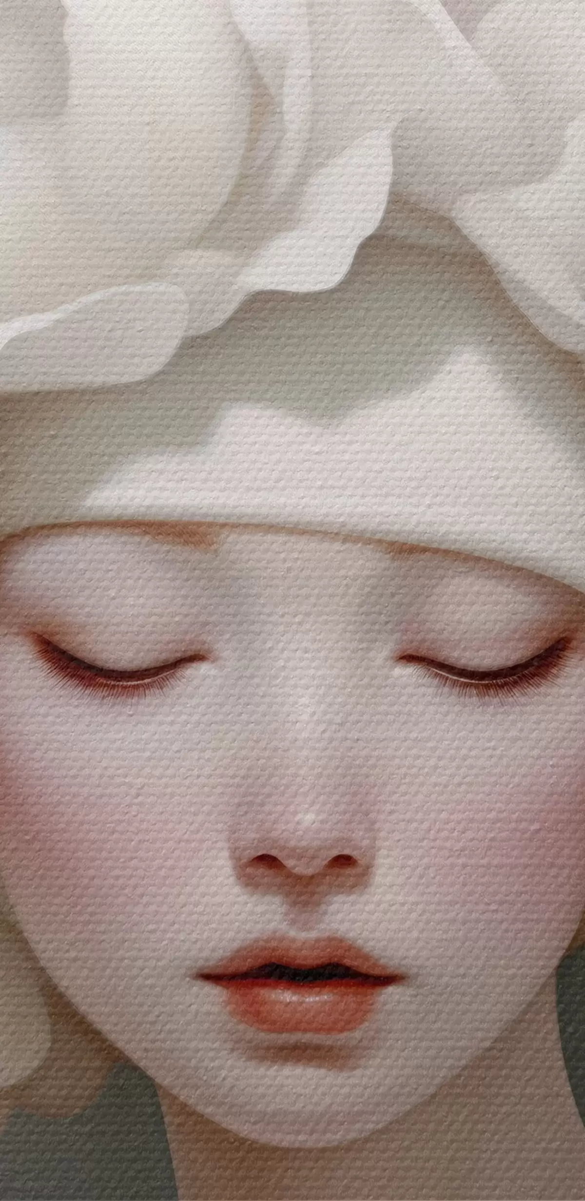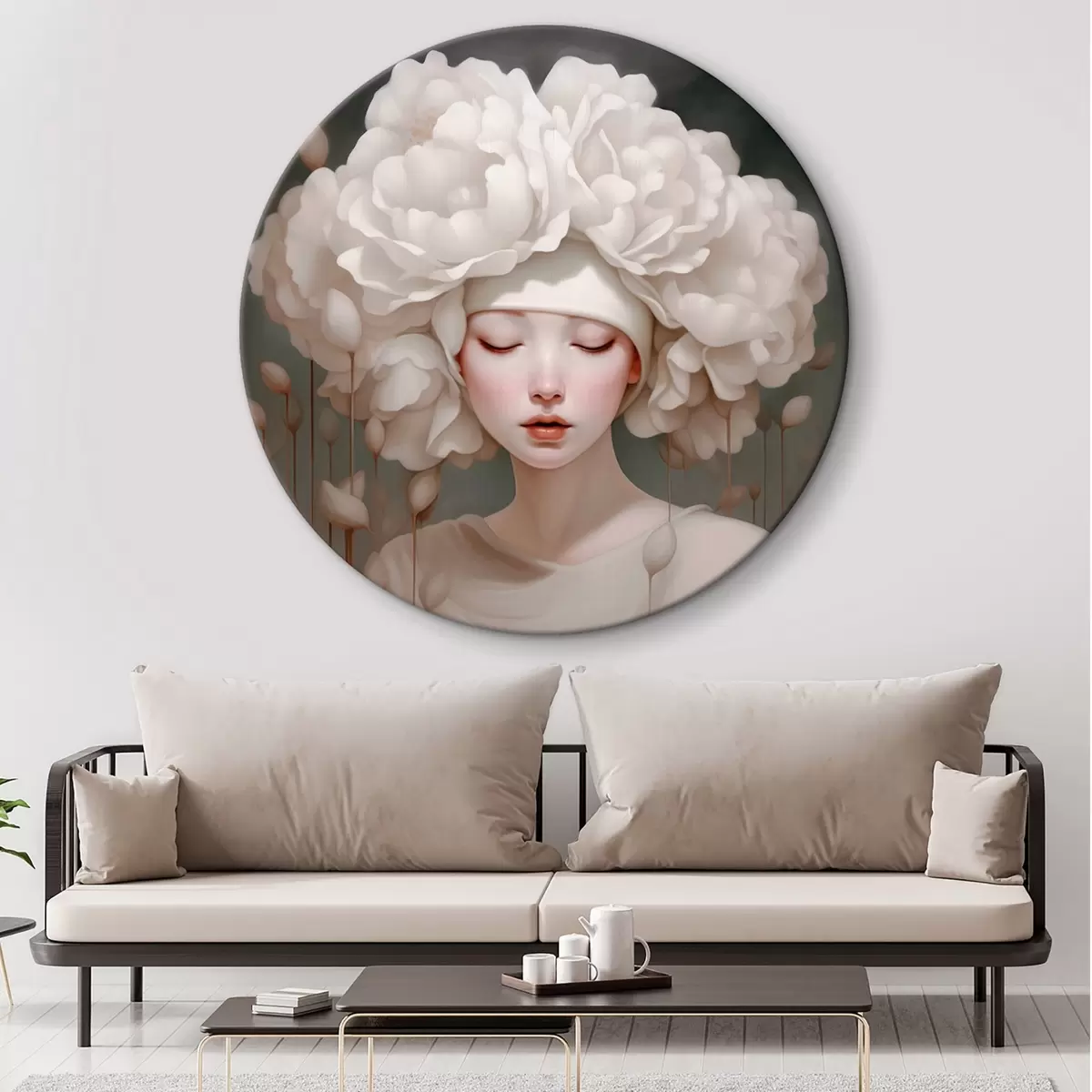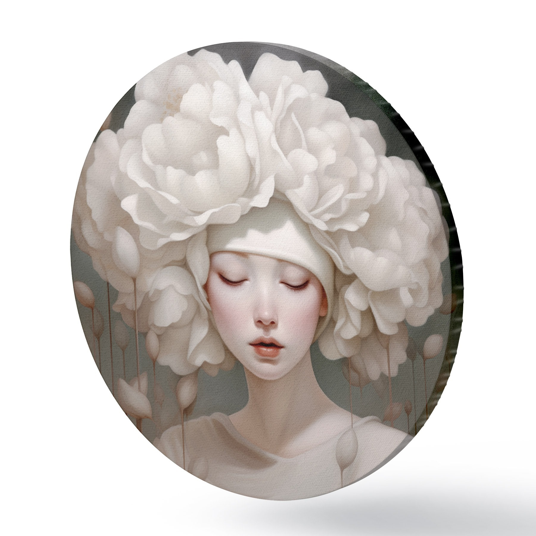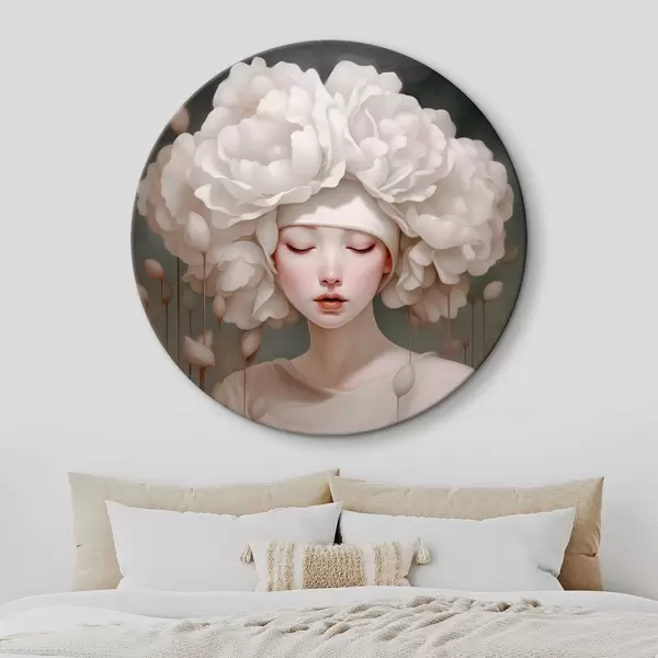Runde Gemälde Mädchen mit Blumen auf dem Kopf in sanften Tönen r43385