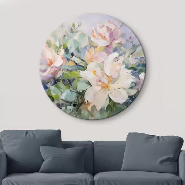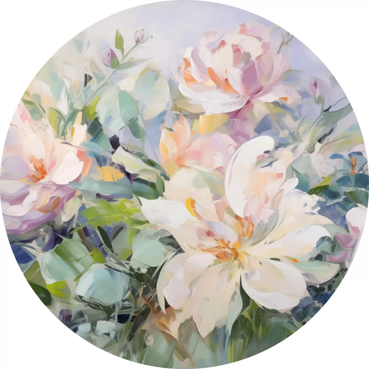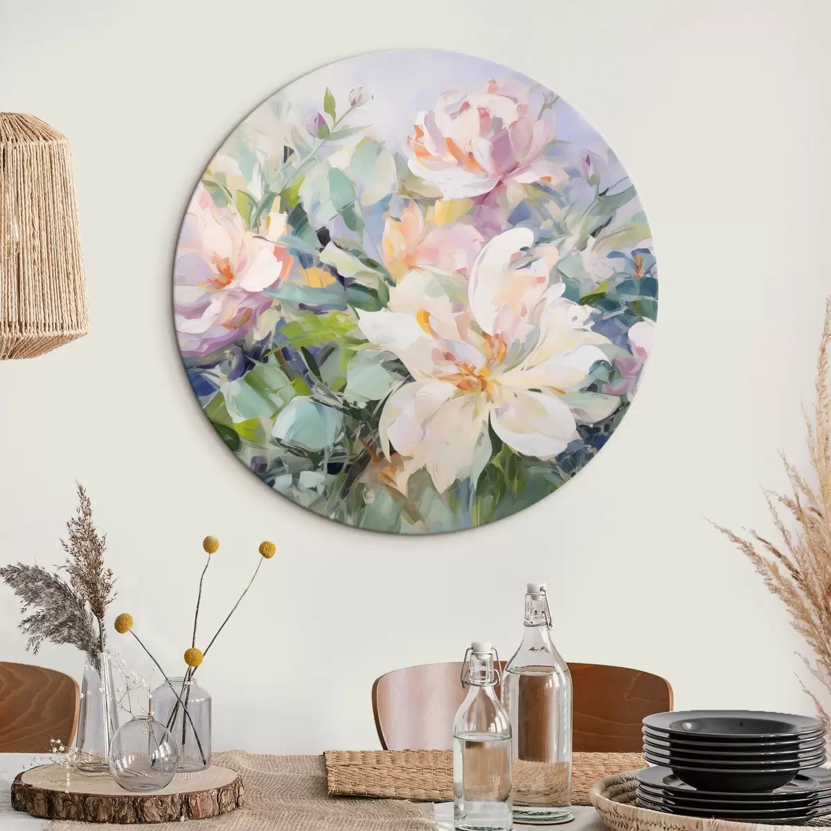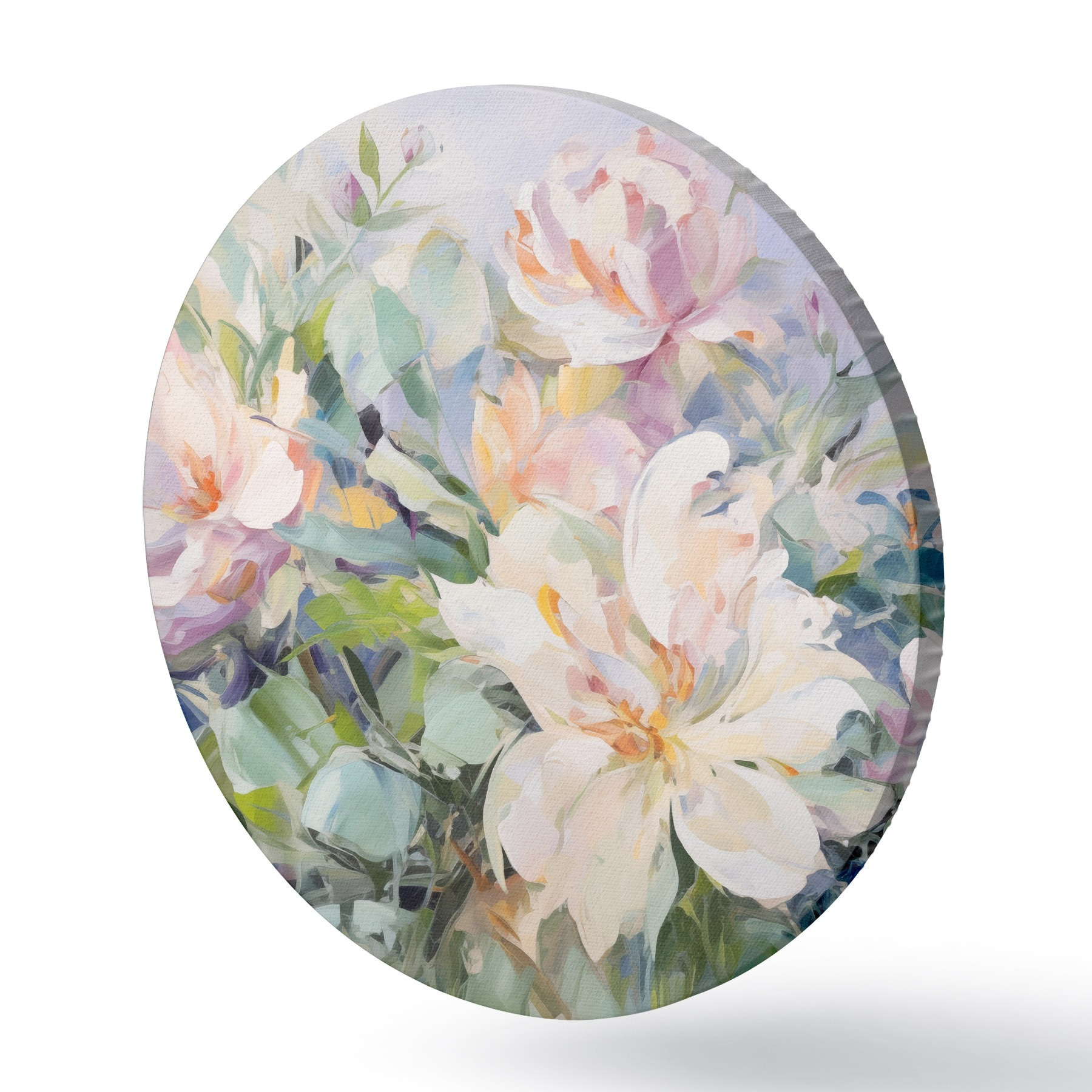 Runde Gemälde Ein Blumenarrangement mit pastellfarbenen Blumen und blauen Blättern, Ölgemälde-Imitation r43390