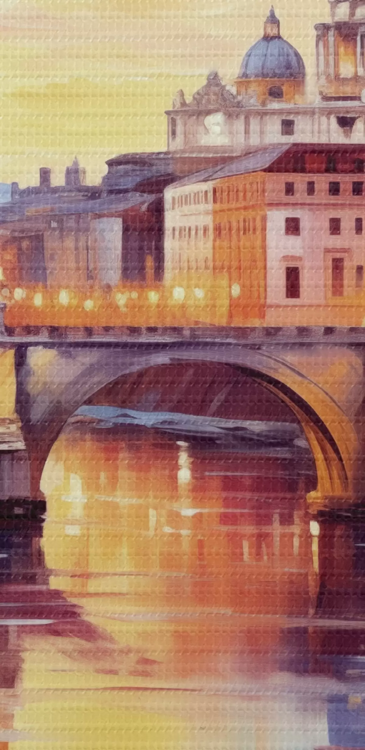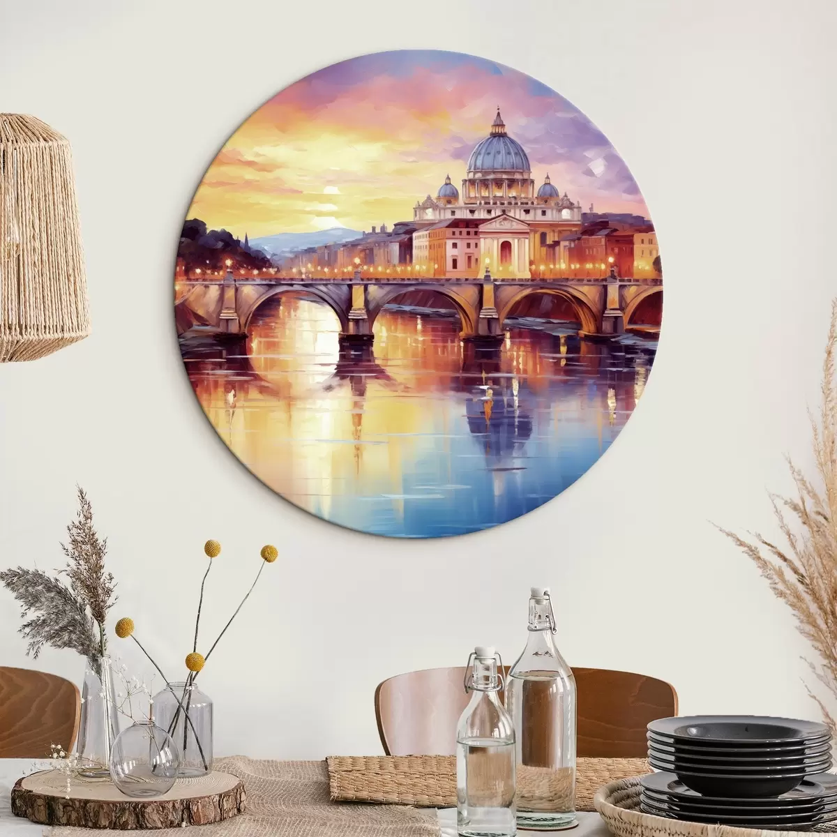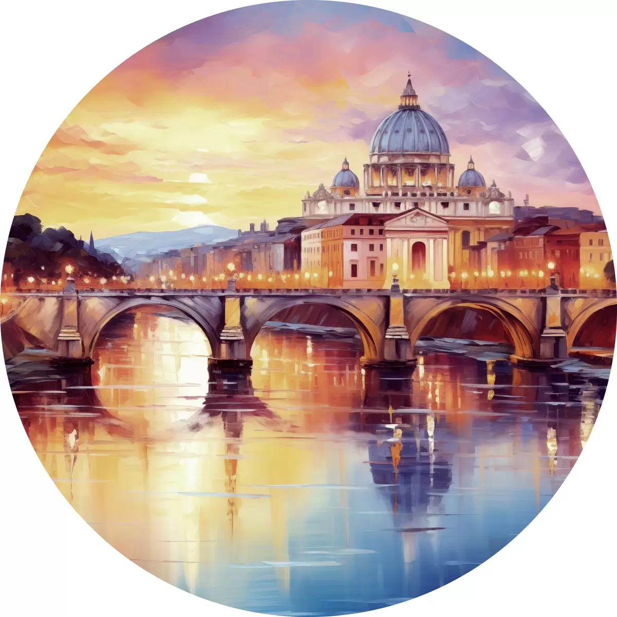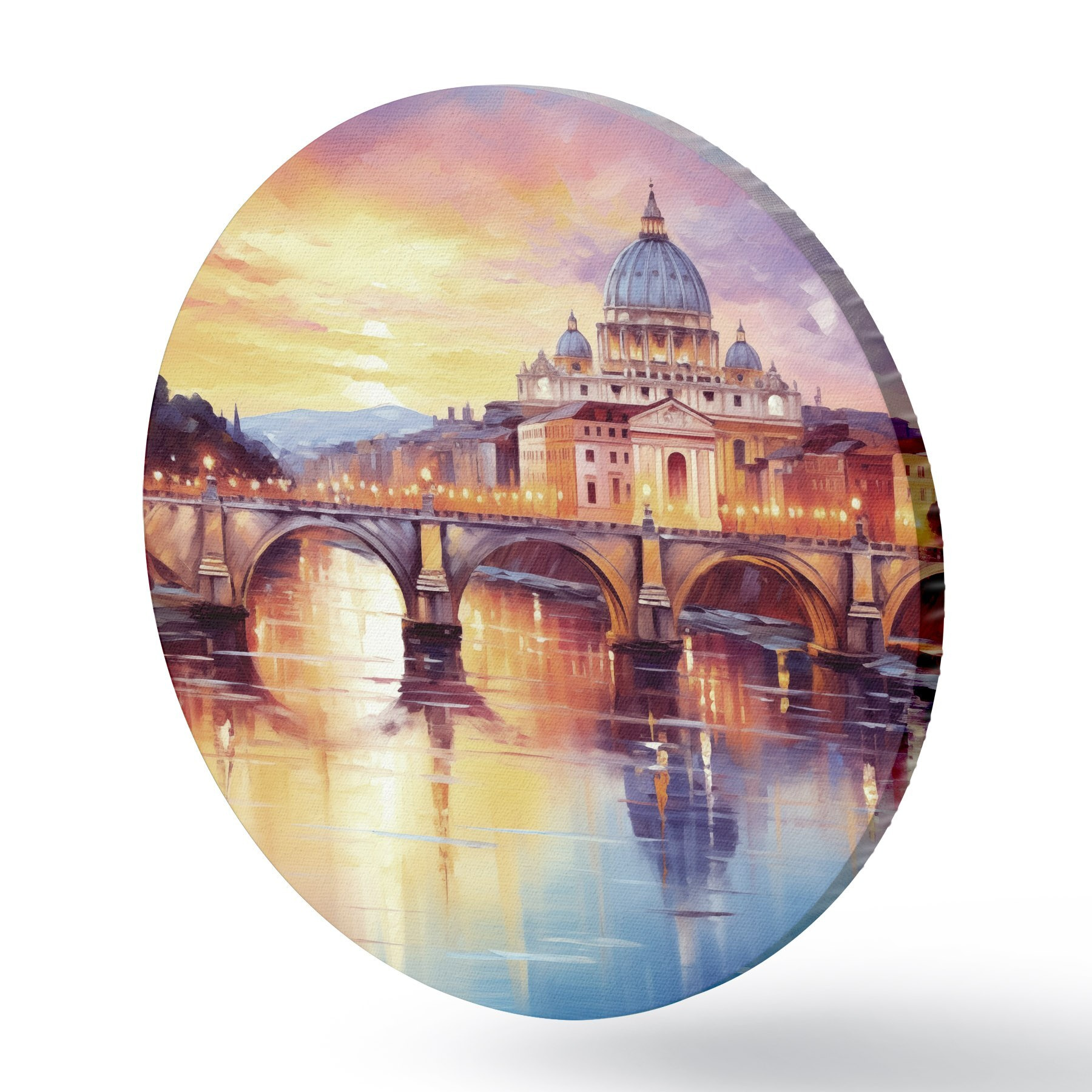 Runde Gemälde Petersdom und Brücke über den Fluss bei Sonnenuntergang, warme Farben, Reflexion im Wasser, Ölgemälde Stil r43396