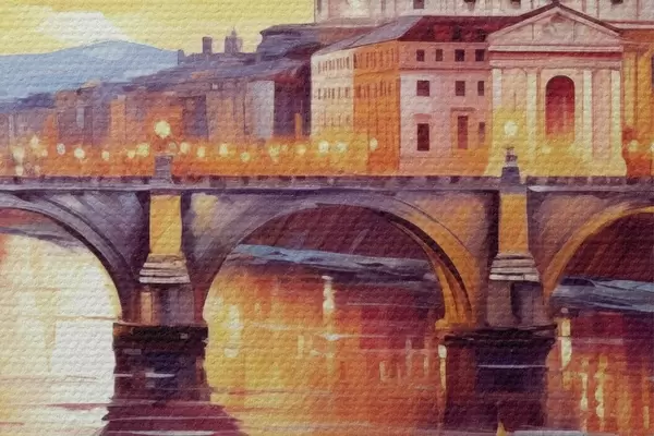Bild Petersdom und Brücke über den Fluss bei Sonnenuntergang, warme Farben, Reflexion im Wasser, Ölgemälde Stil Nr r43396