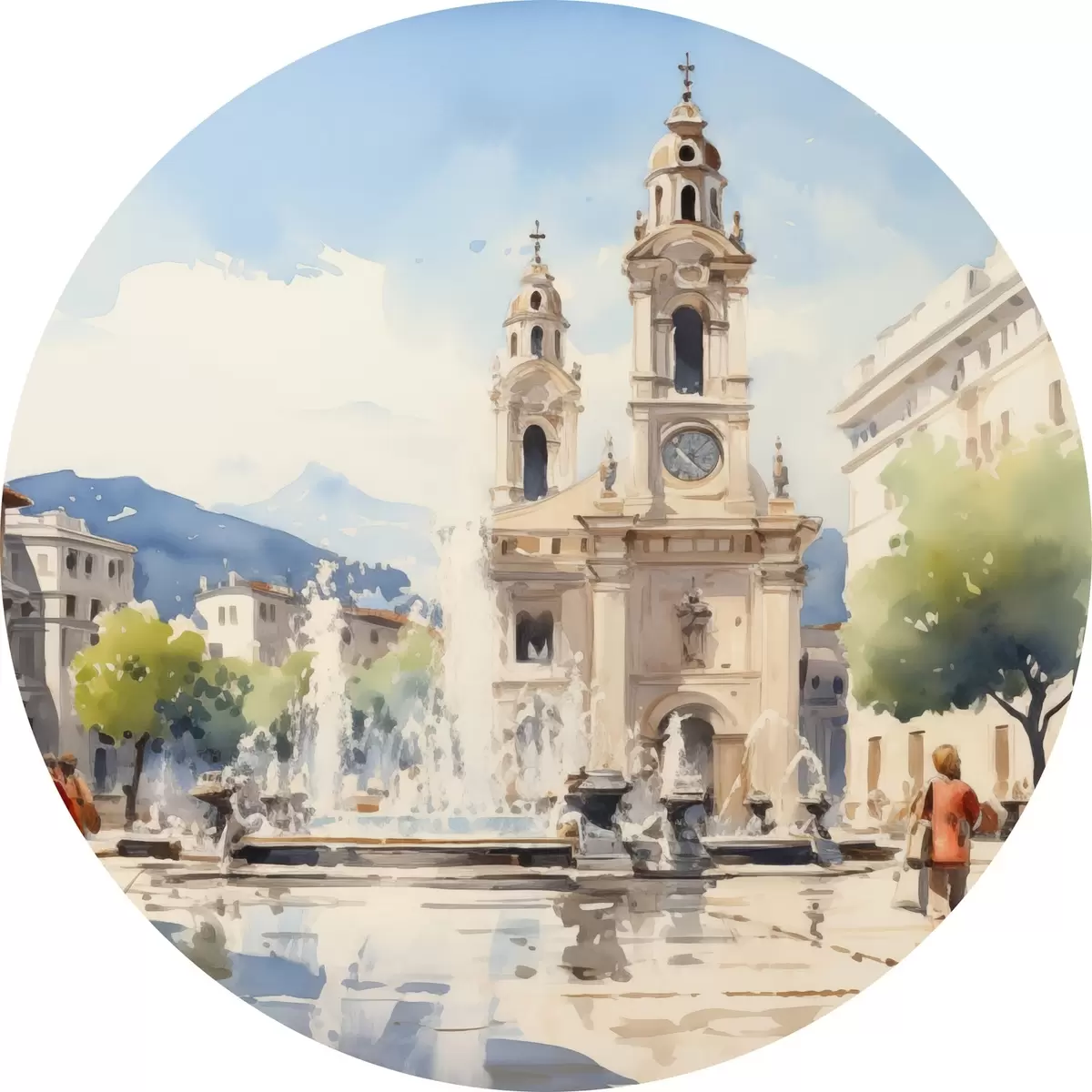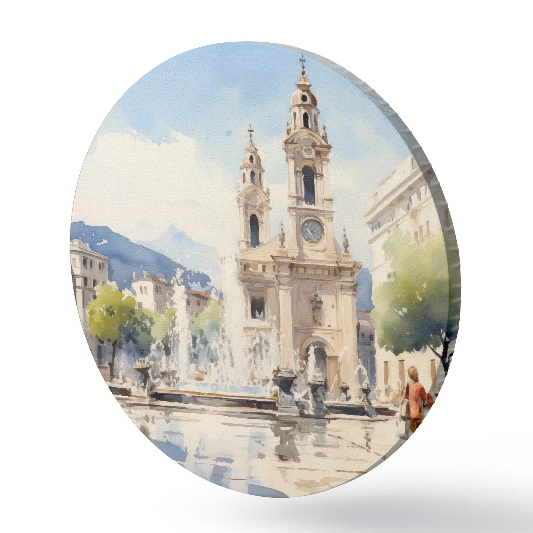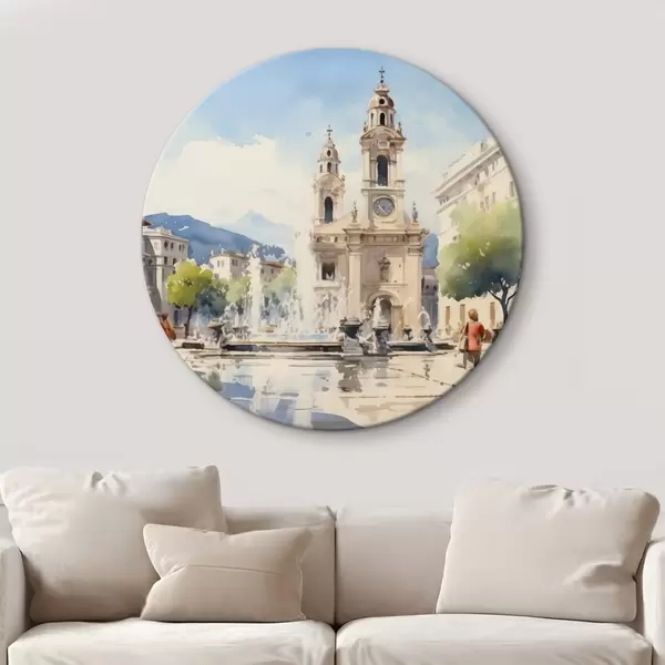 Runde Gemälde Abstrakte Stadtlandschaft mit Turm und Springbrunnen auf einem Stadtplatz, Berge in der Ferne, Aquarellstil r43397