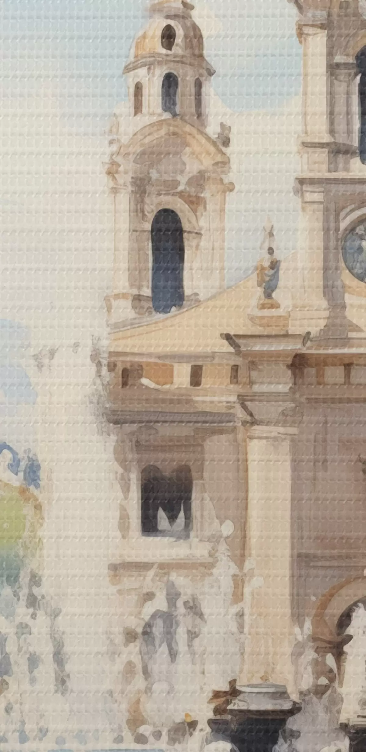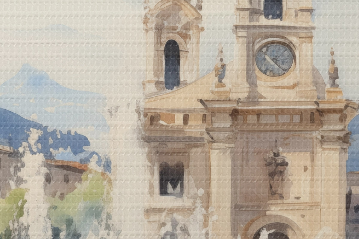 Bild Abstrakte Stadtlandschaft mit Turm und Springbrunnen auf einem Stadtplatz, Berge in der Ferne, Aquarellstil Nr r43397