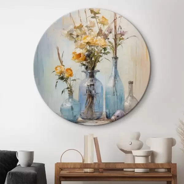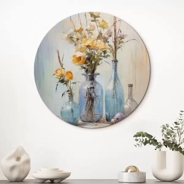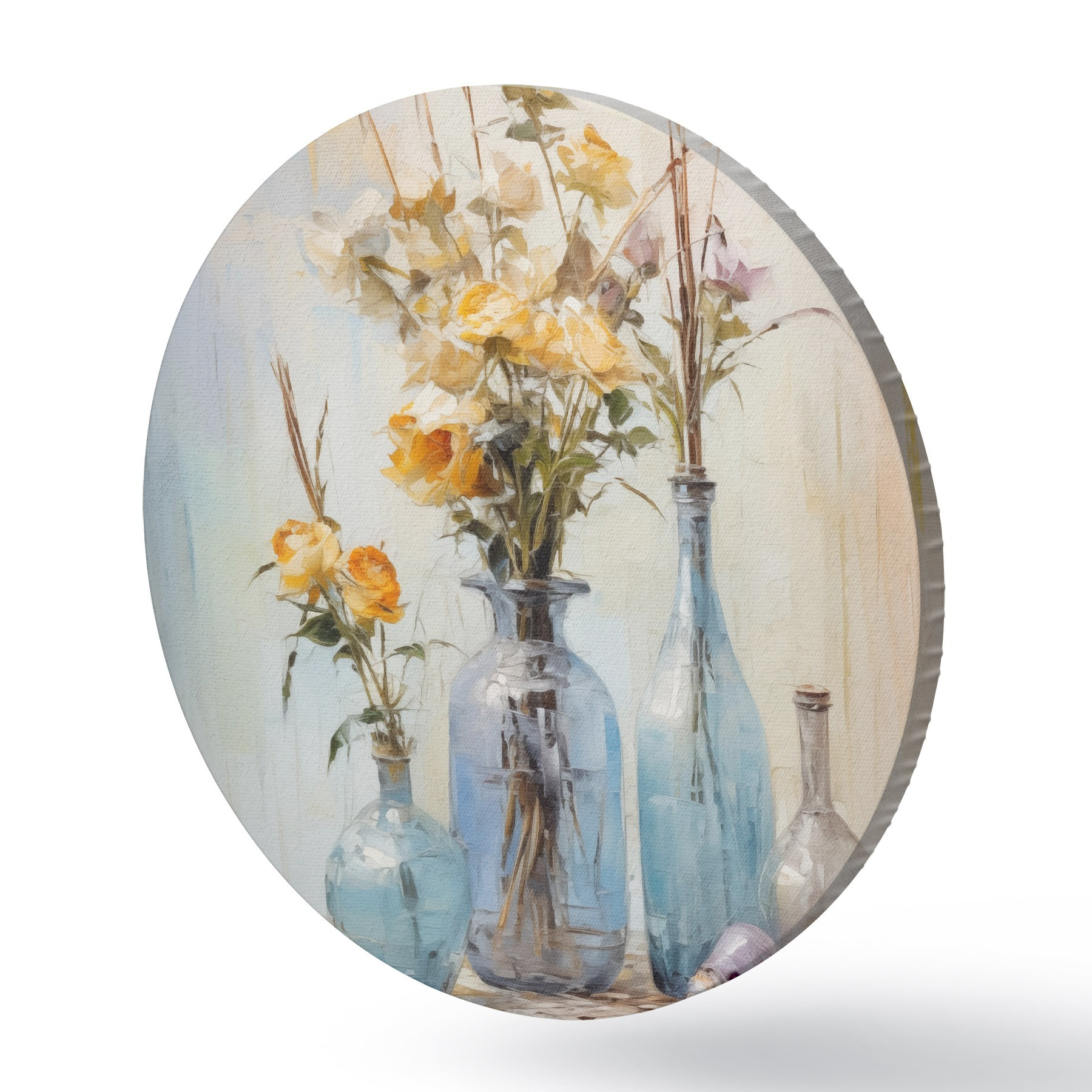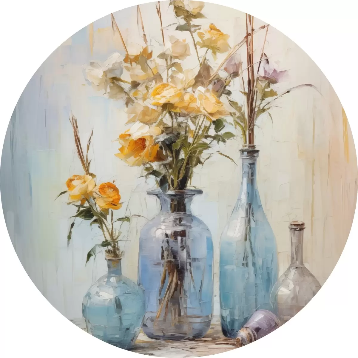 Runde Gemälde Ein Stillleben mit gelben Rosen in blauen Glasvasen, heller strukturierter Hintergrund, weiche Pinselstriche, Ölgemälde-Stil r43409
