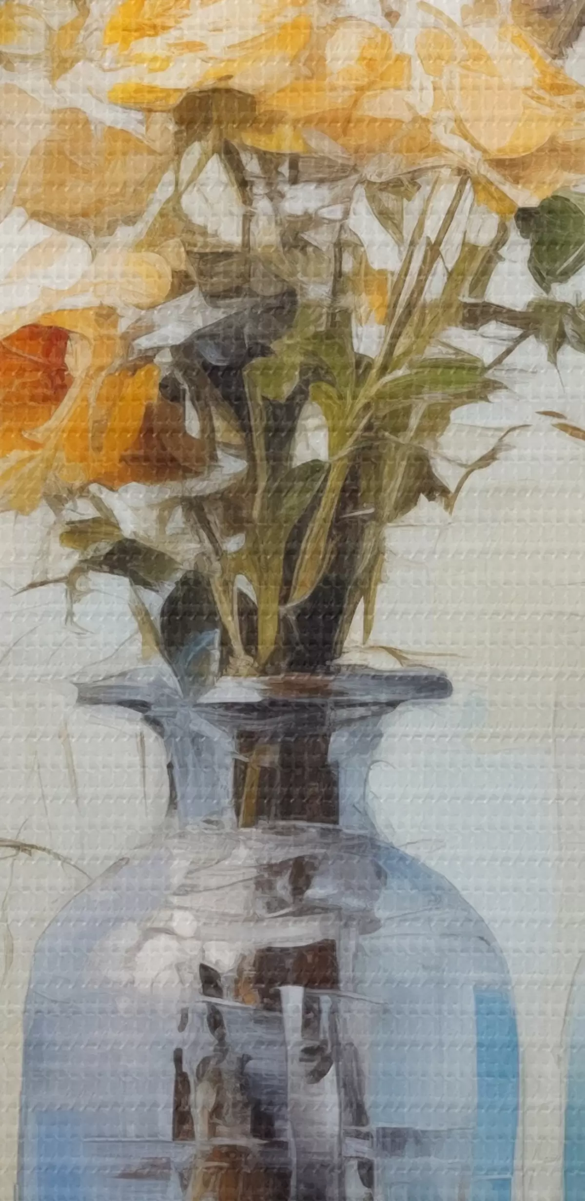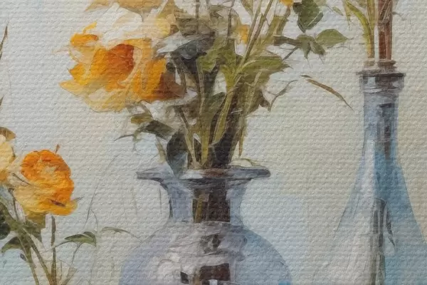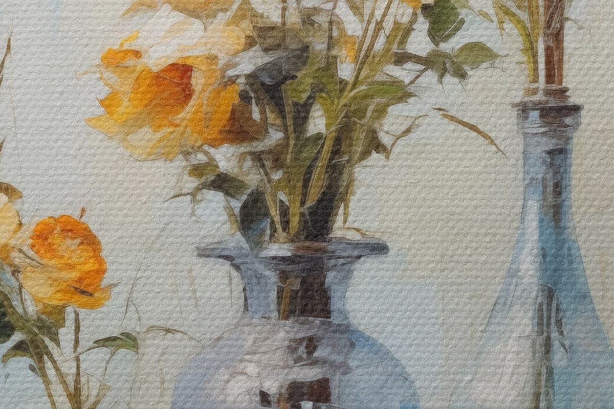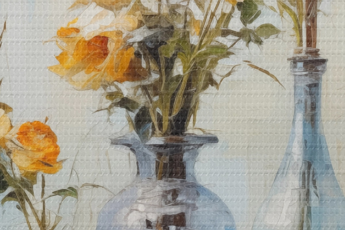 Bild Ein Stillleben mit gelben Rosen in blauen Glasvasen, heller strukturierter Hintergrund, weiche Pinselstriche, Ölgemälde-Stil Nr r43409