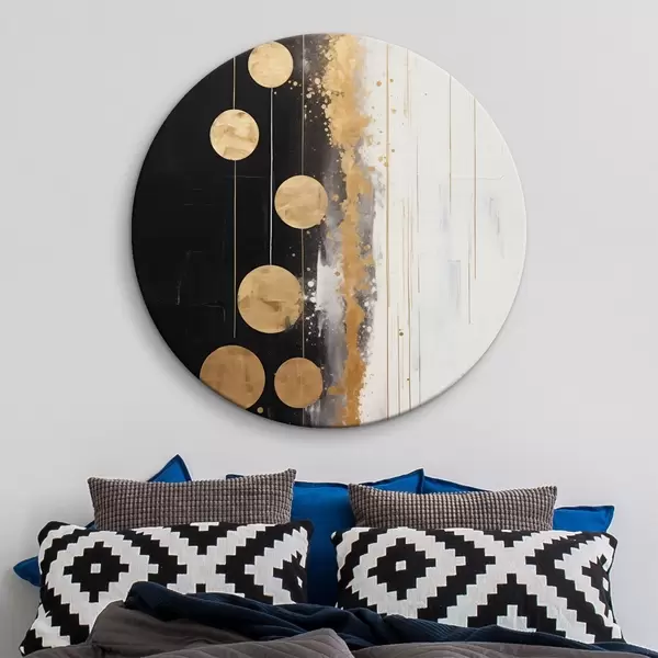 Runde Gemälde Abstrakte Kunst mit gelben Kreisen auf schwarzem und weißem Hintergrund mit weißen und gelben Flecken hängen r43410
