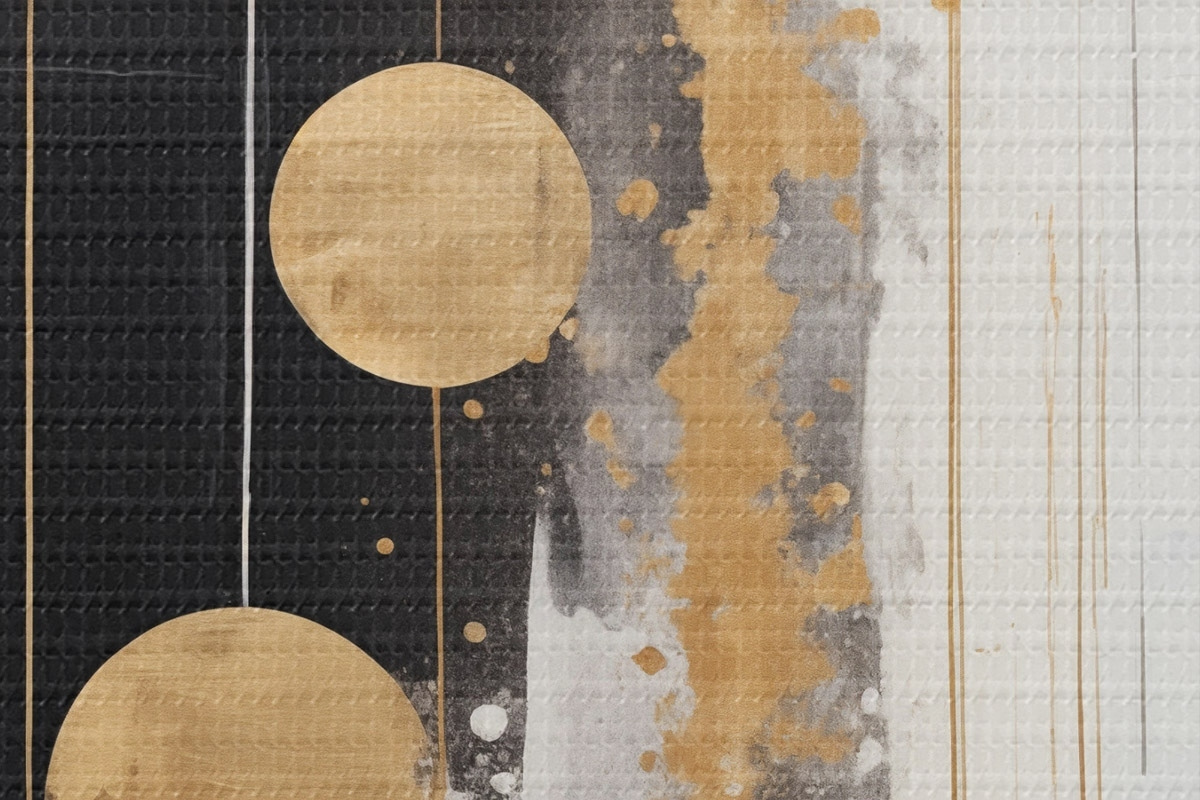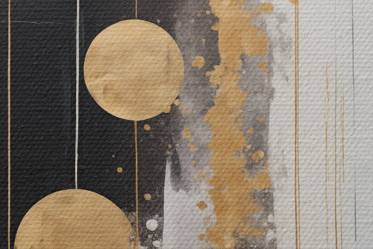 Bild Abstrakte Kunst mit gelben Kreisen auf schwarzem und weißem Hintergrund mit weißen und gelben Flecken hängen Nr r43410